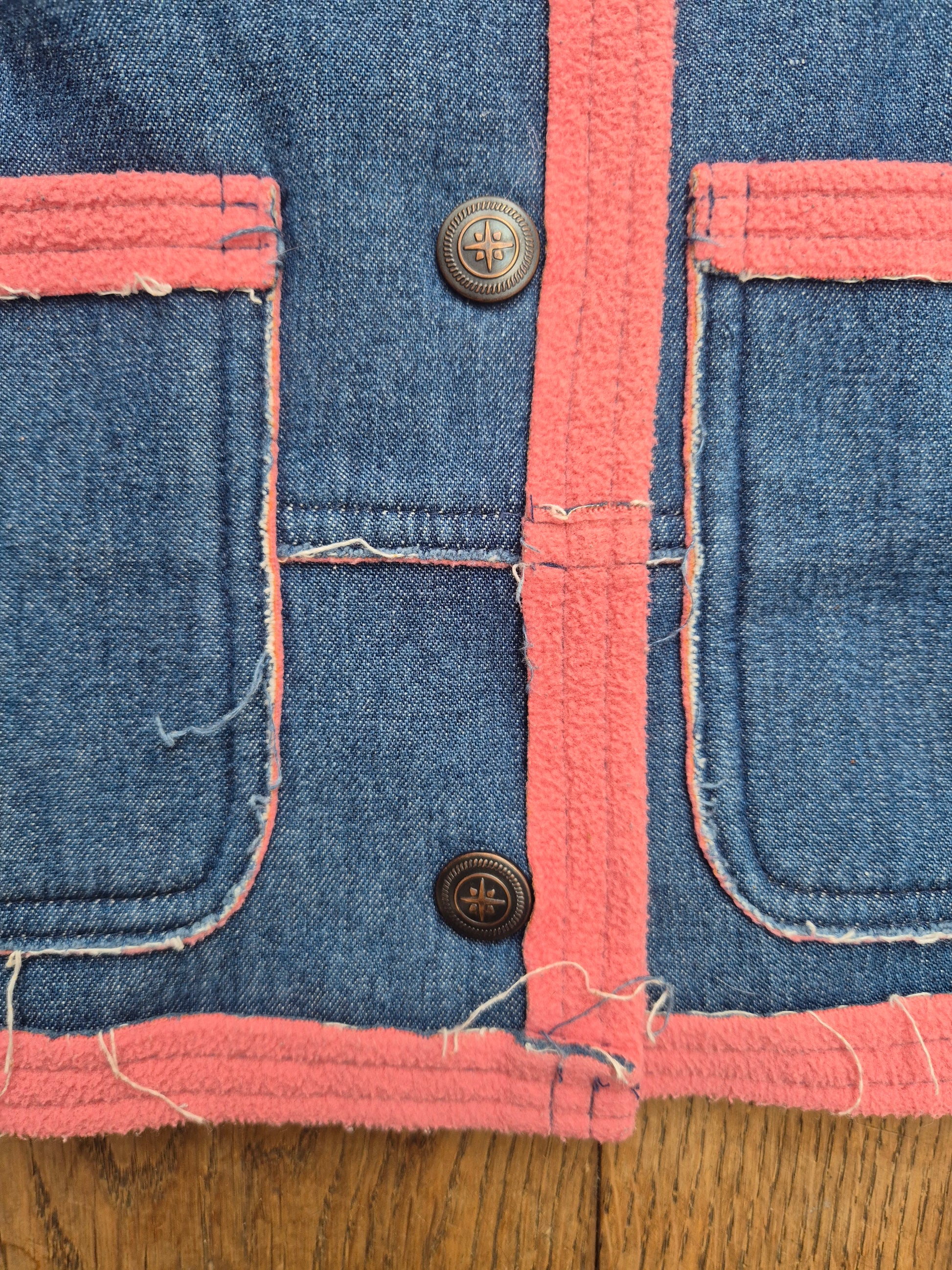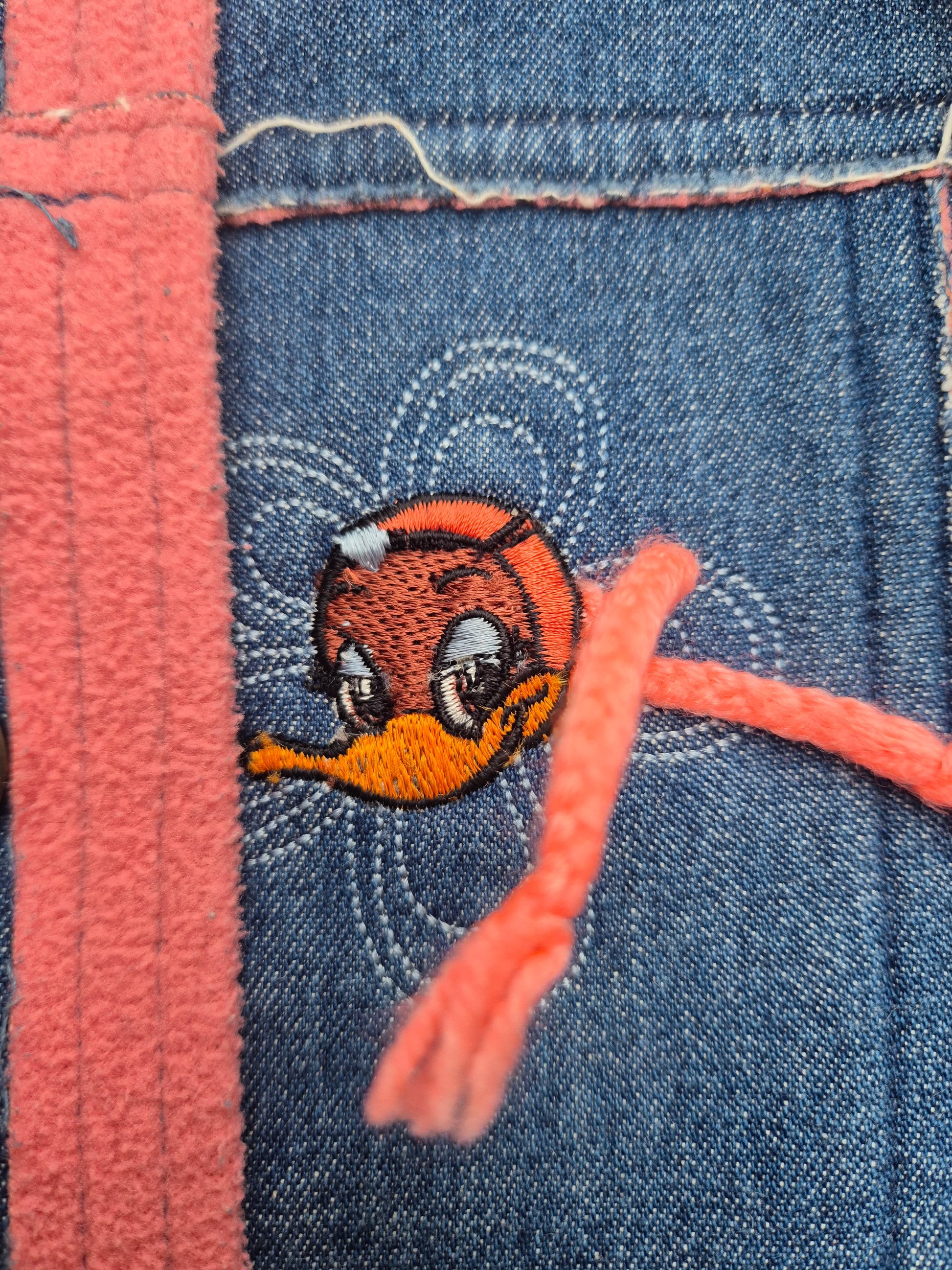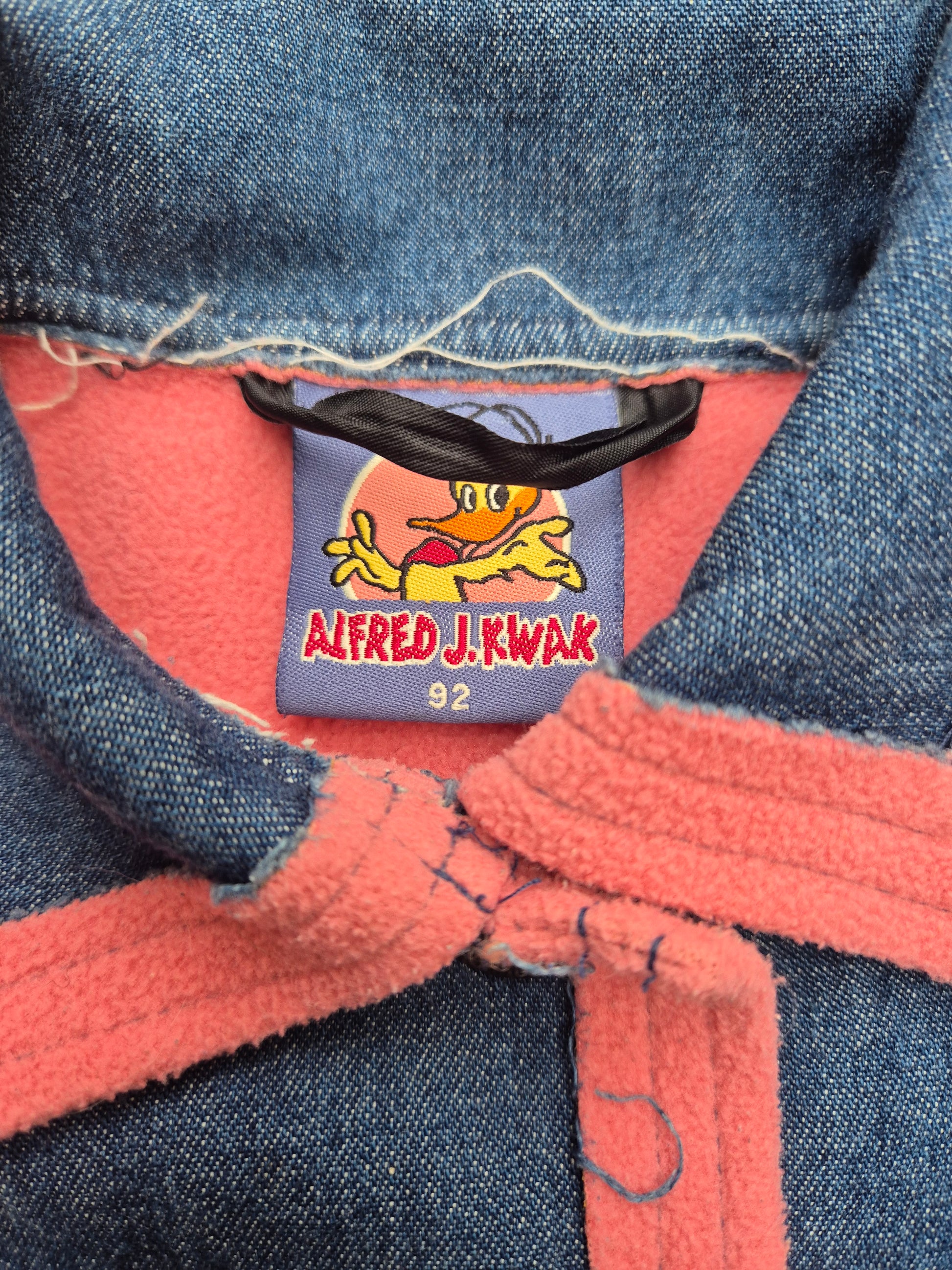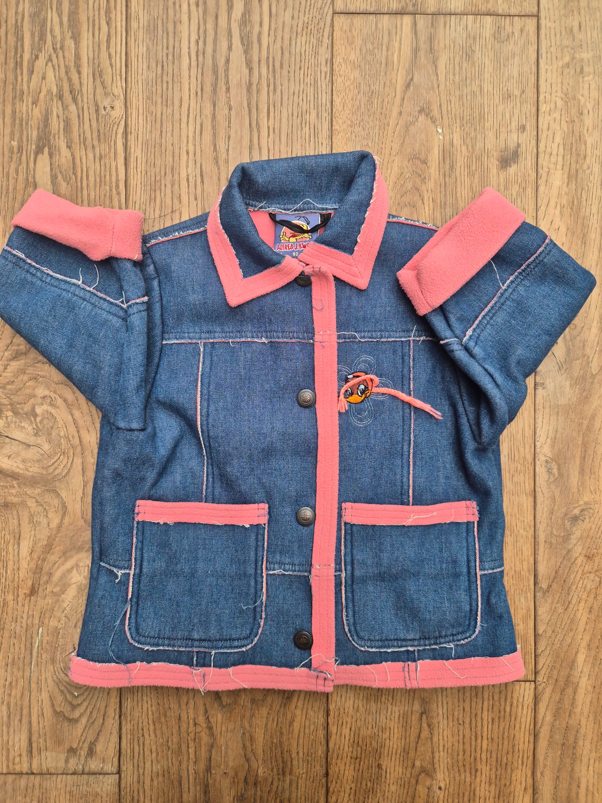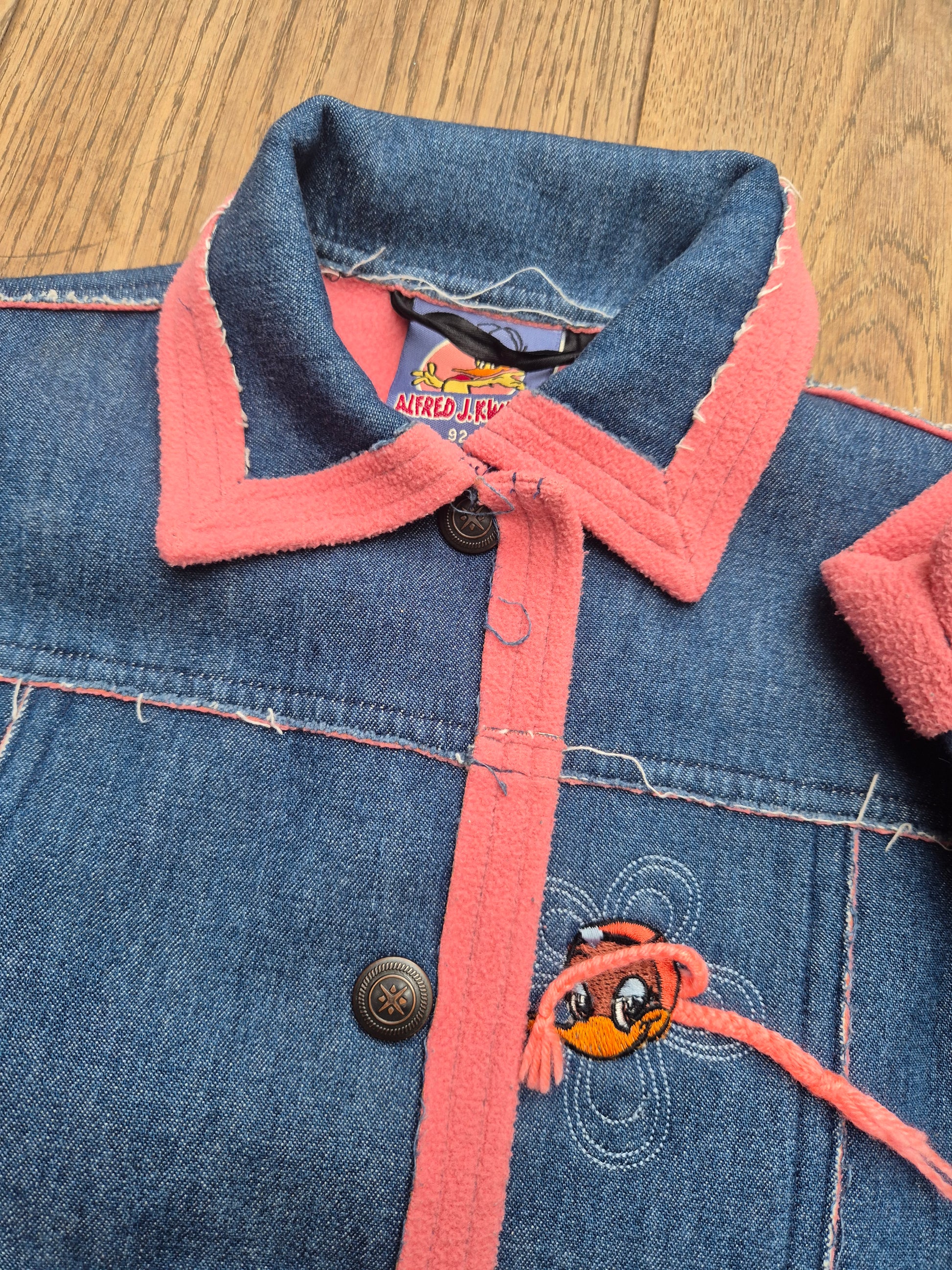 Een uniek Alfred J Kwak vintage denim jasje met roze fleece accenten. Stoer, zacht en helemaal 90s vibes. Met grote zakken en speels borduurtje aan de voorkant.