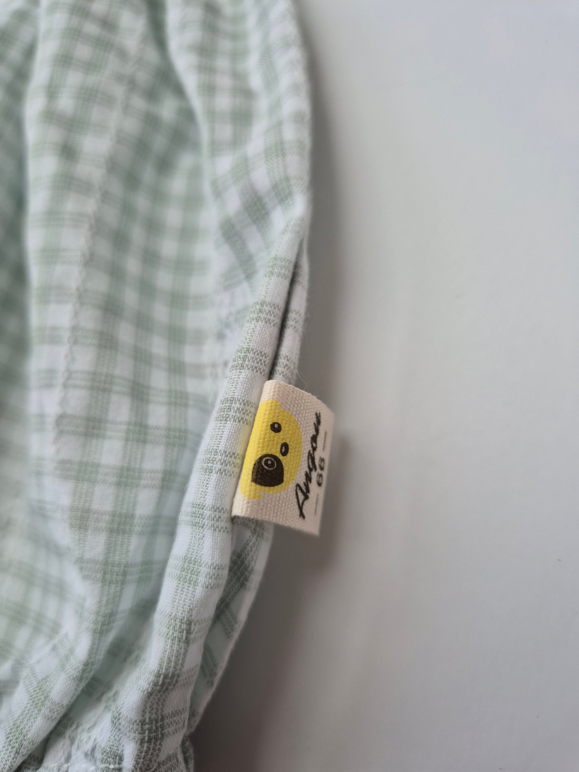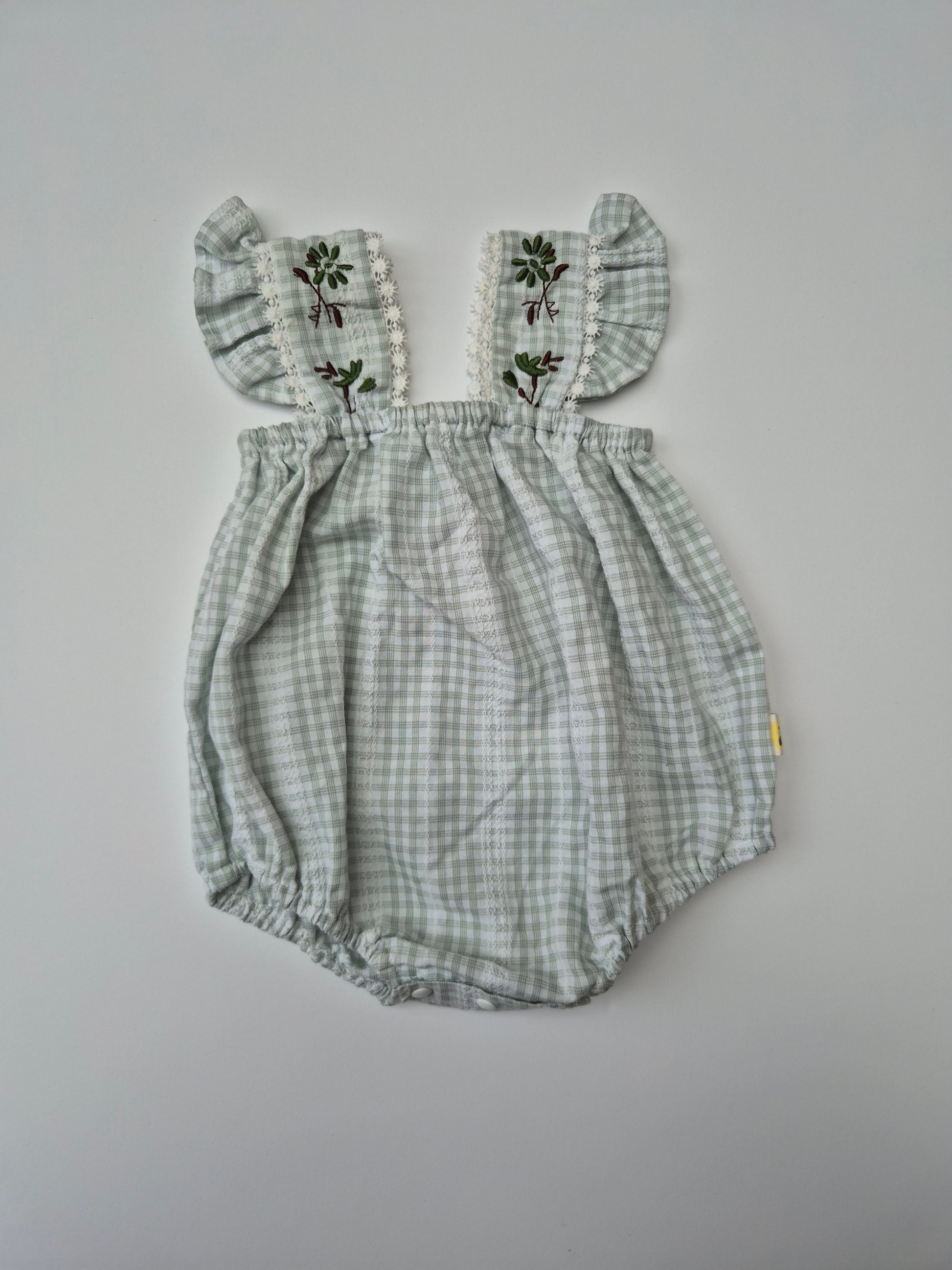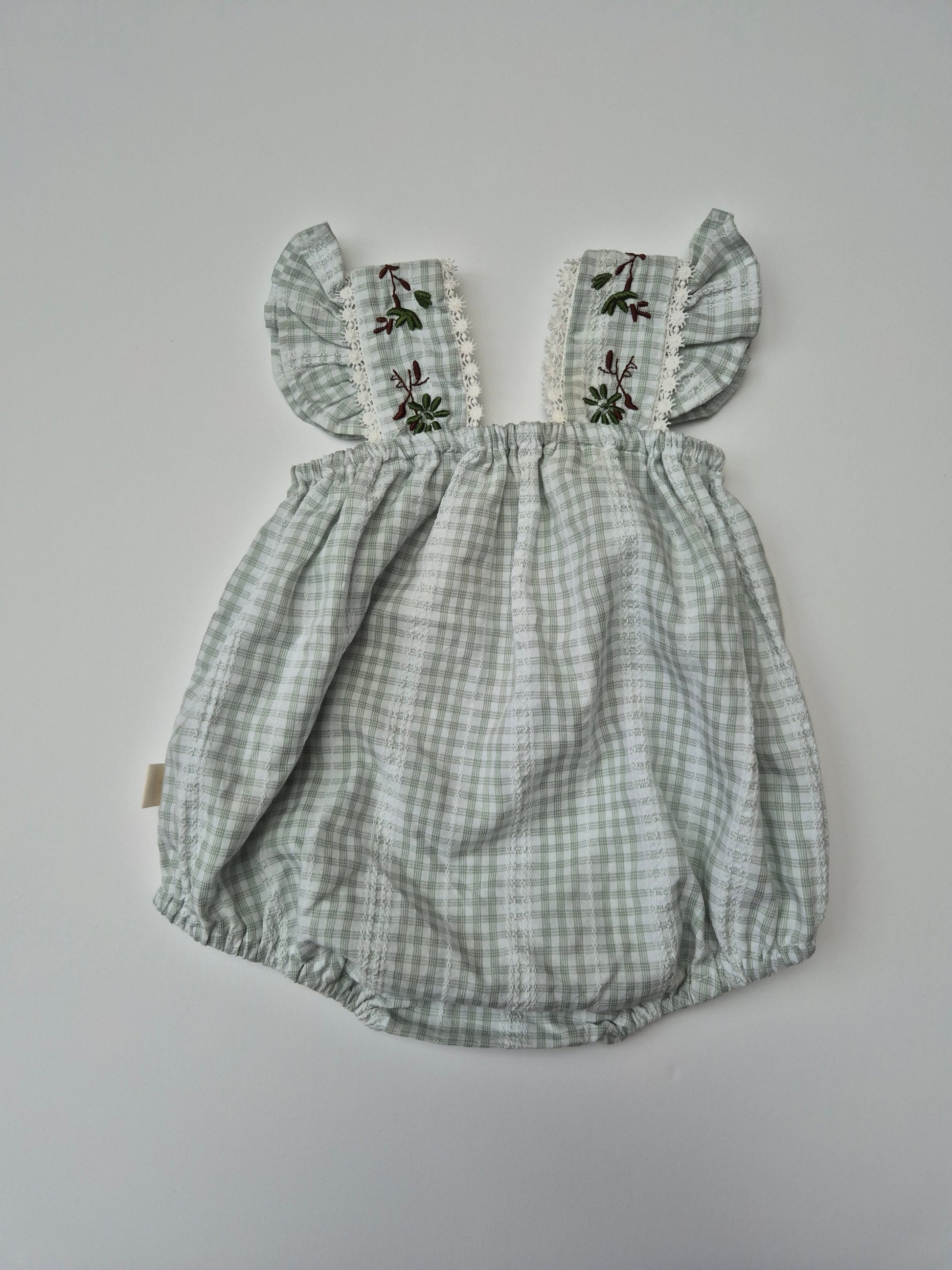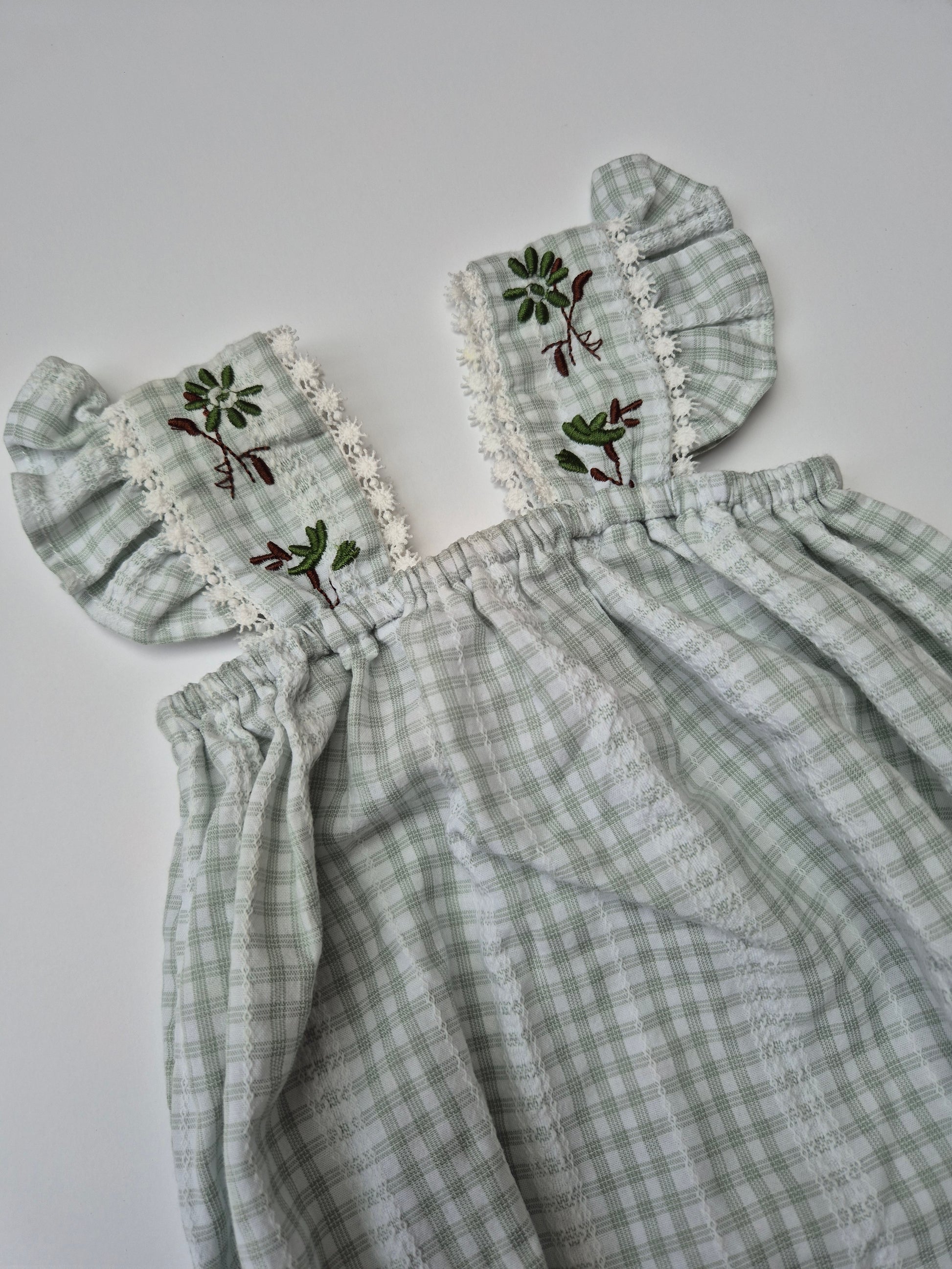 Zachtgroen geruite pakje met geborduurde bloemetjes op de bandjes.