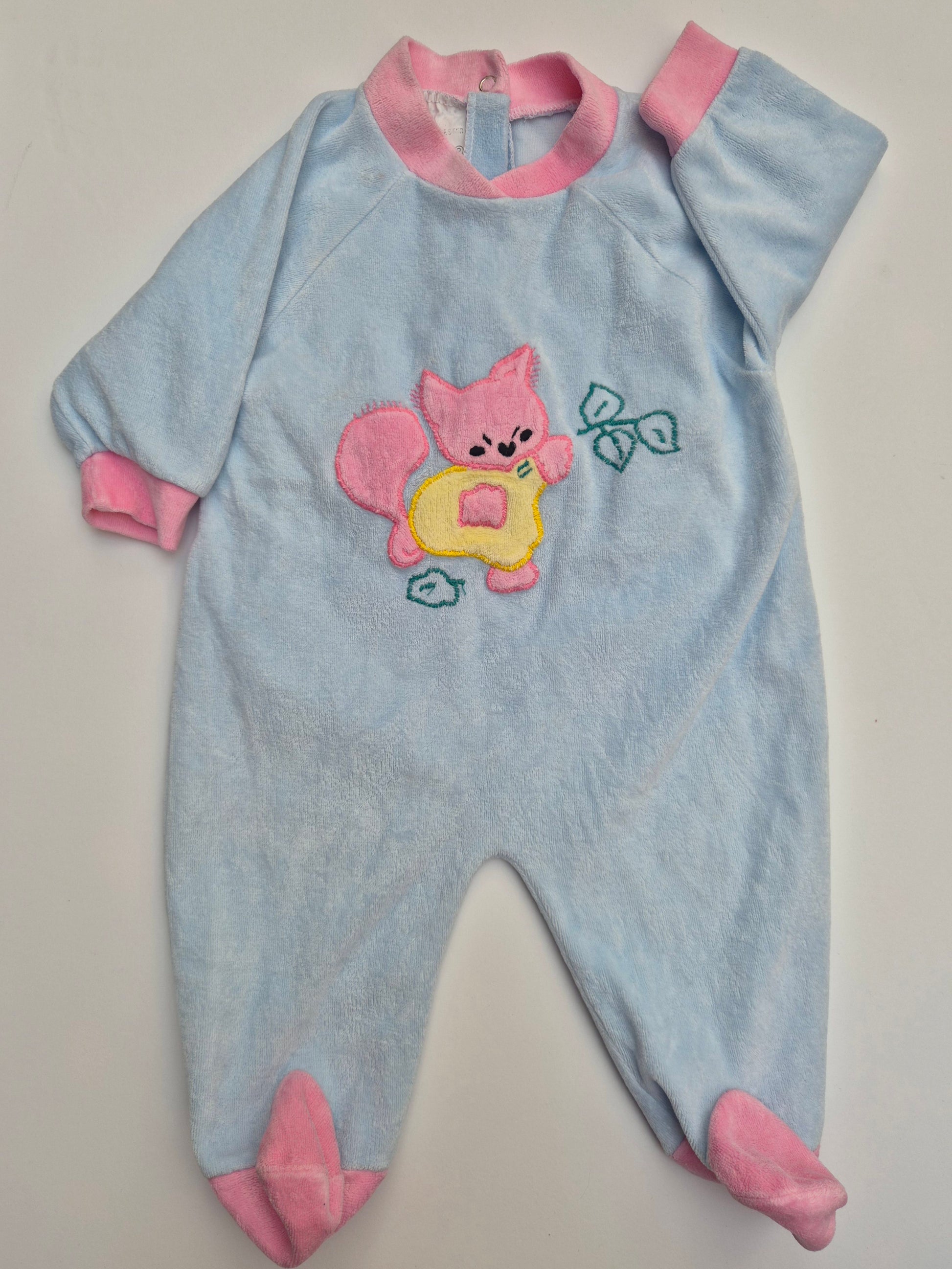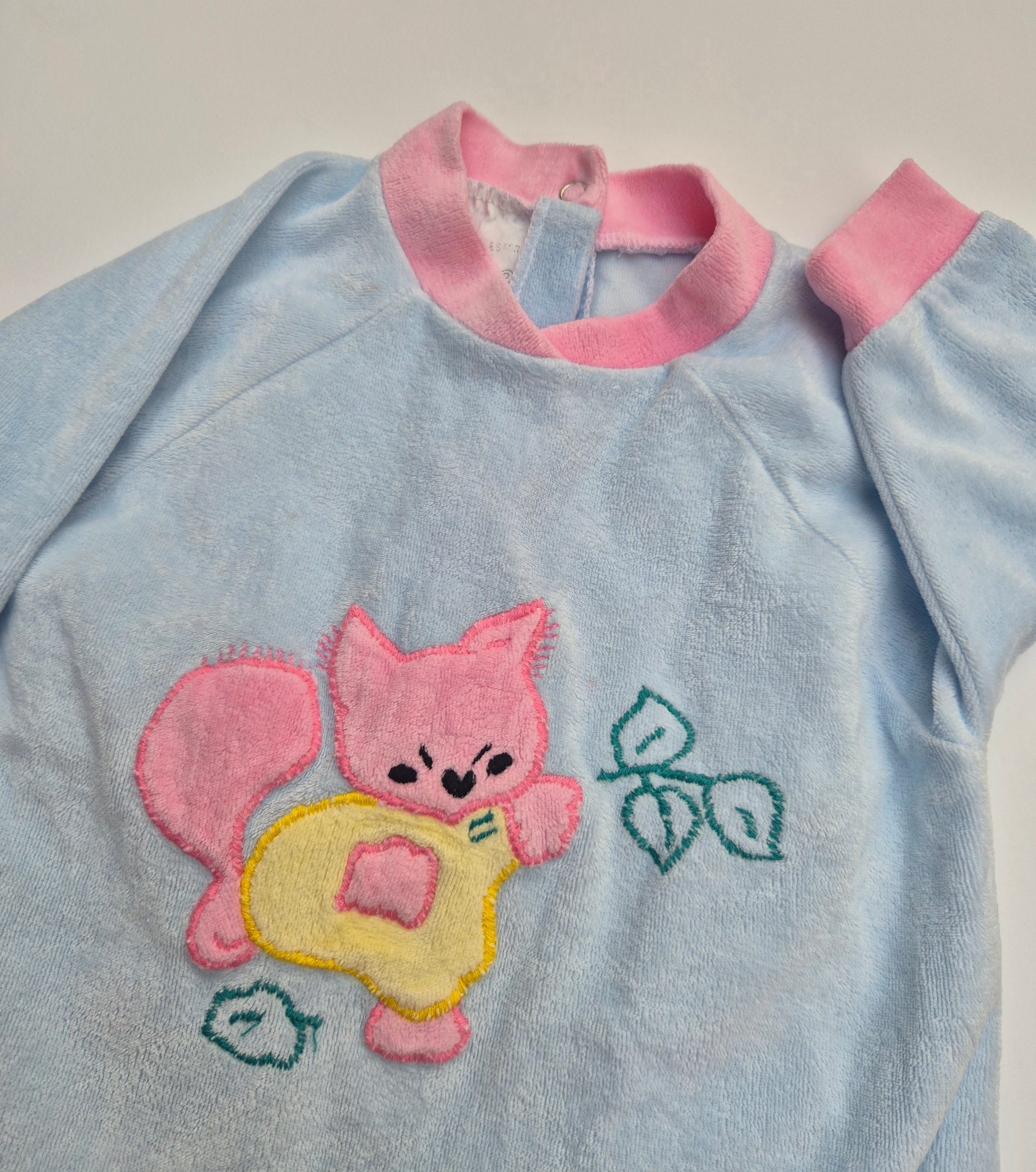Zacht blauw boxpakje met een grote eekhoorn op de voorkant. Handige drukknoopjes sluiting aan de achterkant.