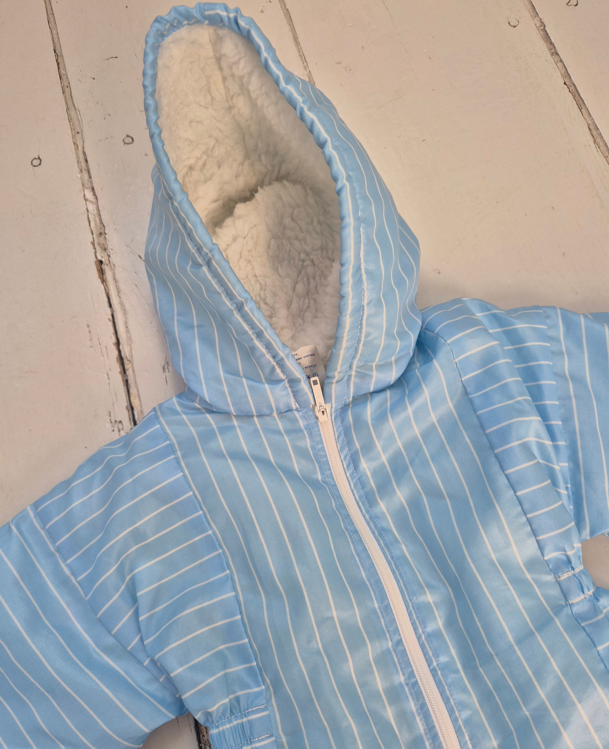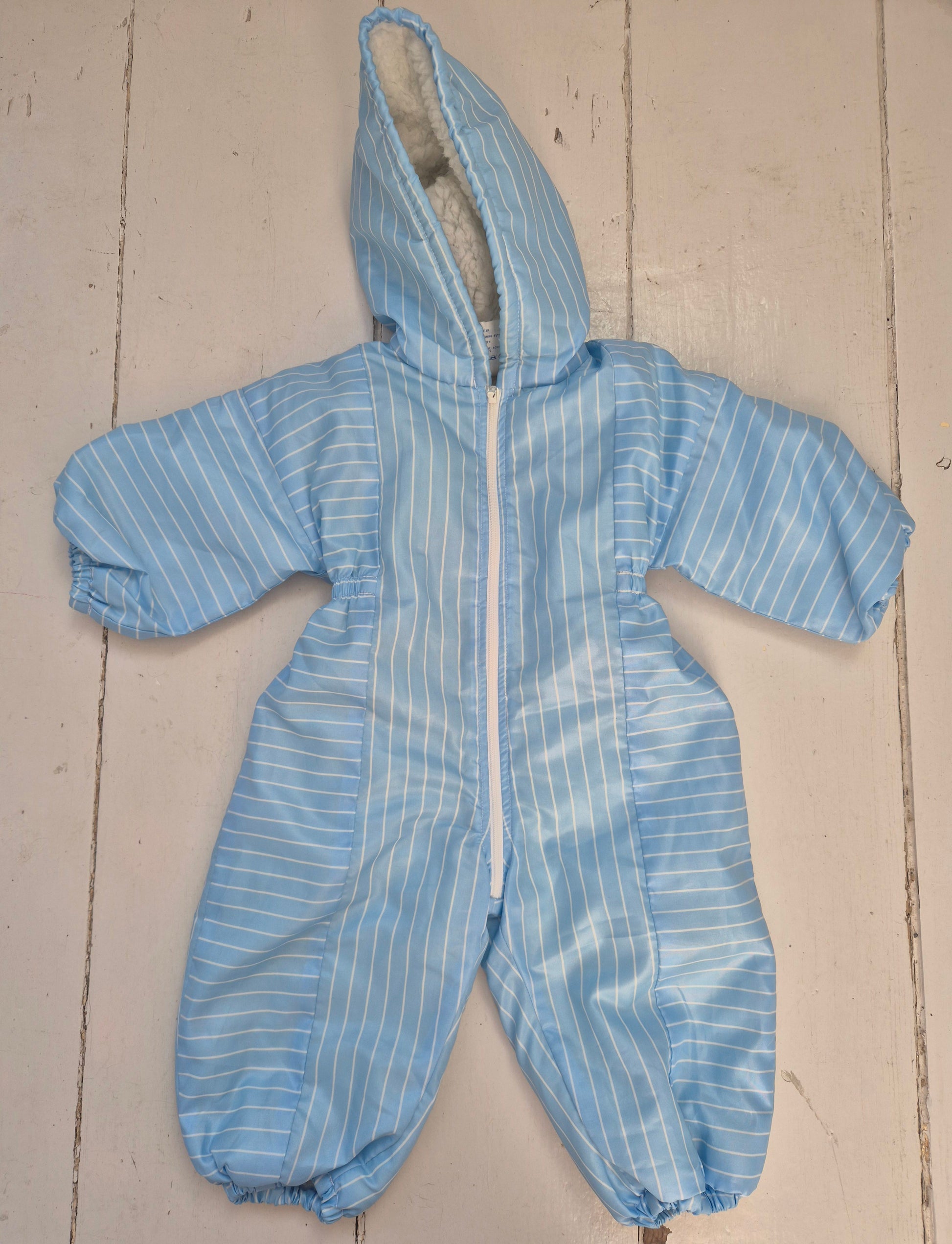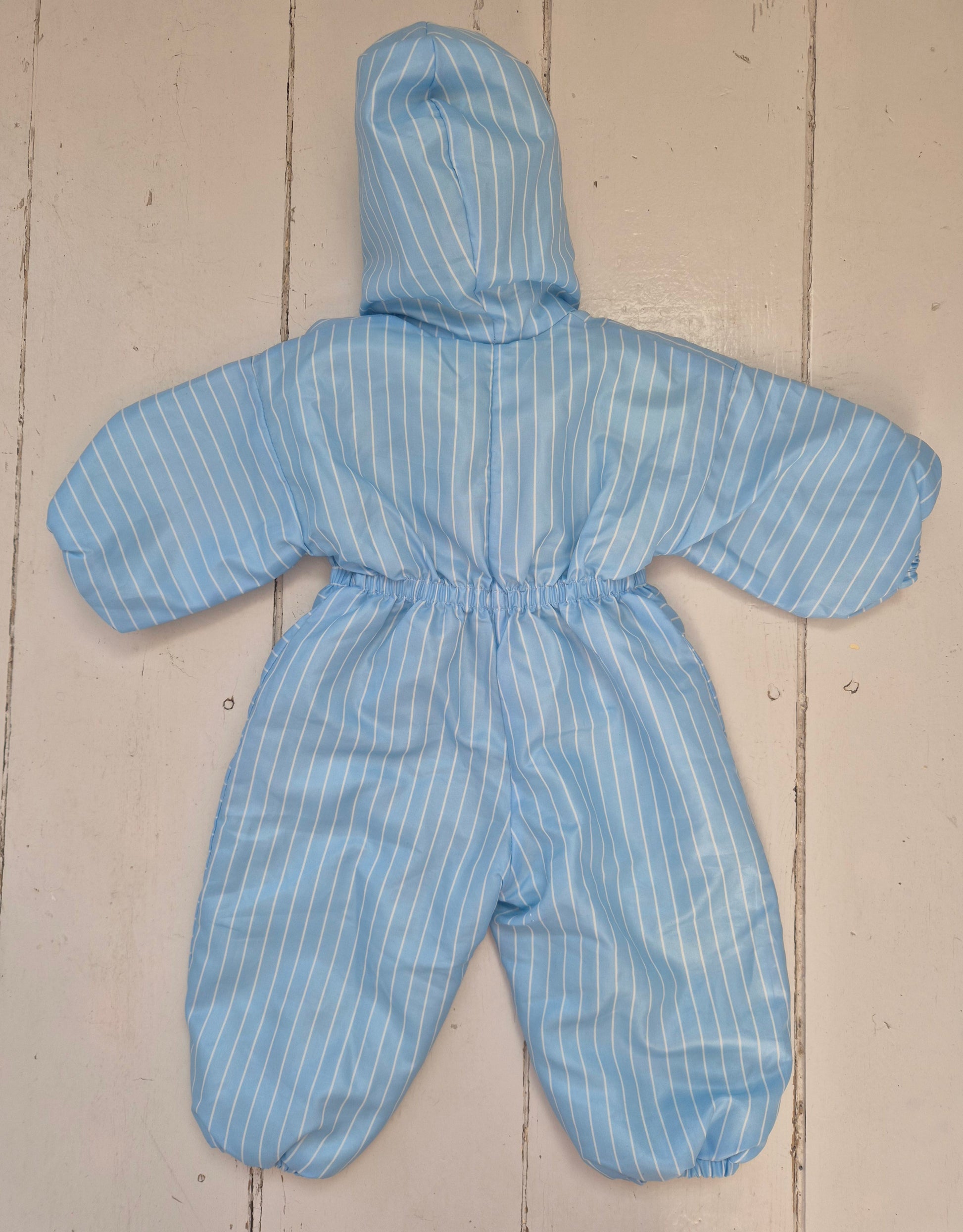 Knus vintage skipak in lichtblauw met witte strepen. Met zachte voering en handige rits, perfect voor koude dagen buiten.