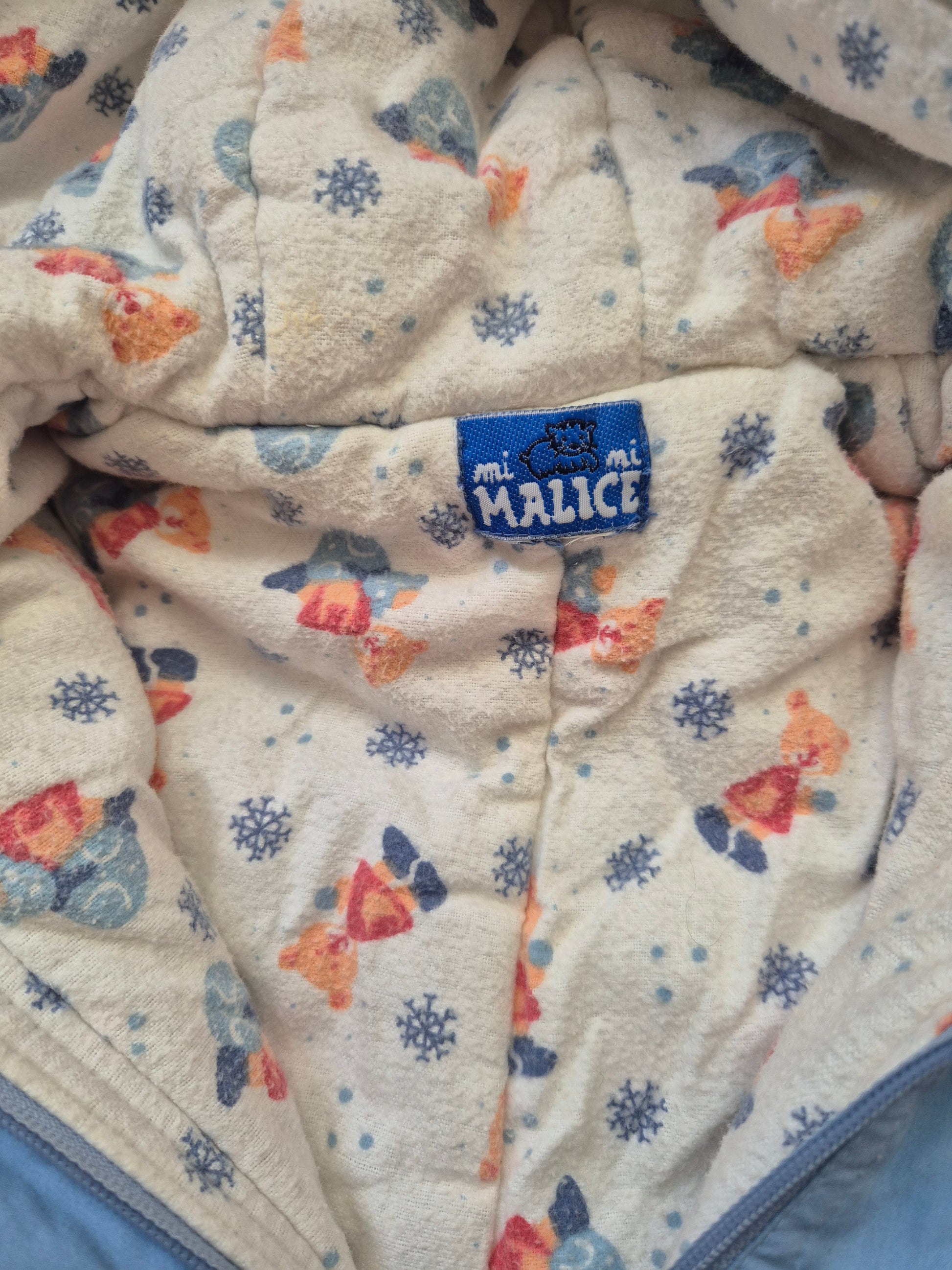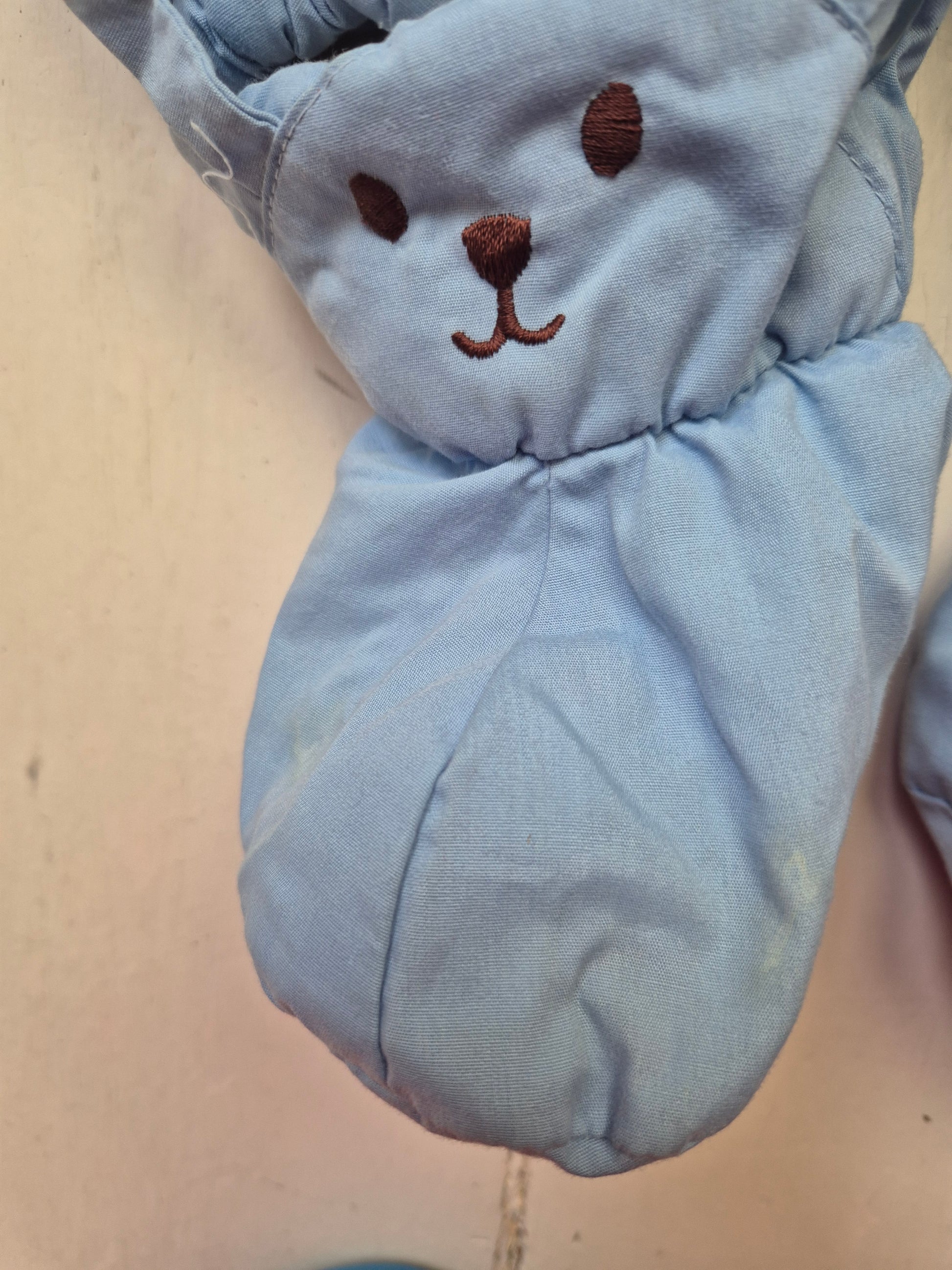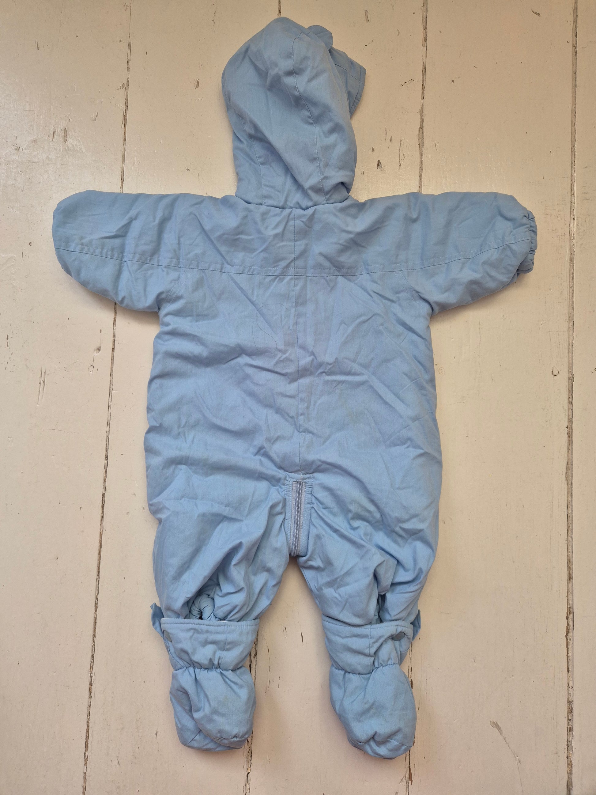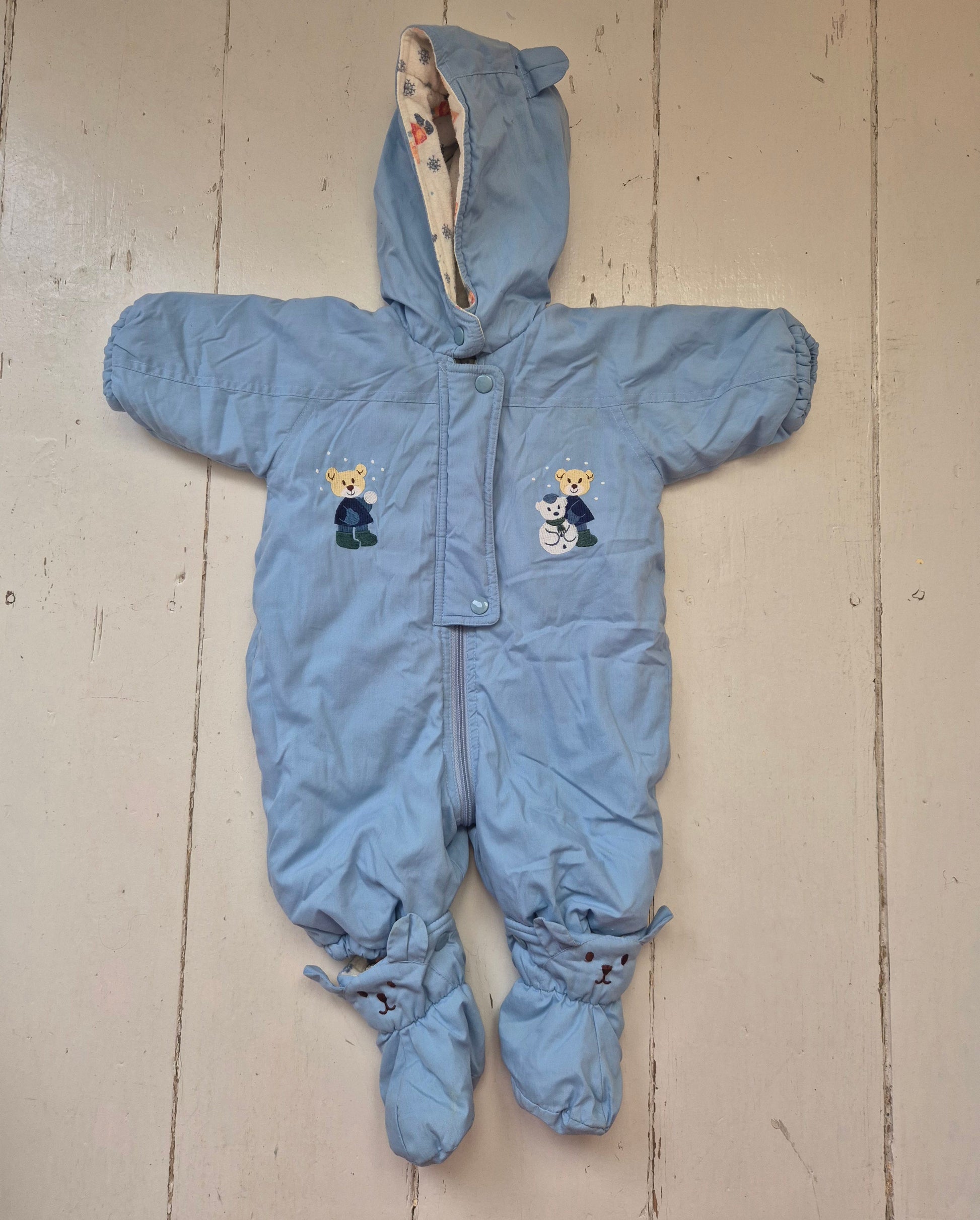Lief vintage skipak in zachtblauw met geborduurde beertjes op de borst en voetjes in de vorm van kleine konijntjes. Met capuchon en drukknoopjes, superhandig en onweerstaanbaar schattig.
