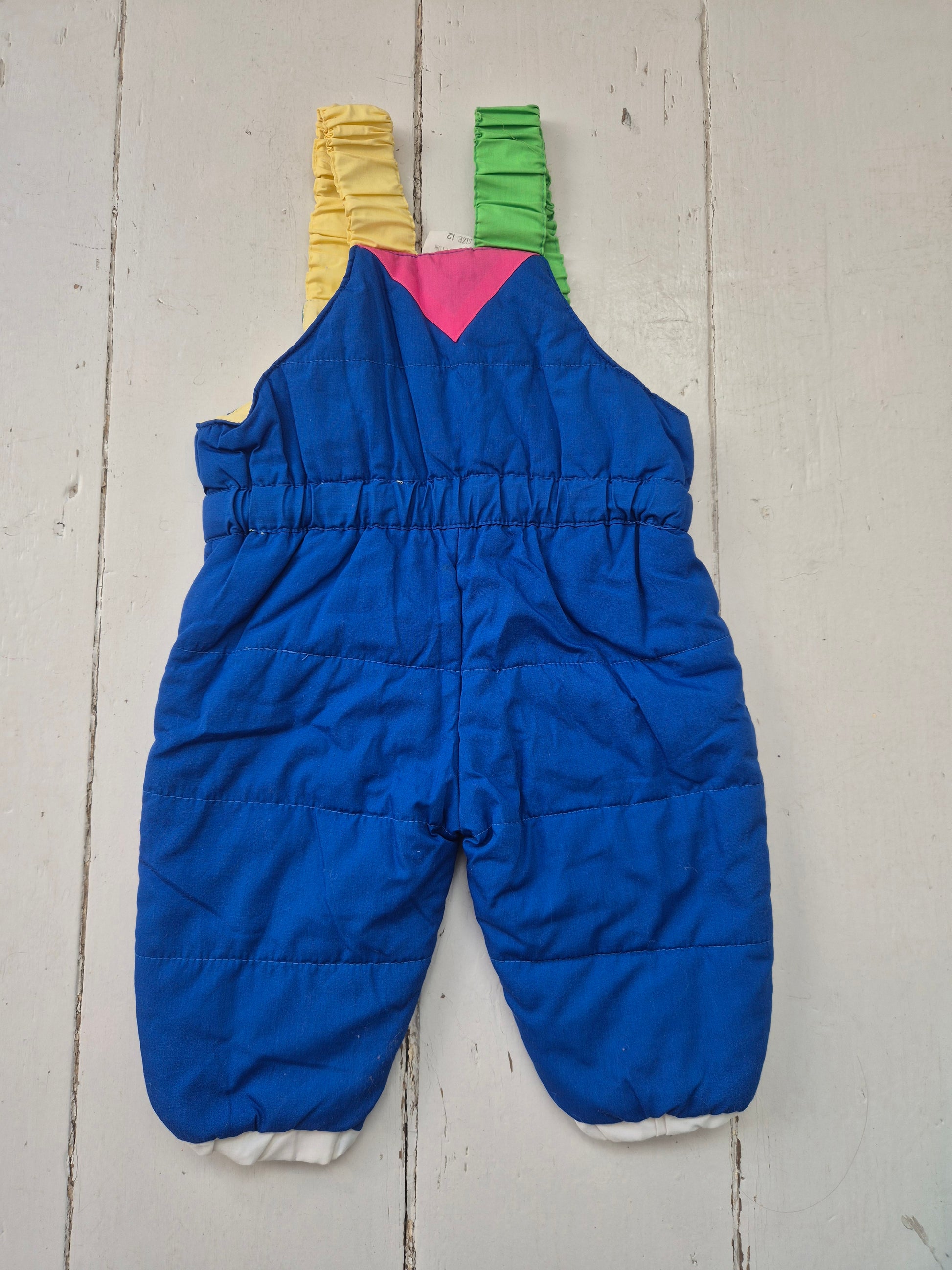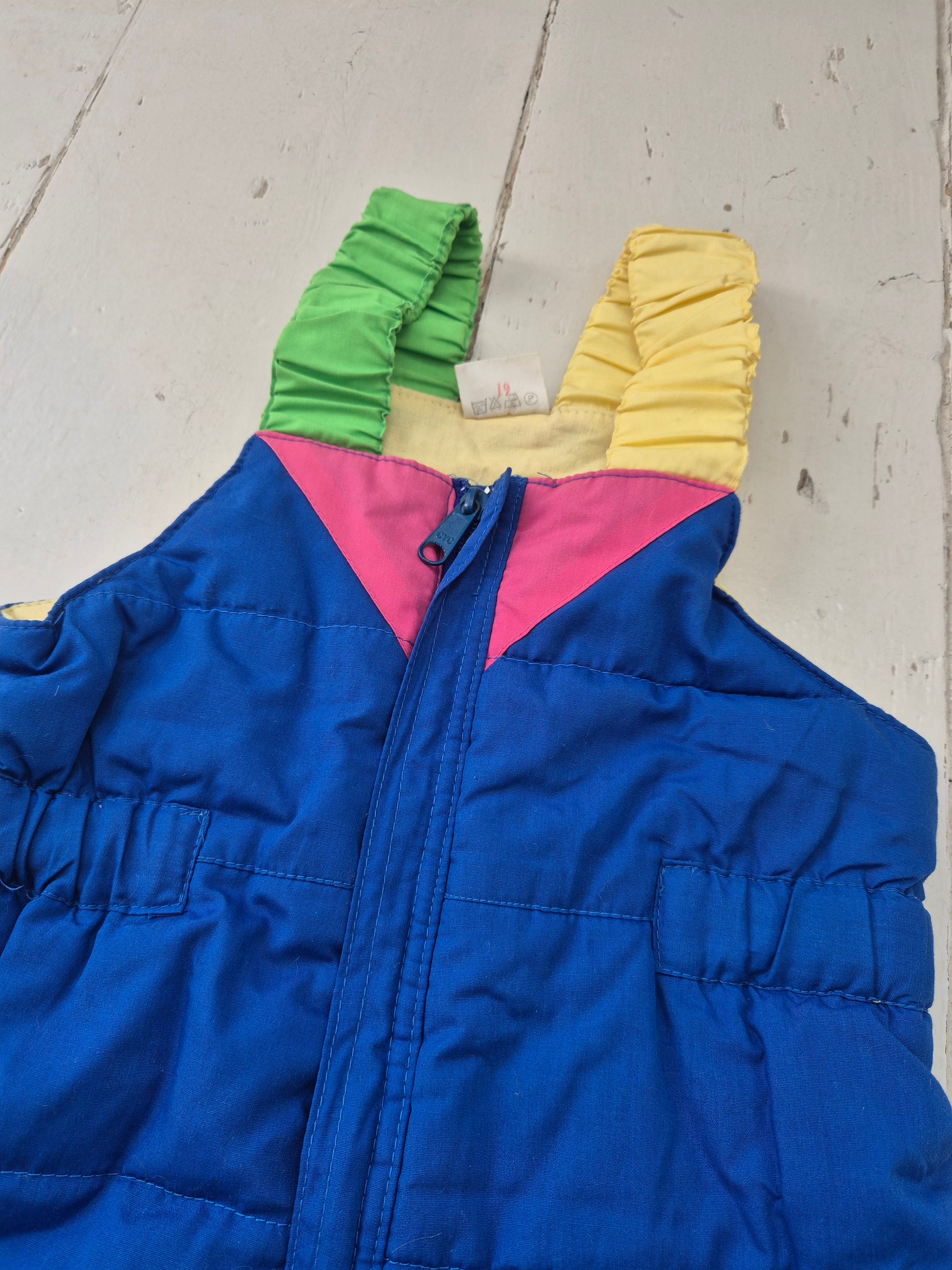 Opvallend skipak met gekleurde schouderbandjes. Zacht gevoerd en heerlijk vrolijk voor koude dagen om buiten te spelen of echt te wintersporten. Handige drukknoopjes om de broek open te maken.