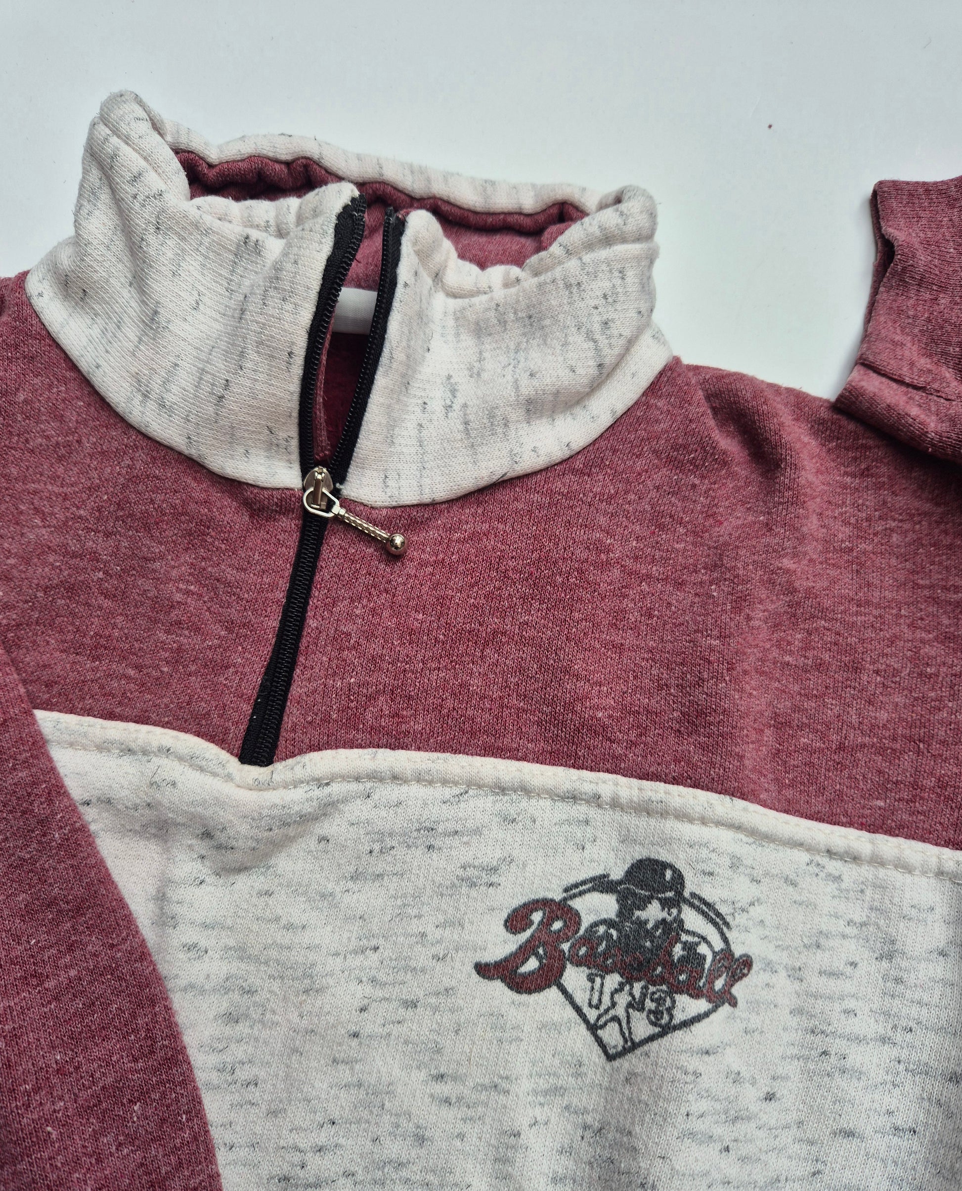 Sportieve trui met halve rits en witte middenbaan. Zachte vintage feel met baseball-vibe.