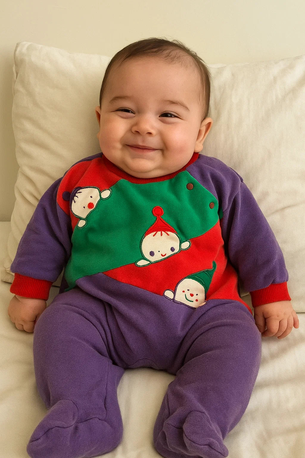 Heerlijk speelpak/boxpakje met vrolijke gezichtjes en felle kleurenblokken.