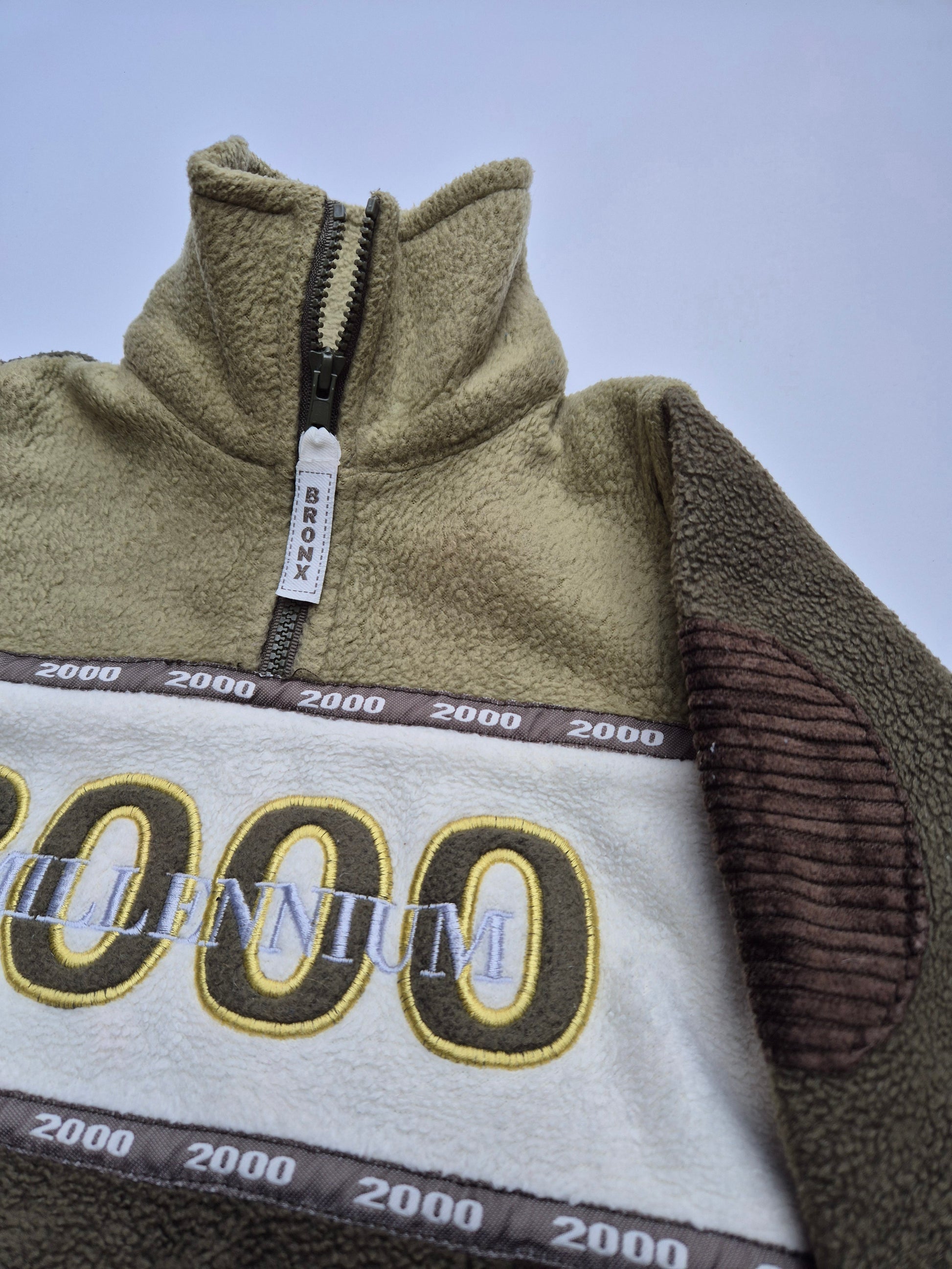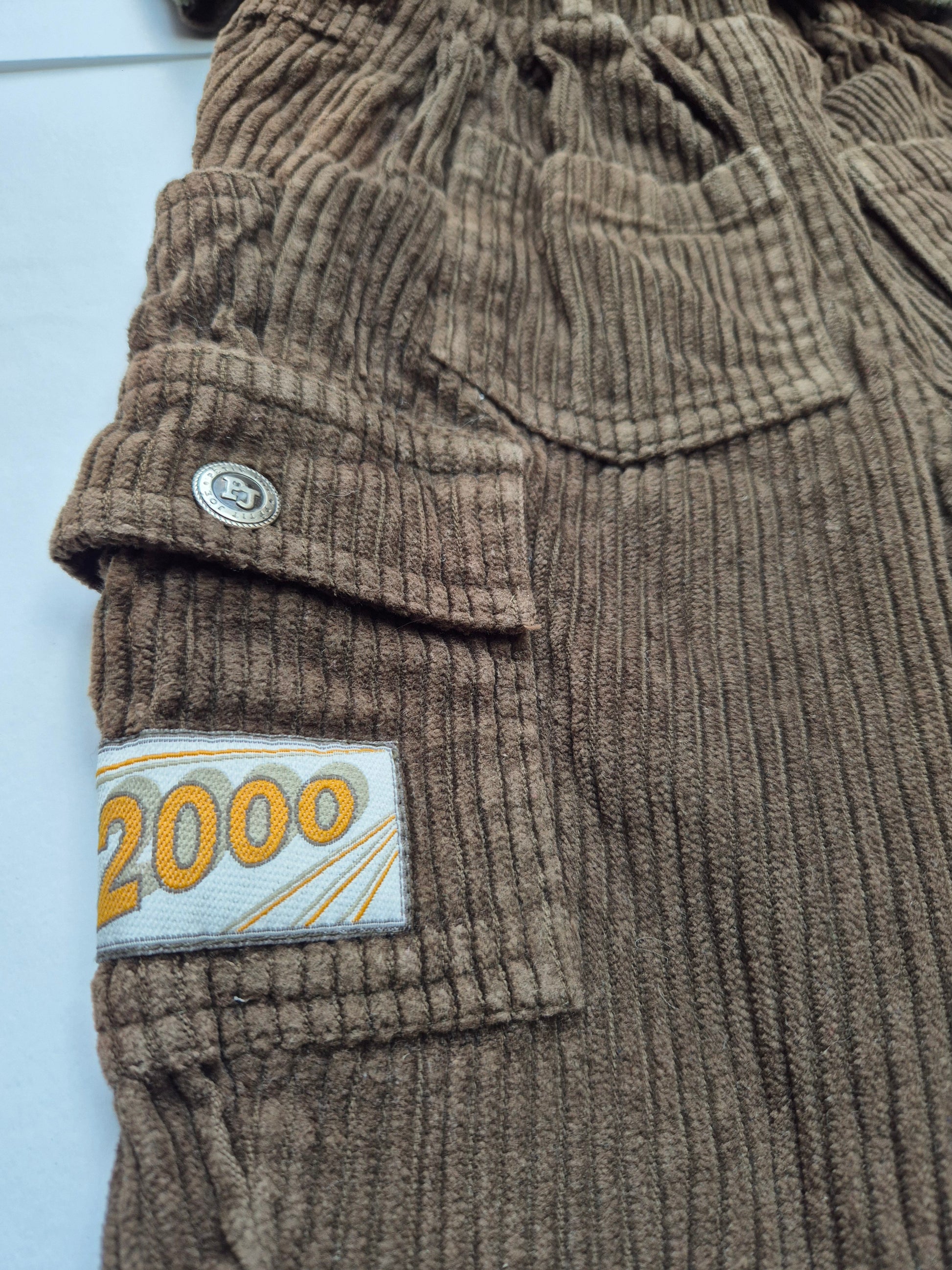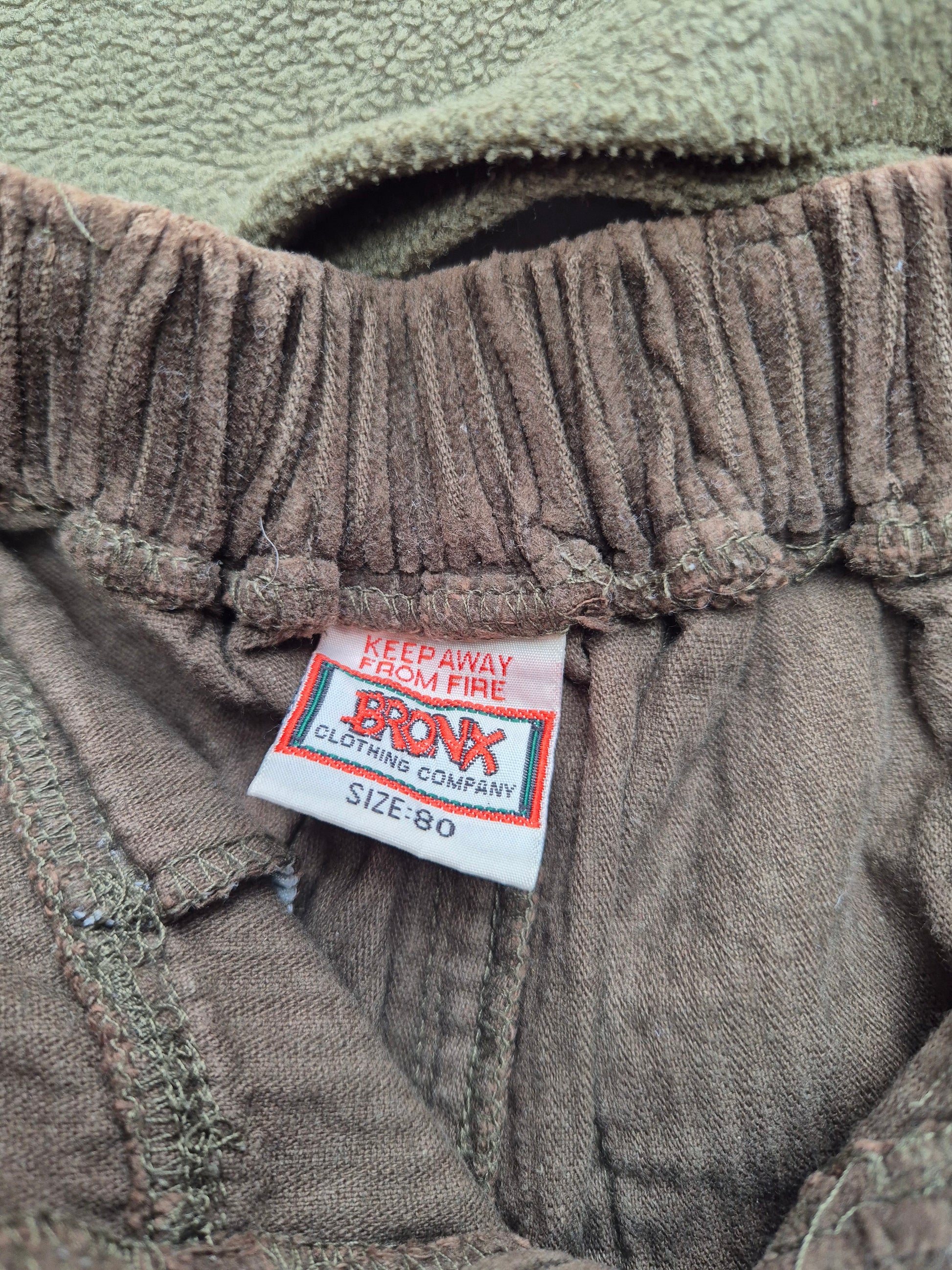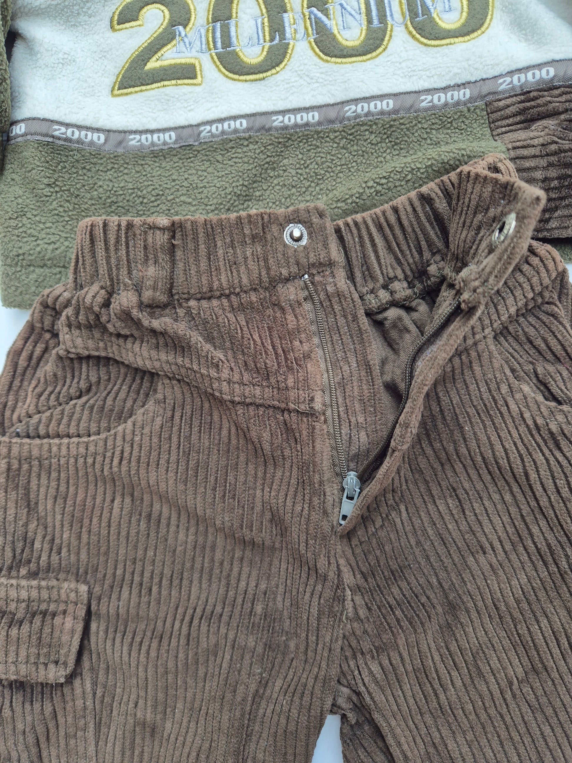 Deze millenniumset uit het jaar 2000 is een vintage pareltje! De fleece trui met opdruk en corduroy cargo broek maken samen een stoere en comfortabele outfit voor frisse dagen.