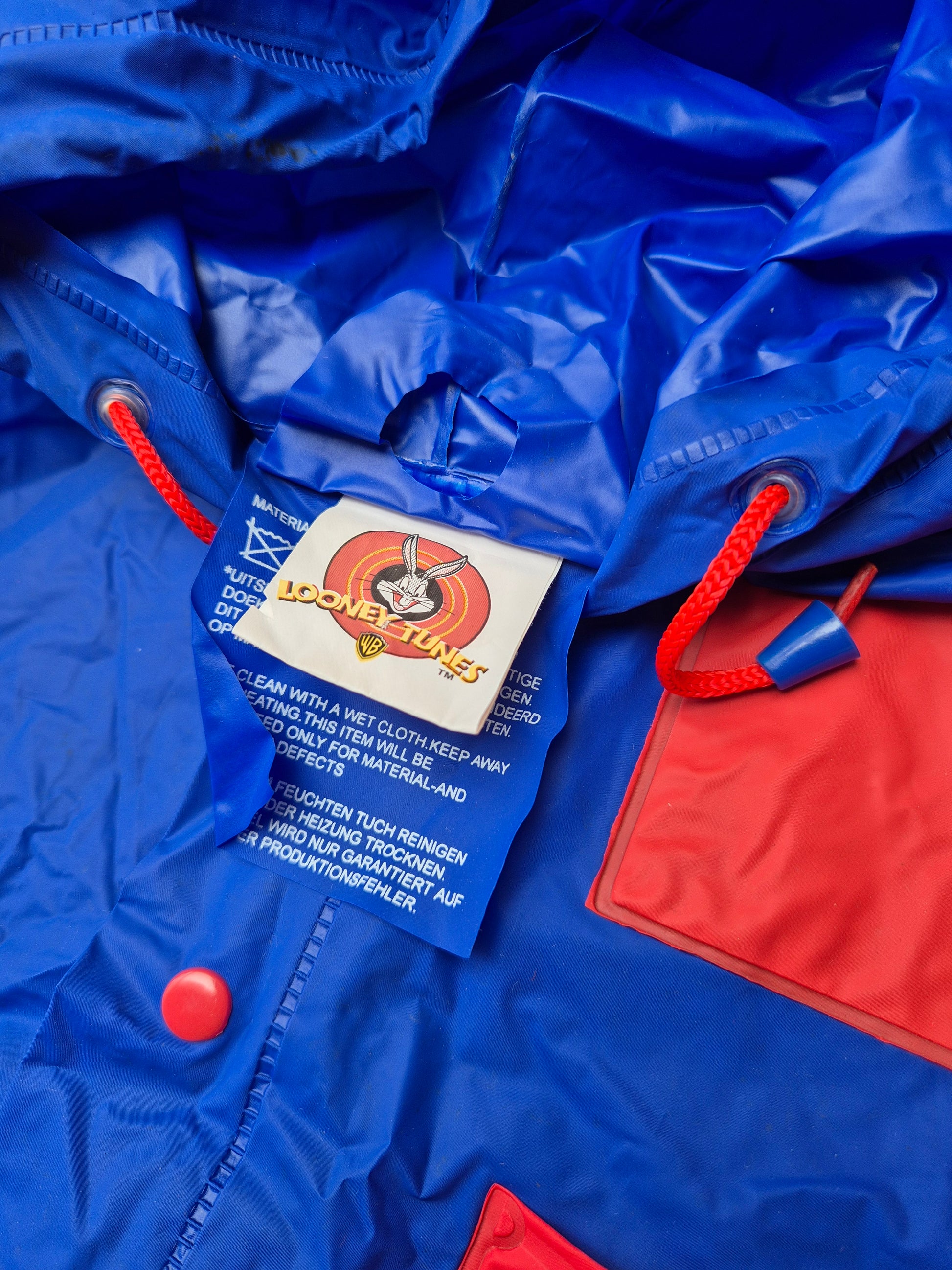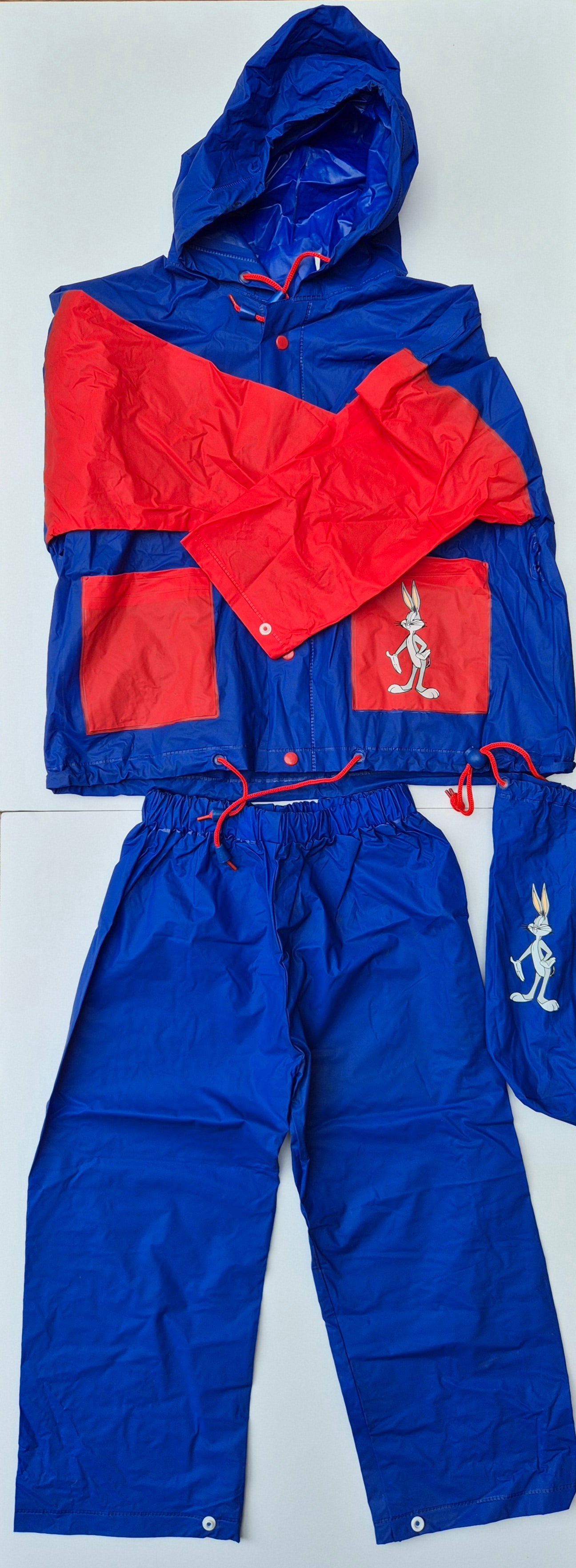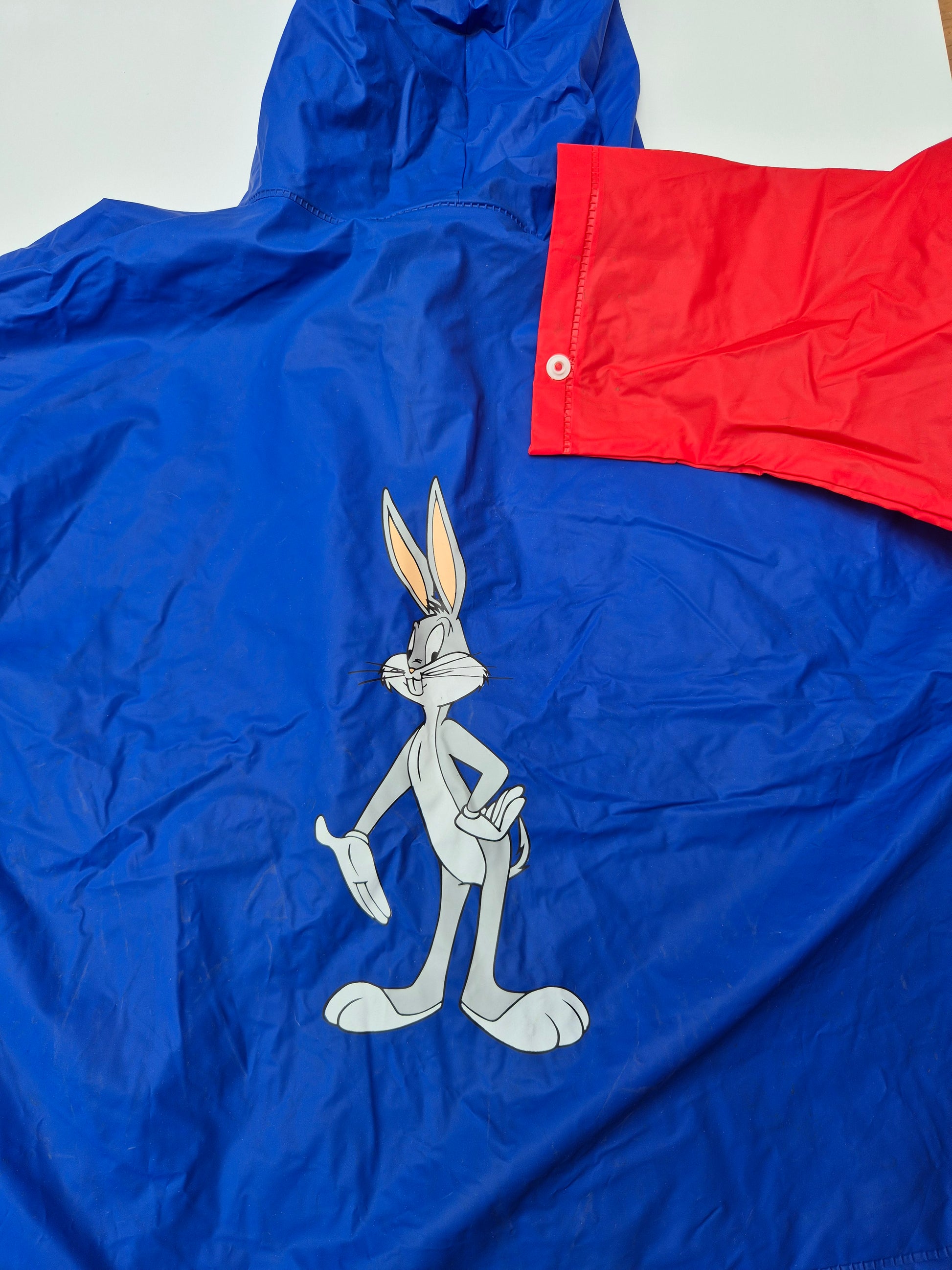 Knalkleurig regenpak in blauw en rood, met Bugs Bunny-print en bijpassend tasje. Wind- en waterdicht, kortom: klaar voor avontuur!