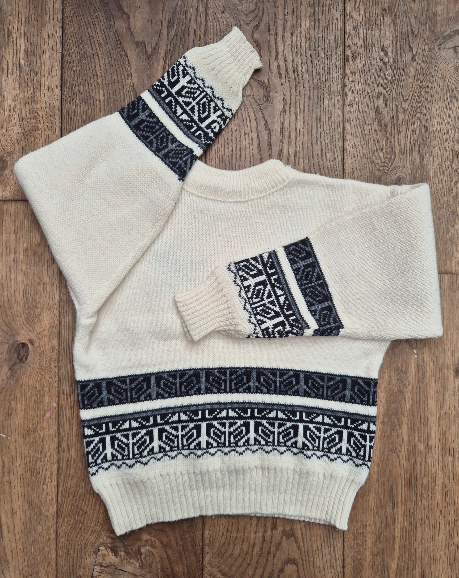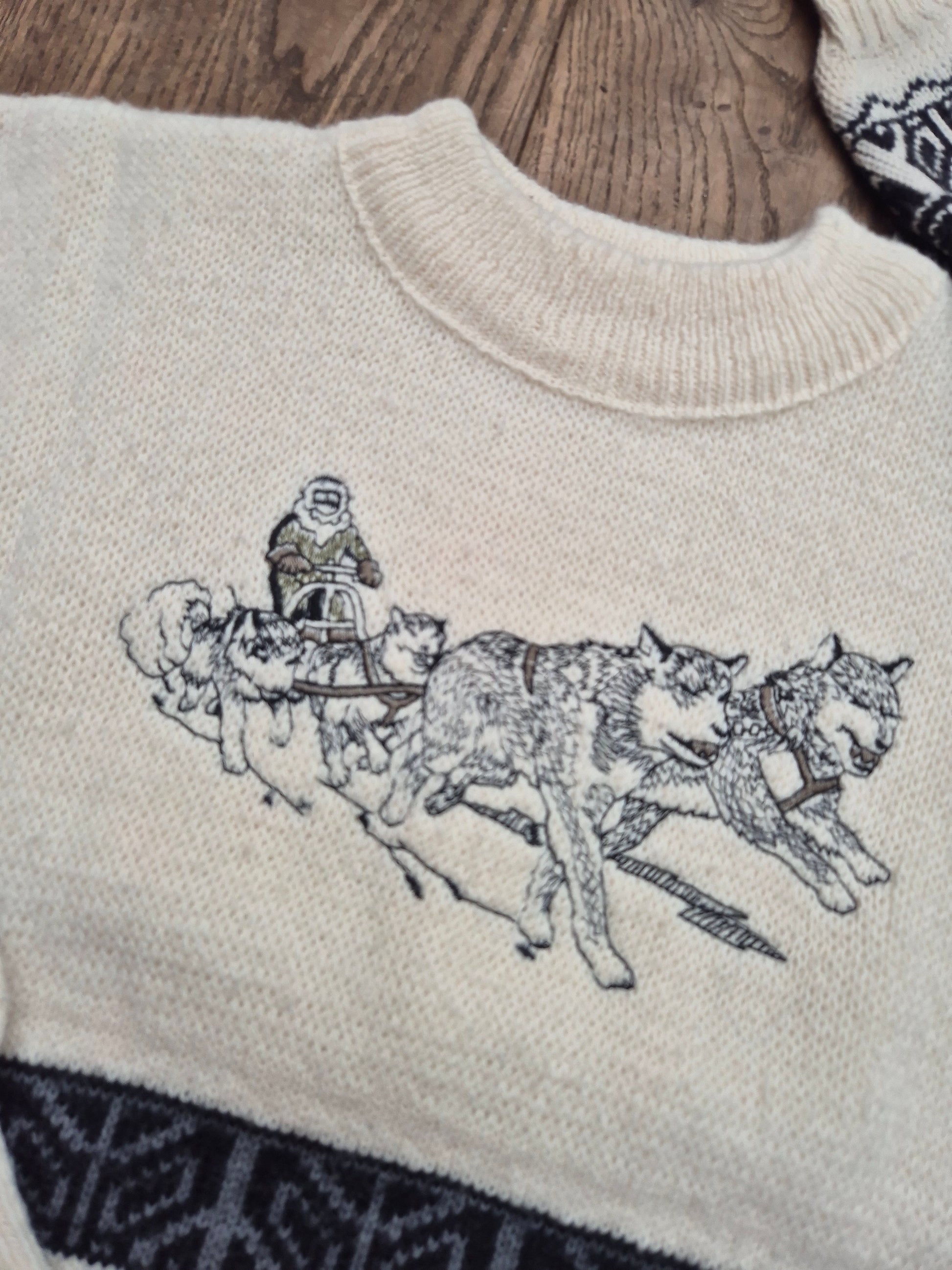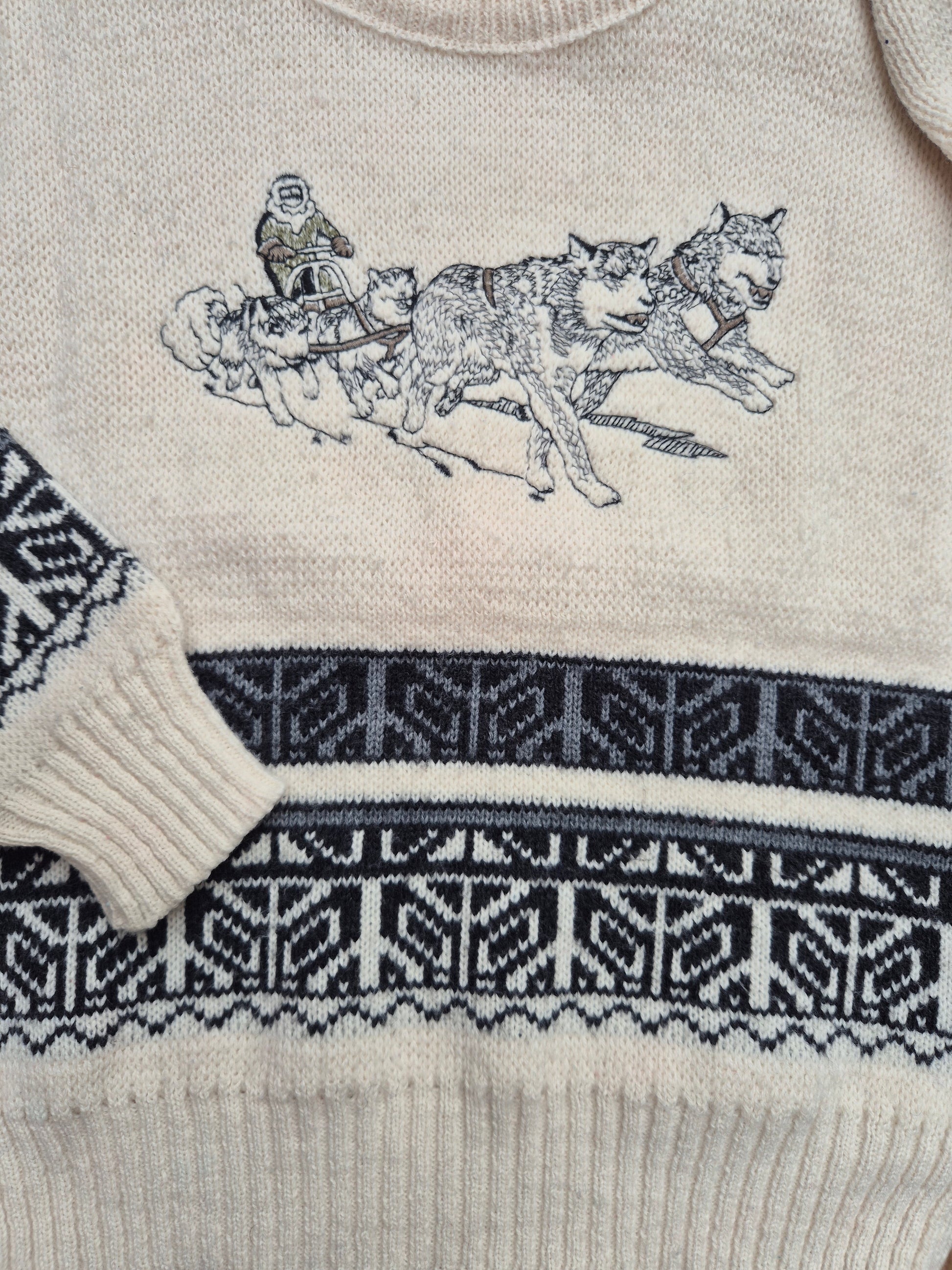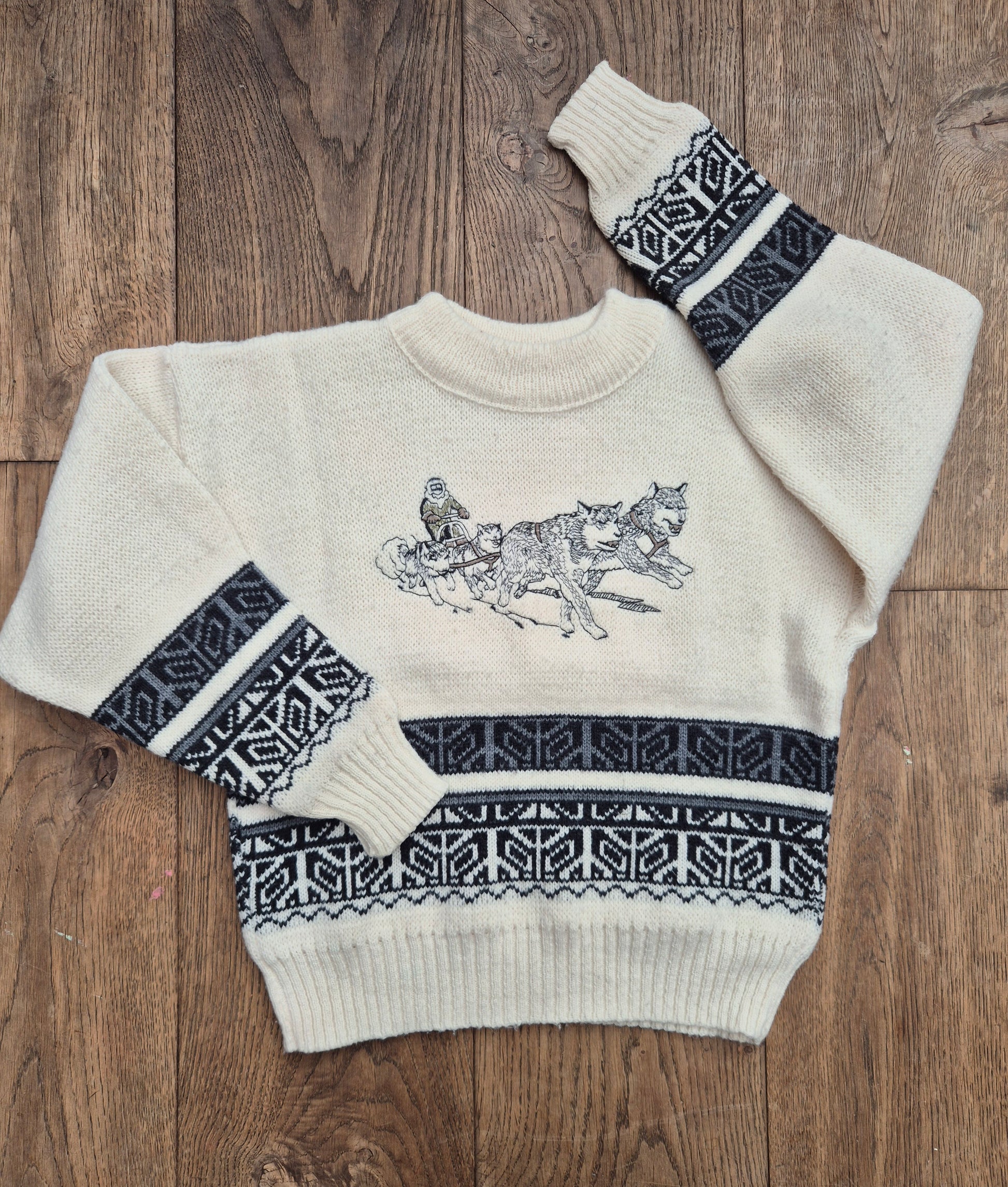 Warme vintage trui met Noors motief en een vrolijke husky op de borst. Lekker zacht, stevig gebreid en perfect voor winterse dagen.