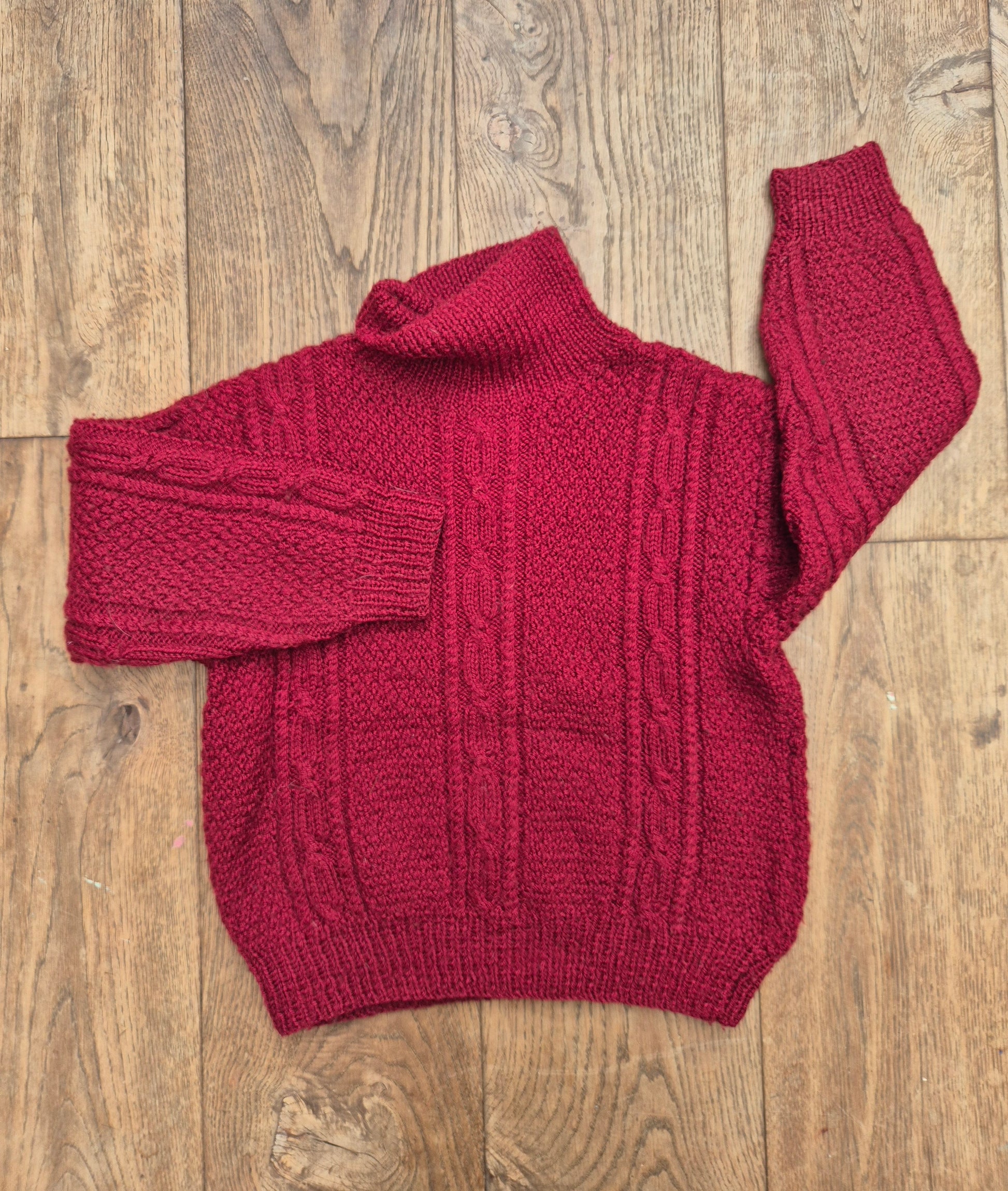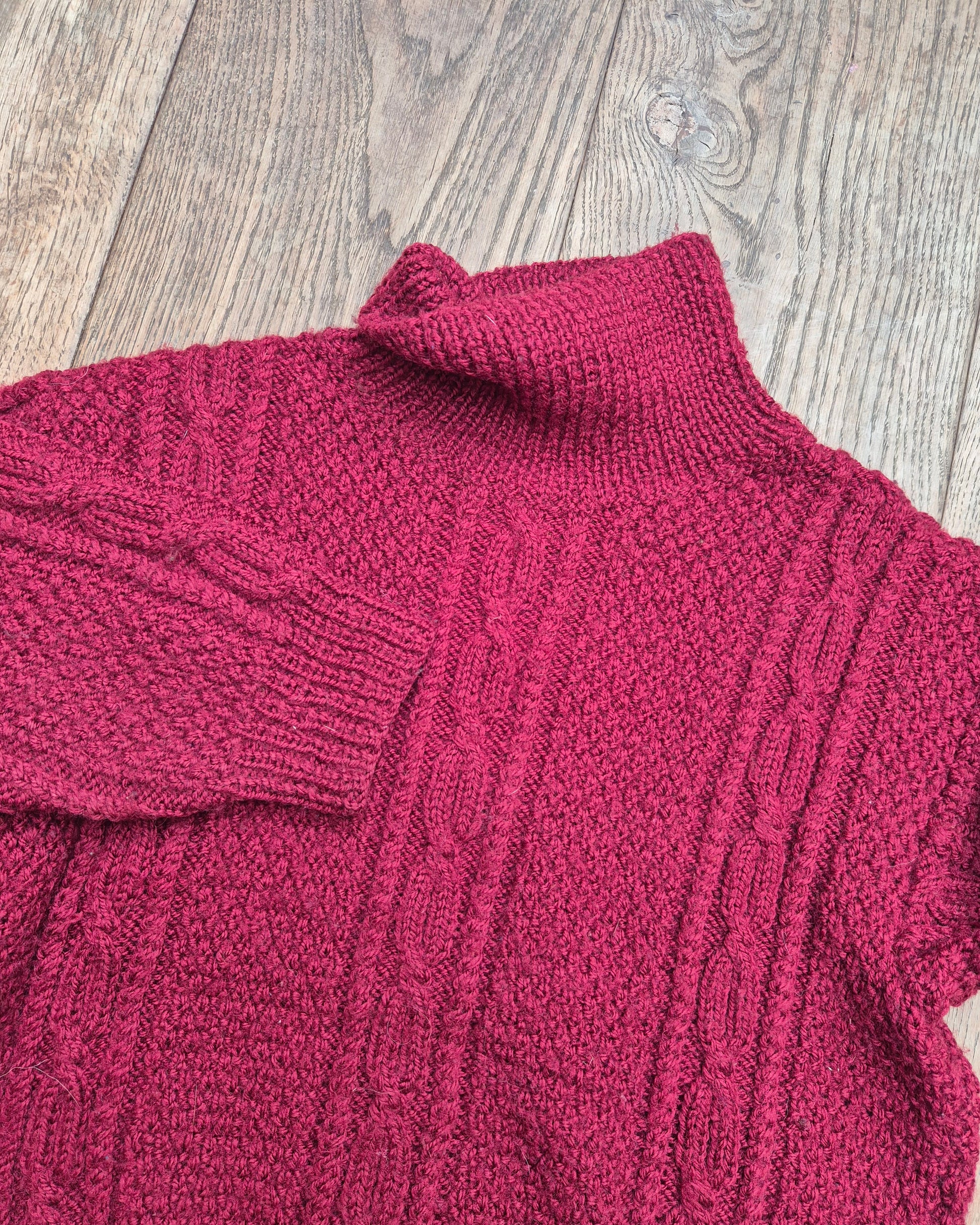 Fijne vintage trui met hoge col en klassieke kabelstructuur. Warme dieprode tint en comfortabele fit, ideaal voor koude dagen.