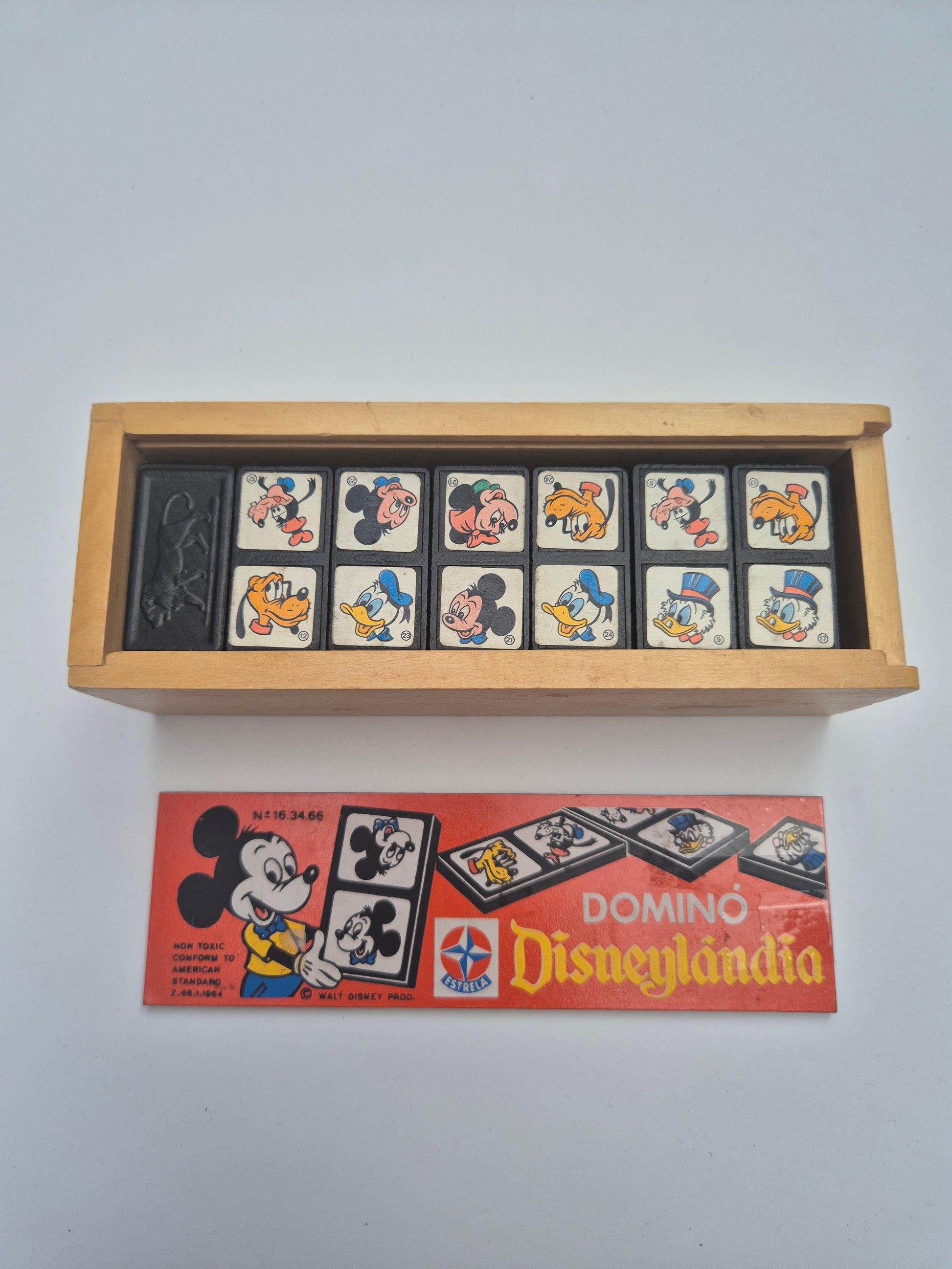 Originele Domino Disneylandia uit de jaren 70, gemaakt door Estrela in Brazilië onder officiële Walt Disney-licentie. De set zit in een stevige houten schuifdoos met kleurrijke illustraties van Mickey, Donald en Goofy. Een bijzonder verzamelstuk vol nostalgie en vrolijkheid.