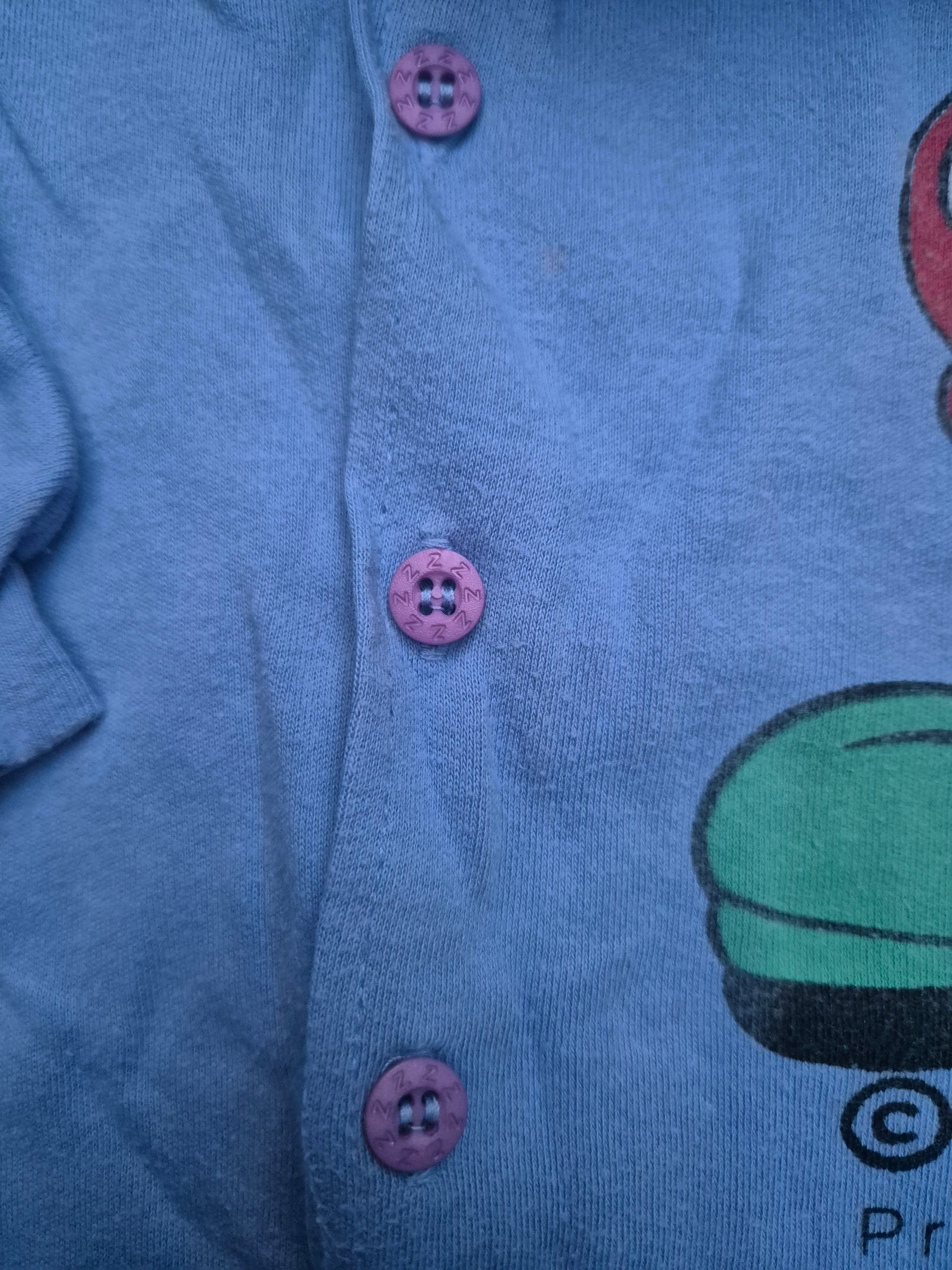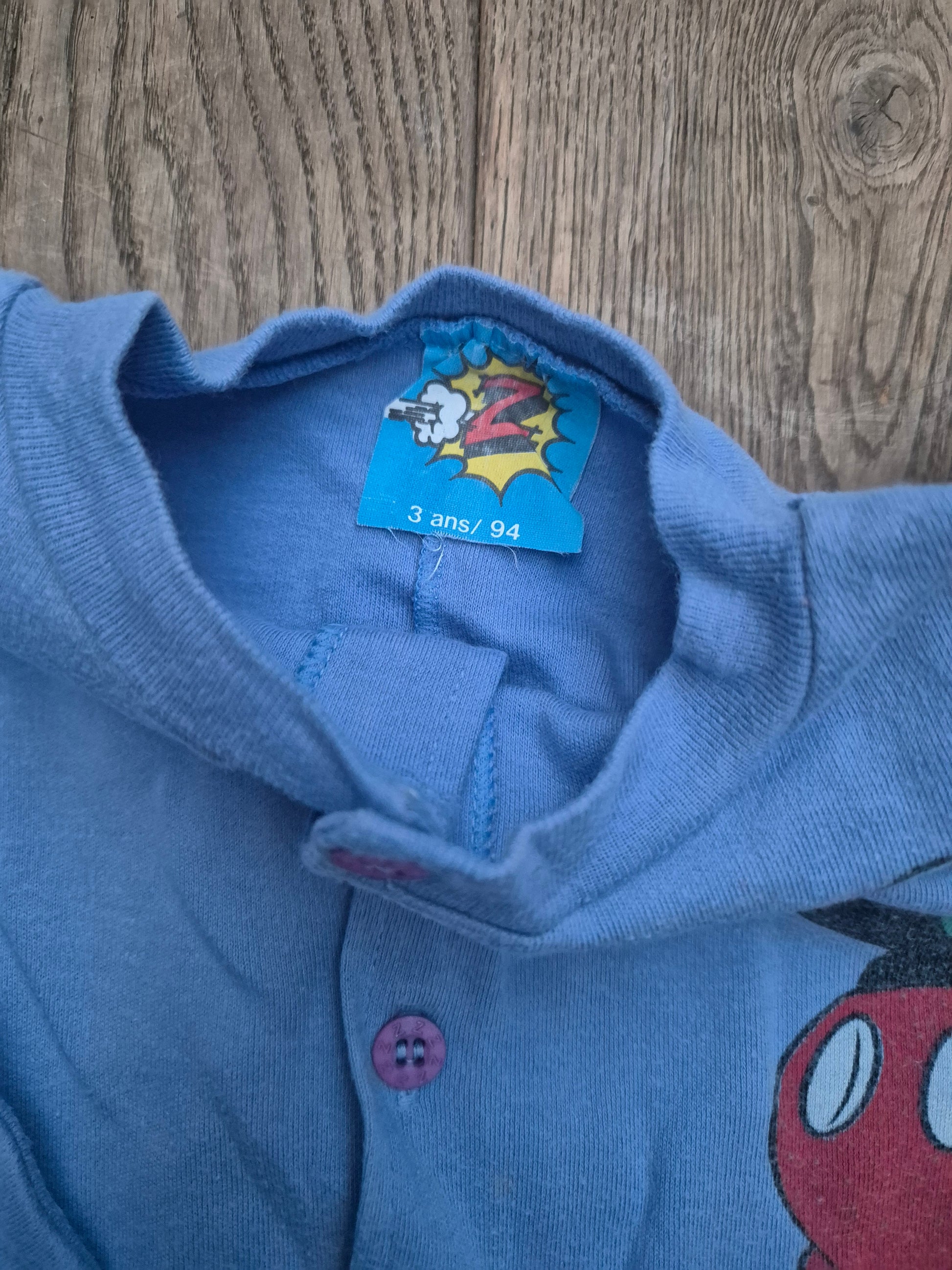 Heerlijk pak met grote Mickey Mouse-print en paarse knoopjes. Typisch 80s design met die heerlijke Disney-charme van toen.