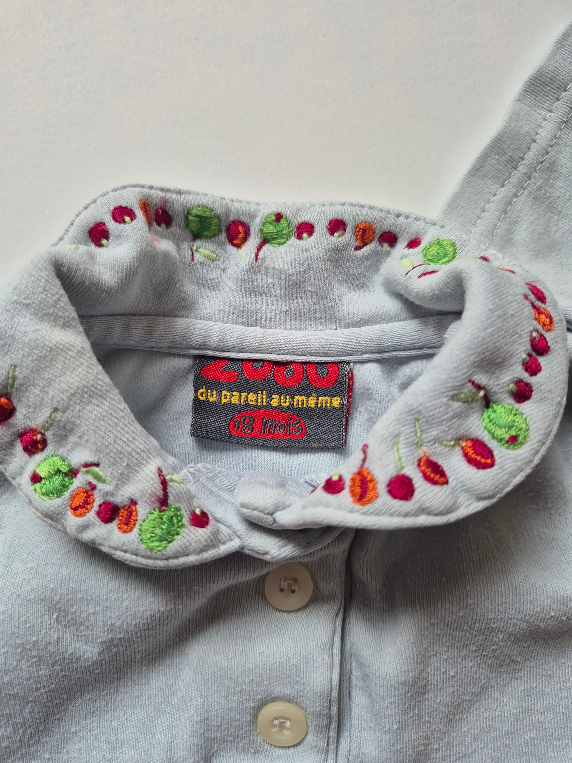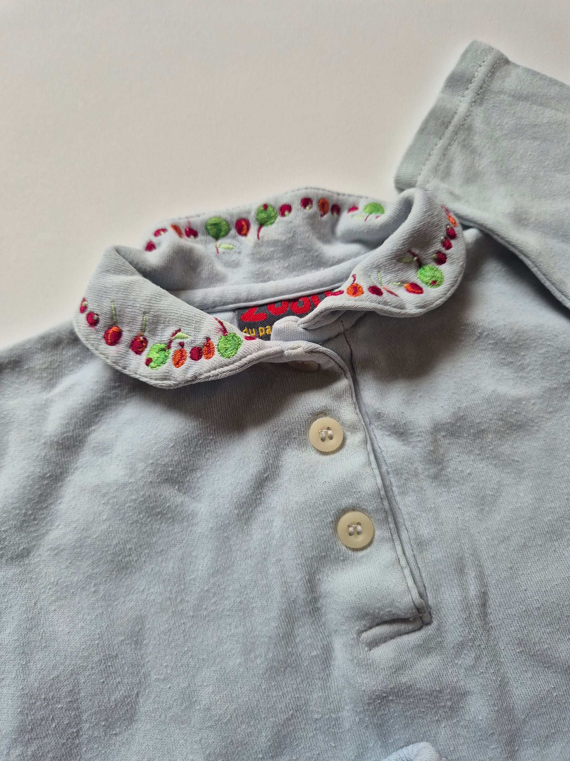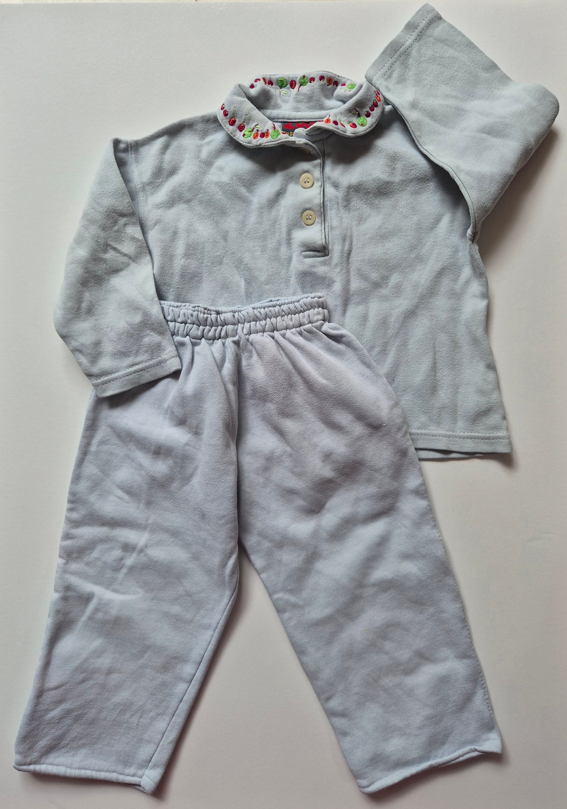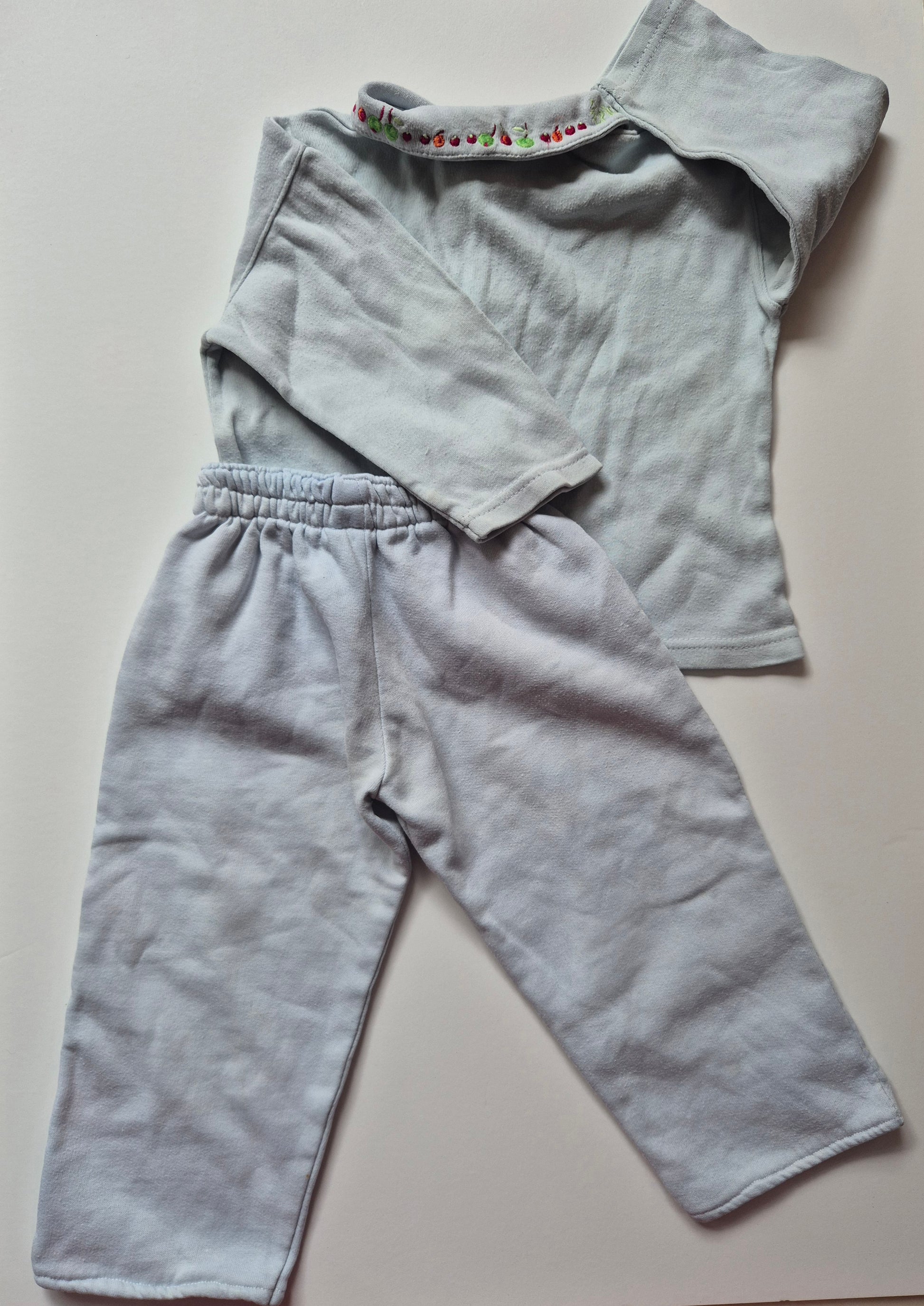 Zacht tweedelig setje: een trui met kraagje en geborduurde fruitjes en bijpassende broek.