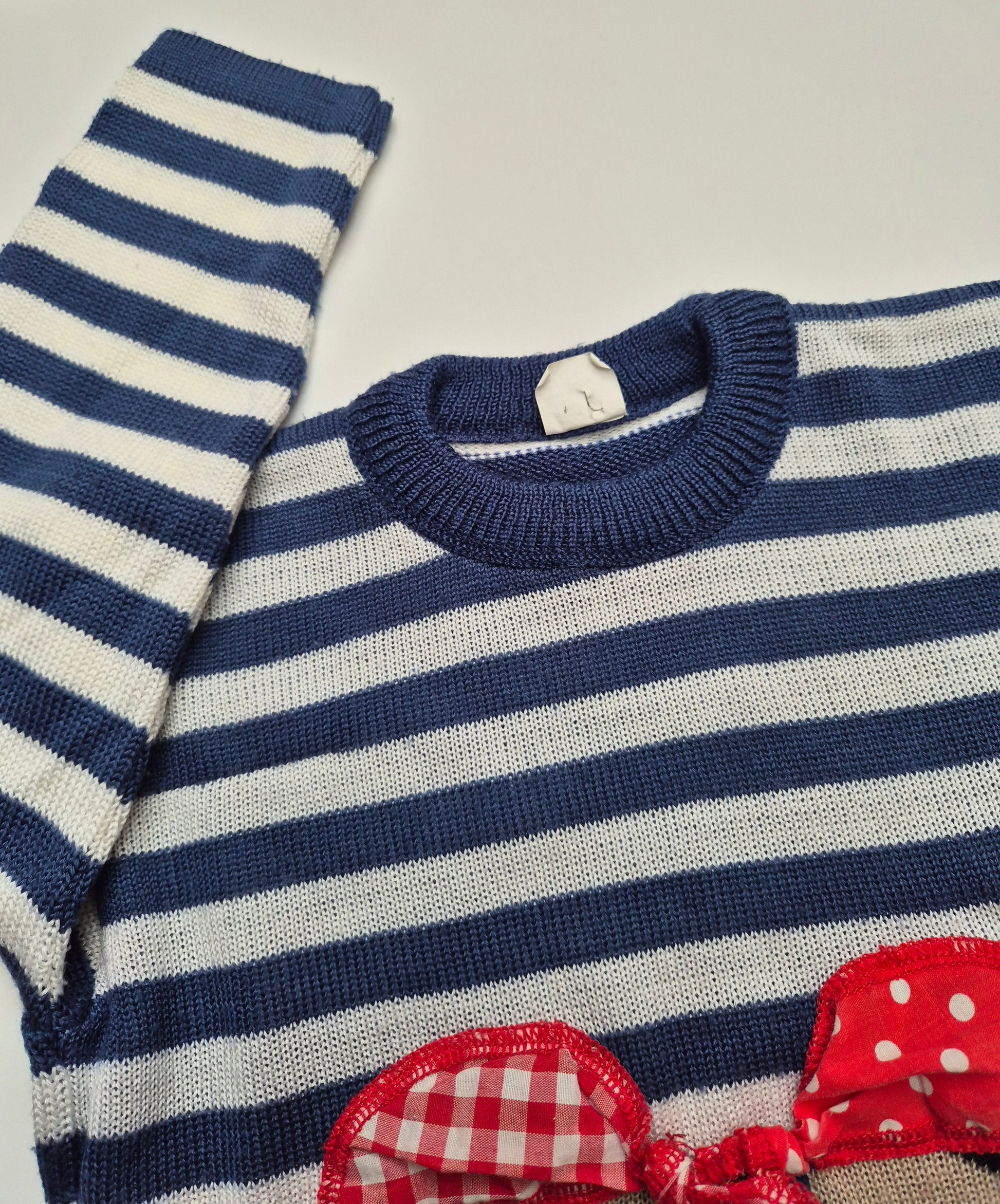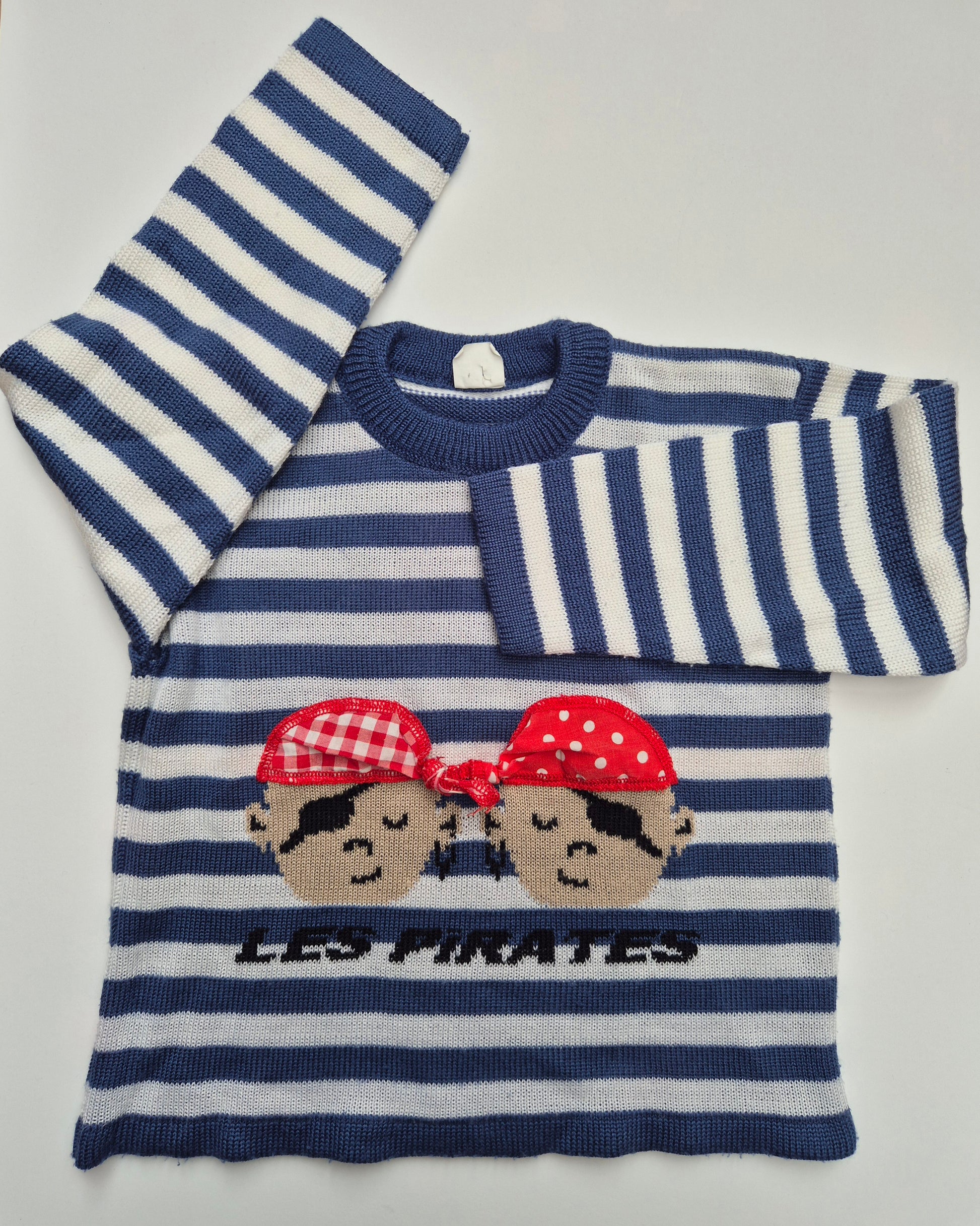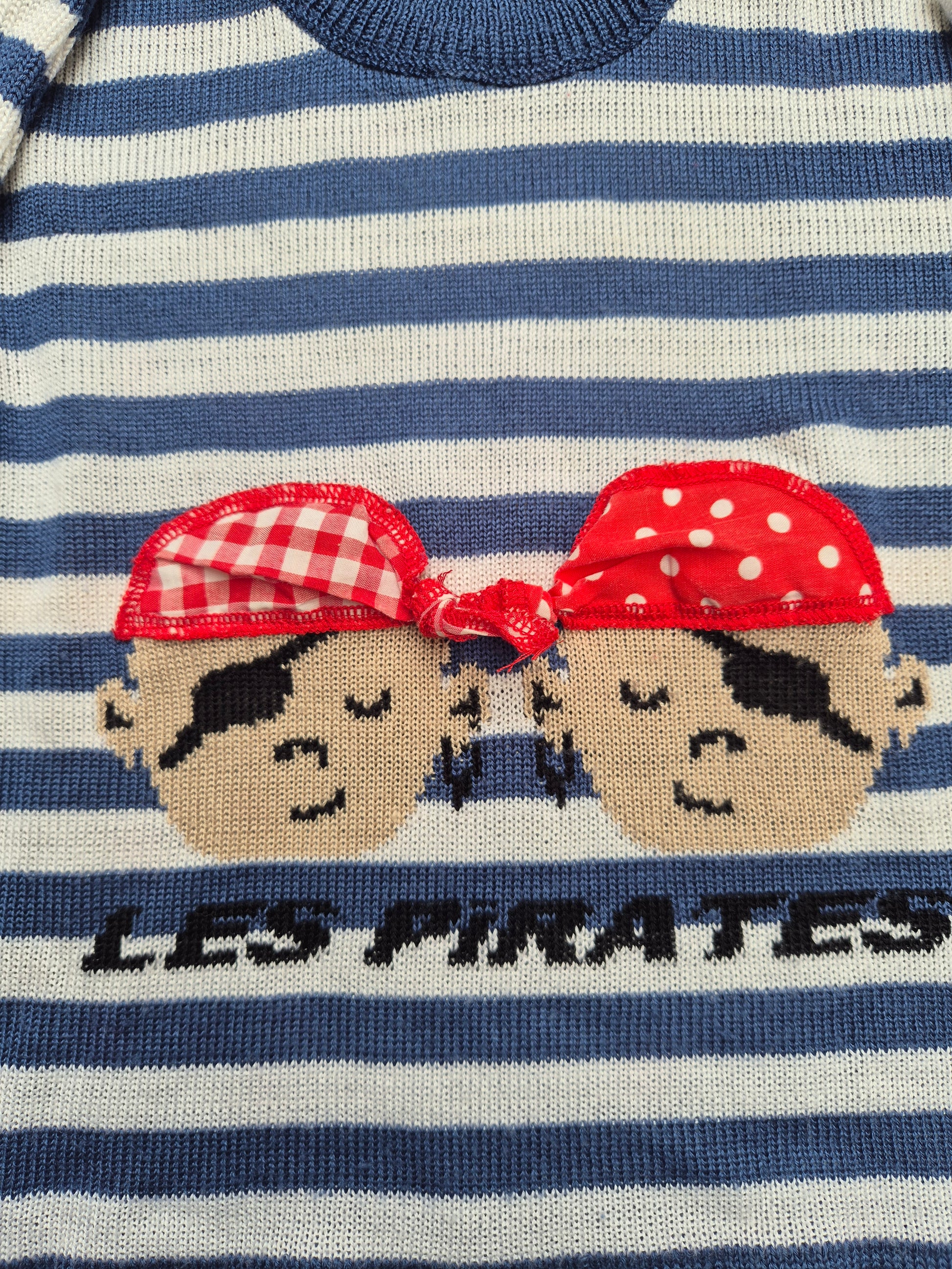 Blauw-witte gestreepte trui met twee piraten en rood geruit detail. Vrolijk en speels met Franse flair.