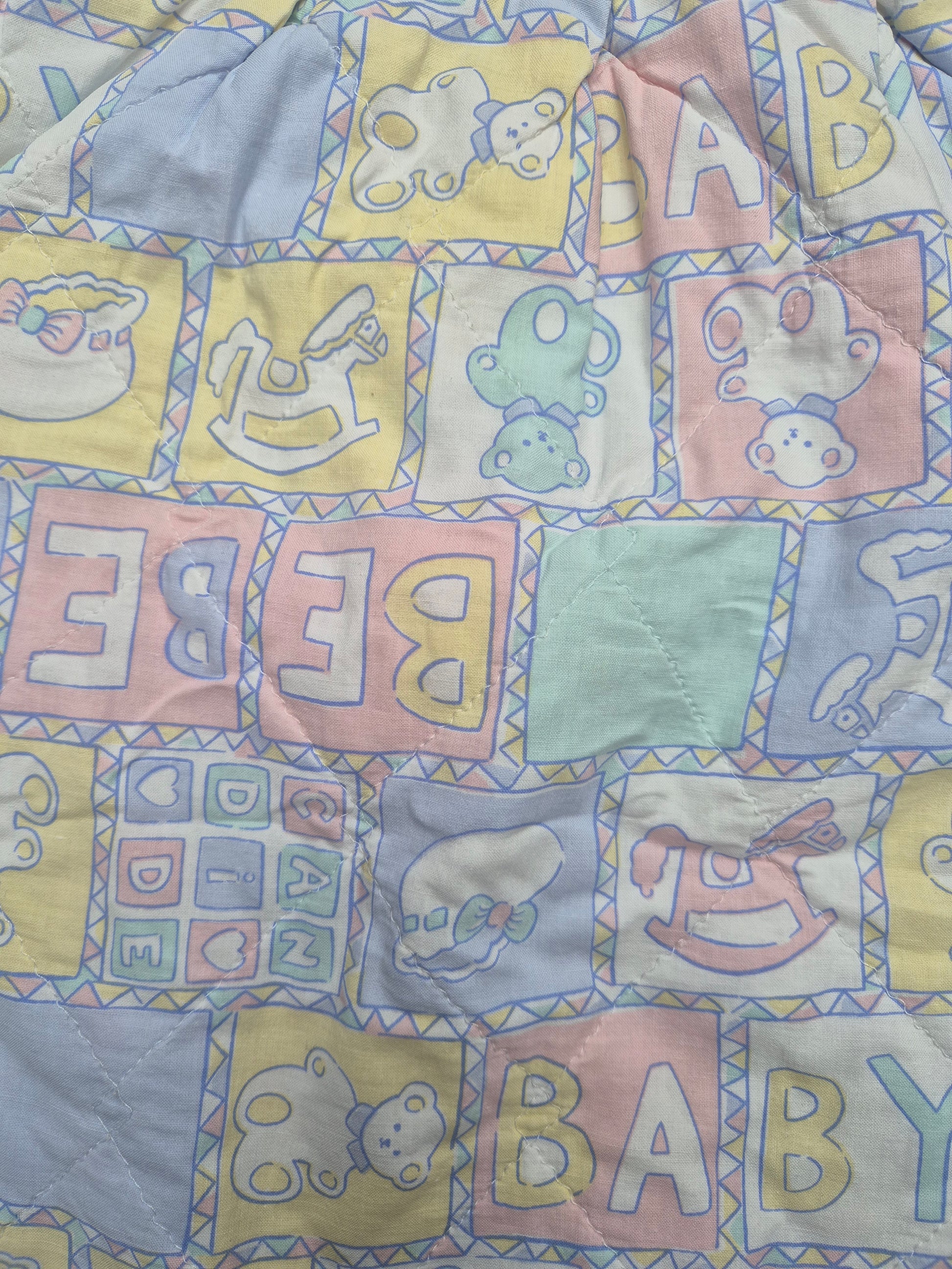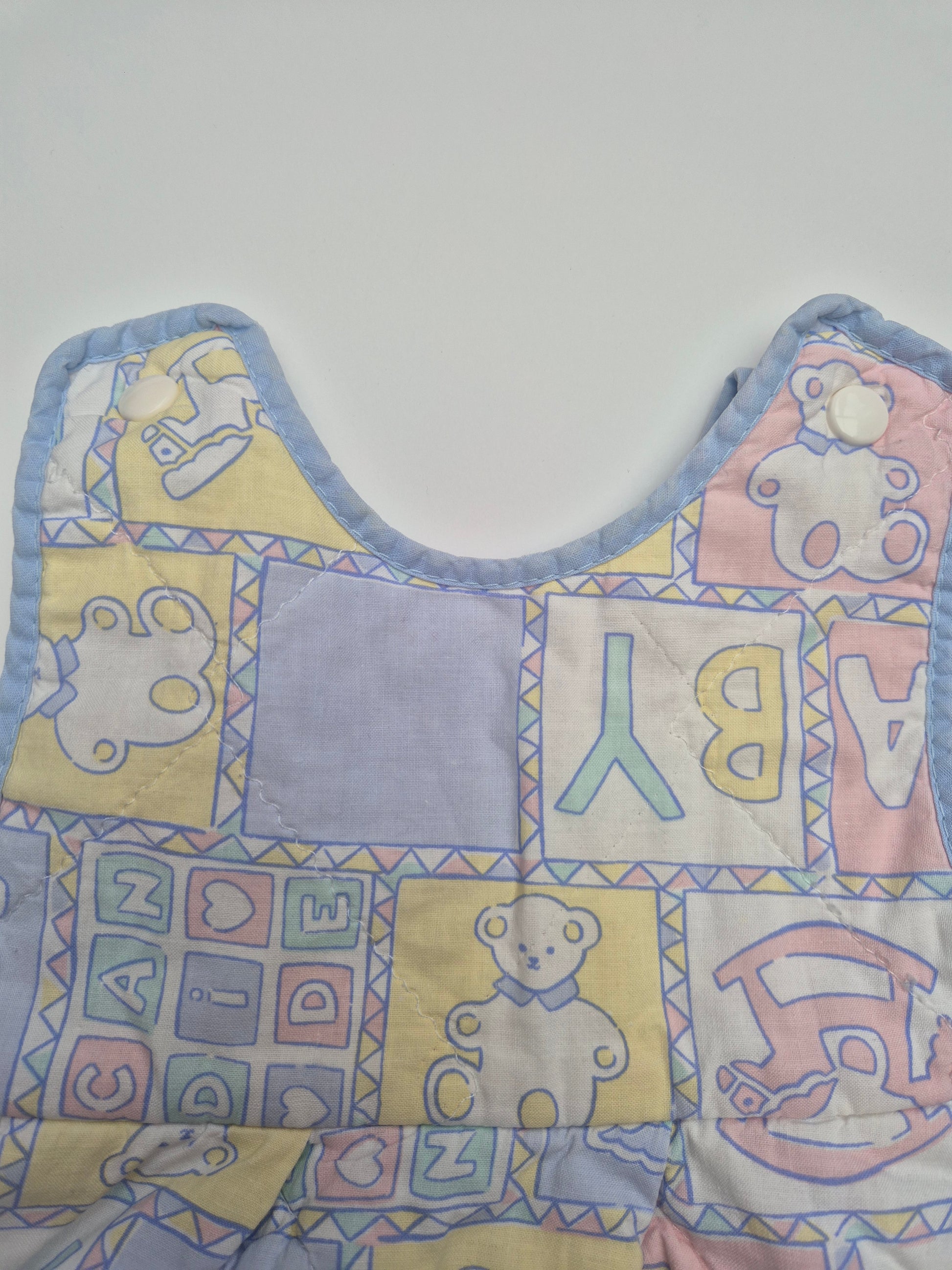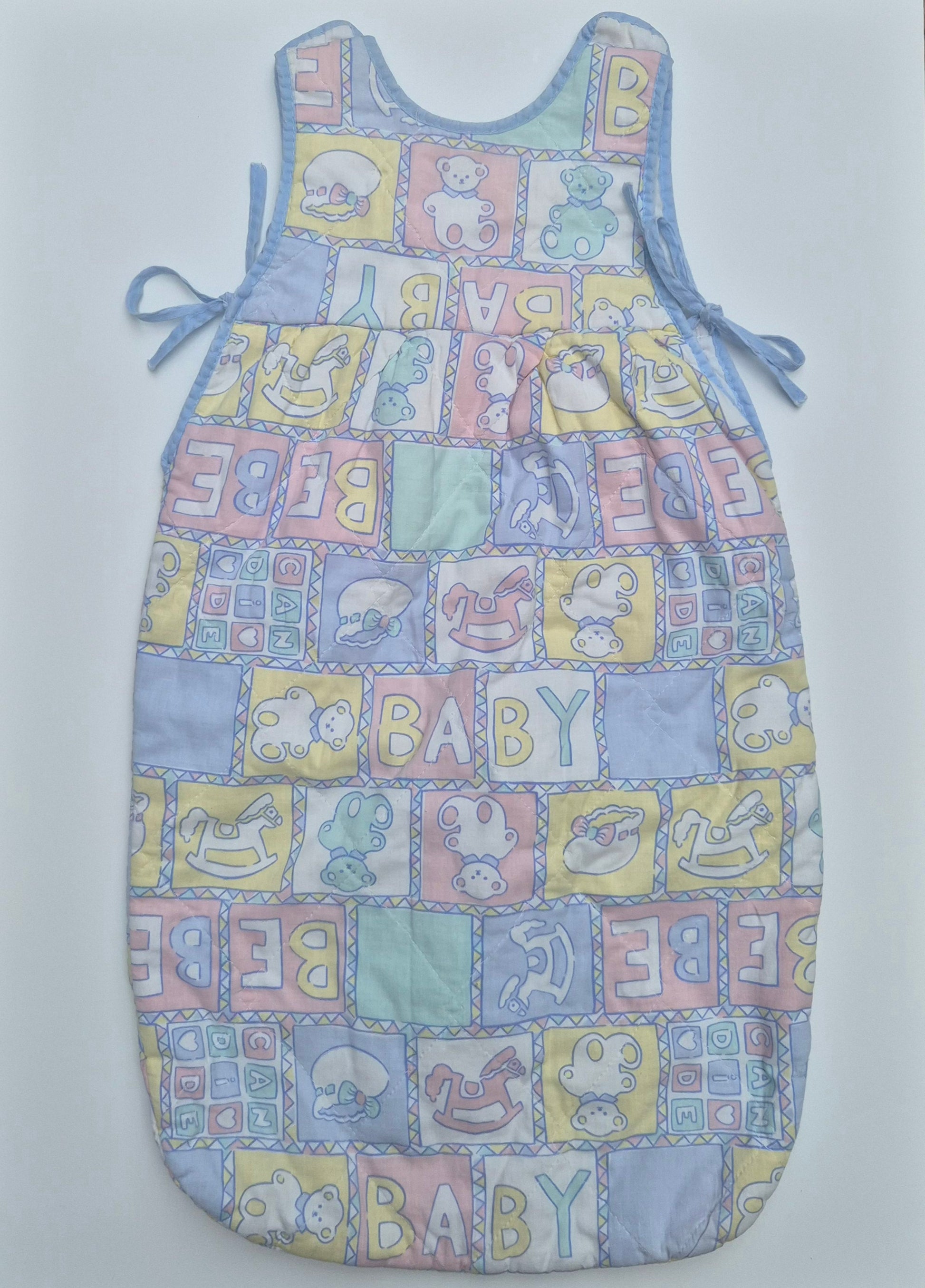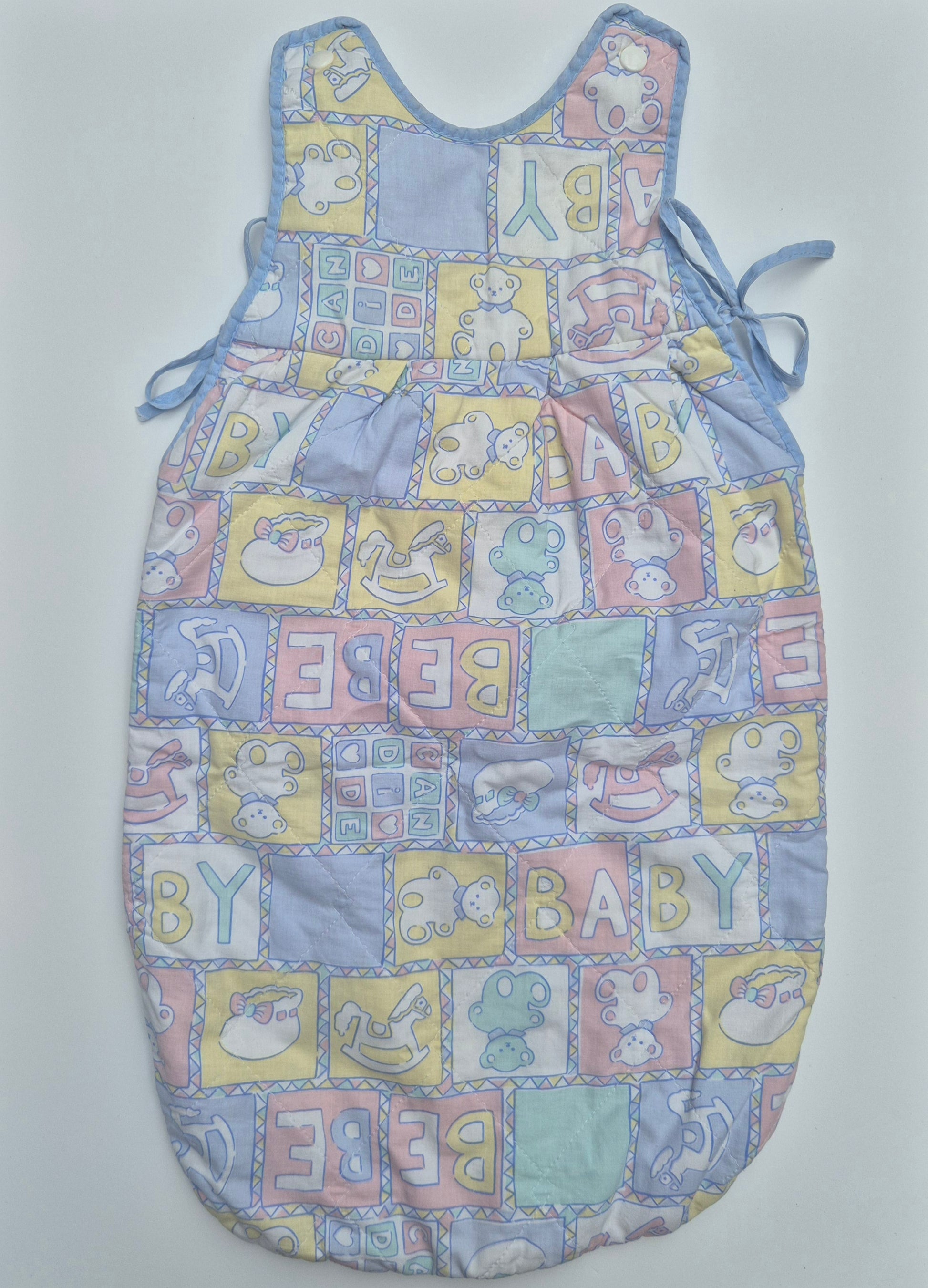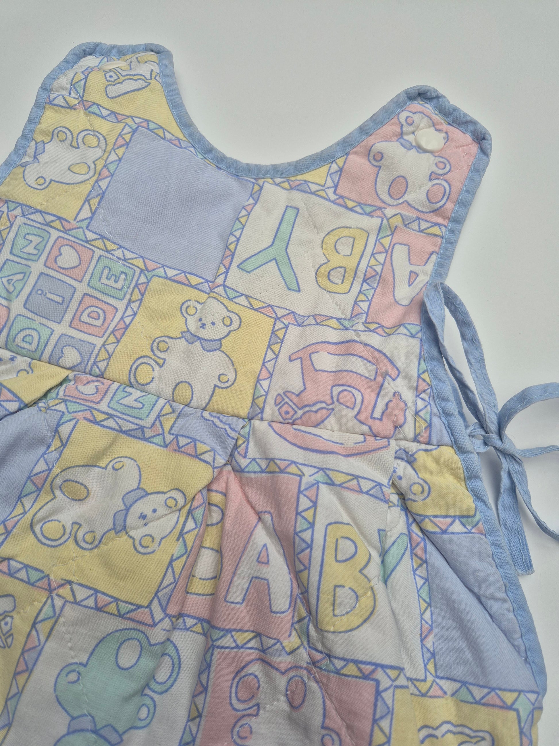 Knusse vintage slaapzak met strikjes en retro babyprint in zachte kleuren.