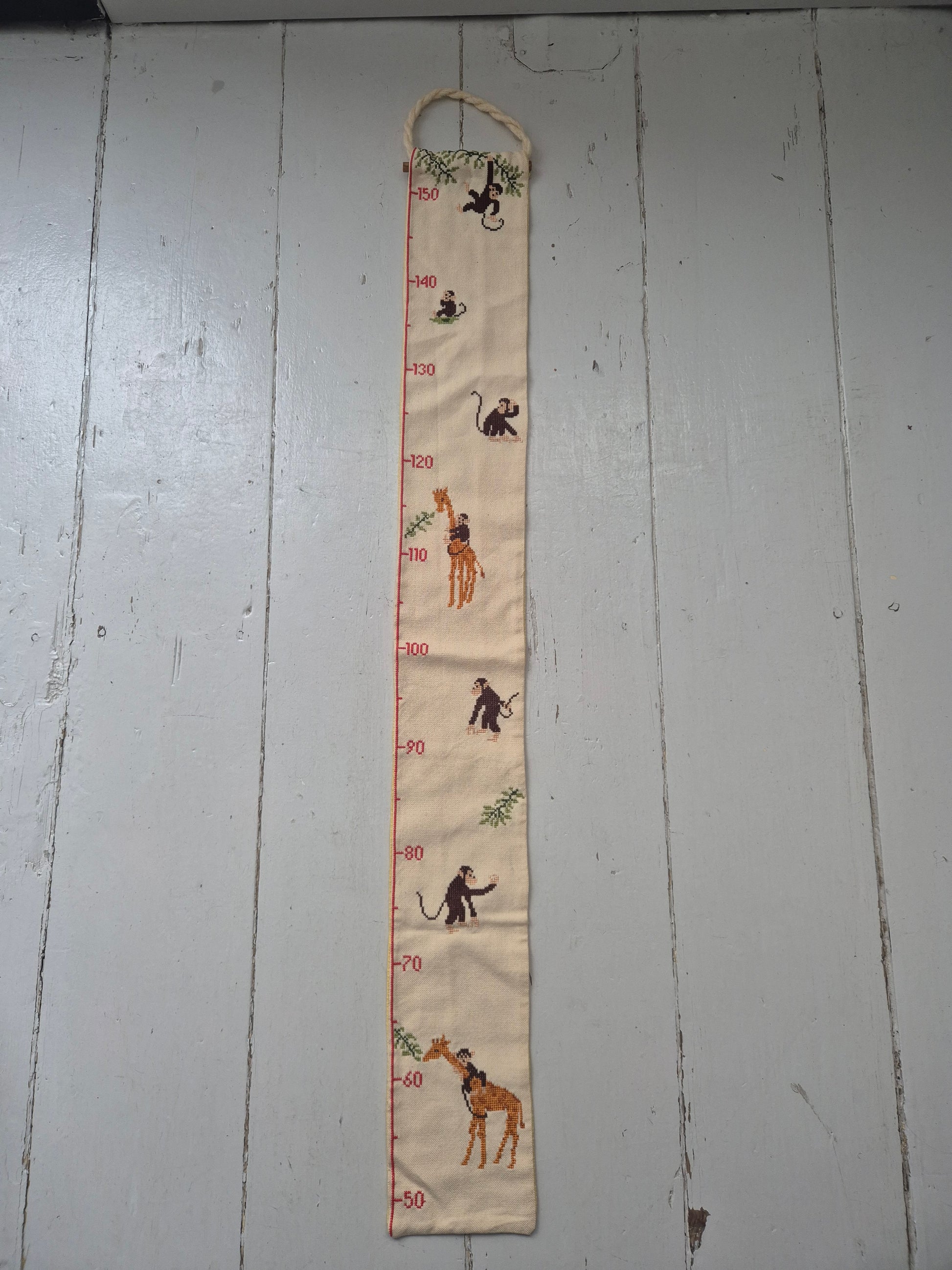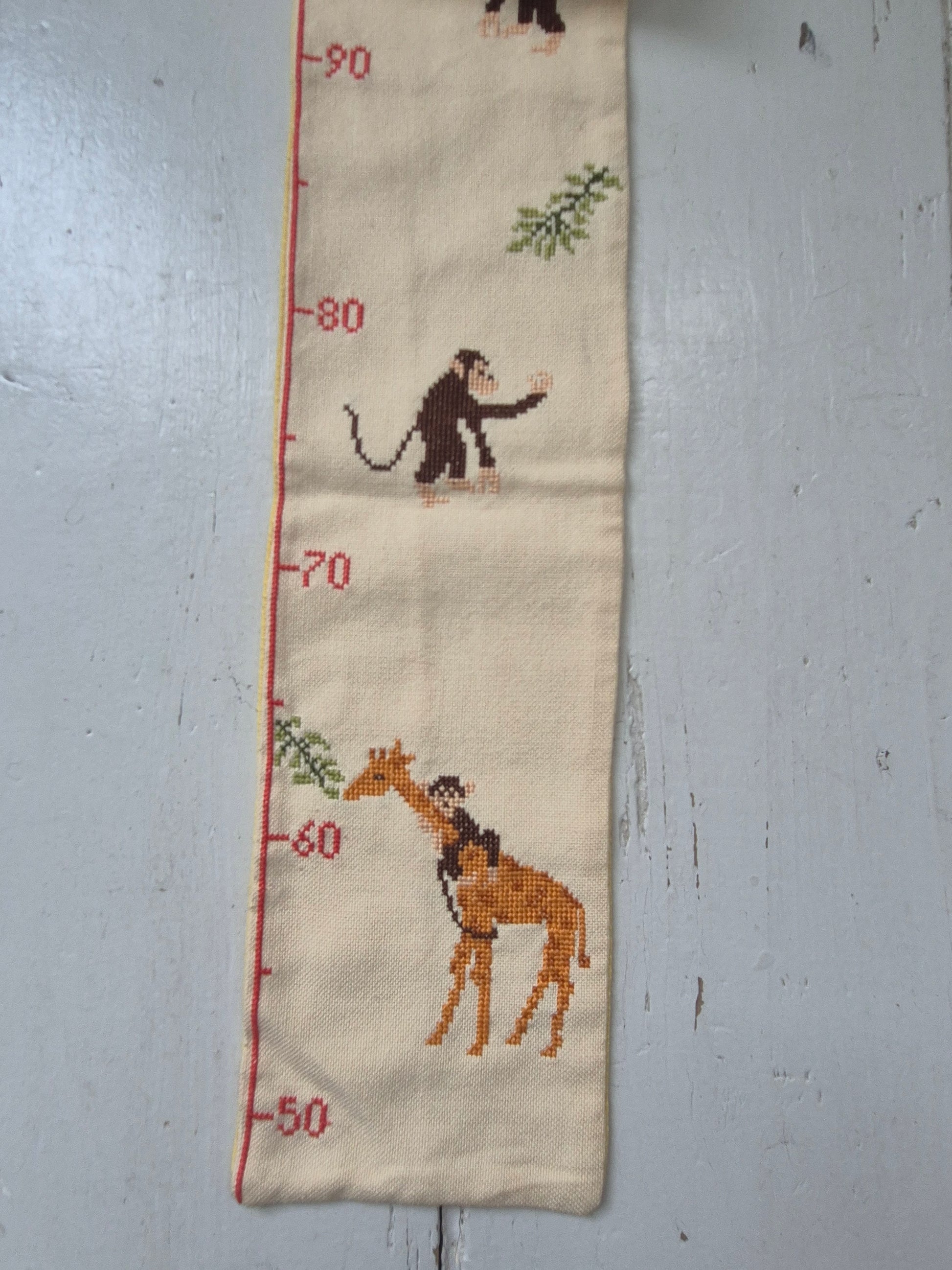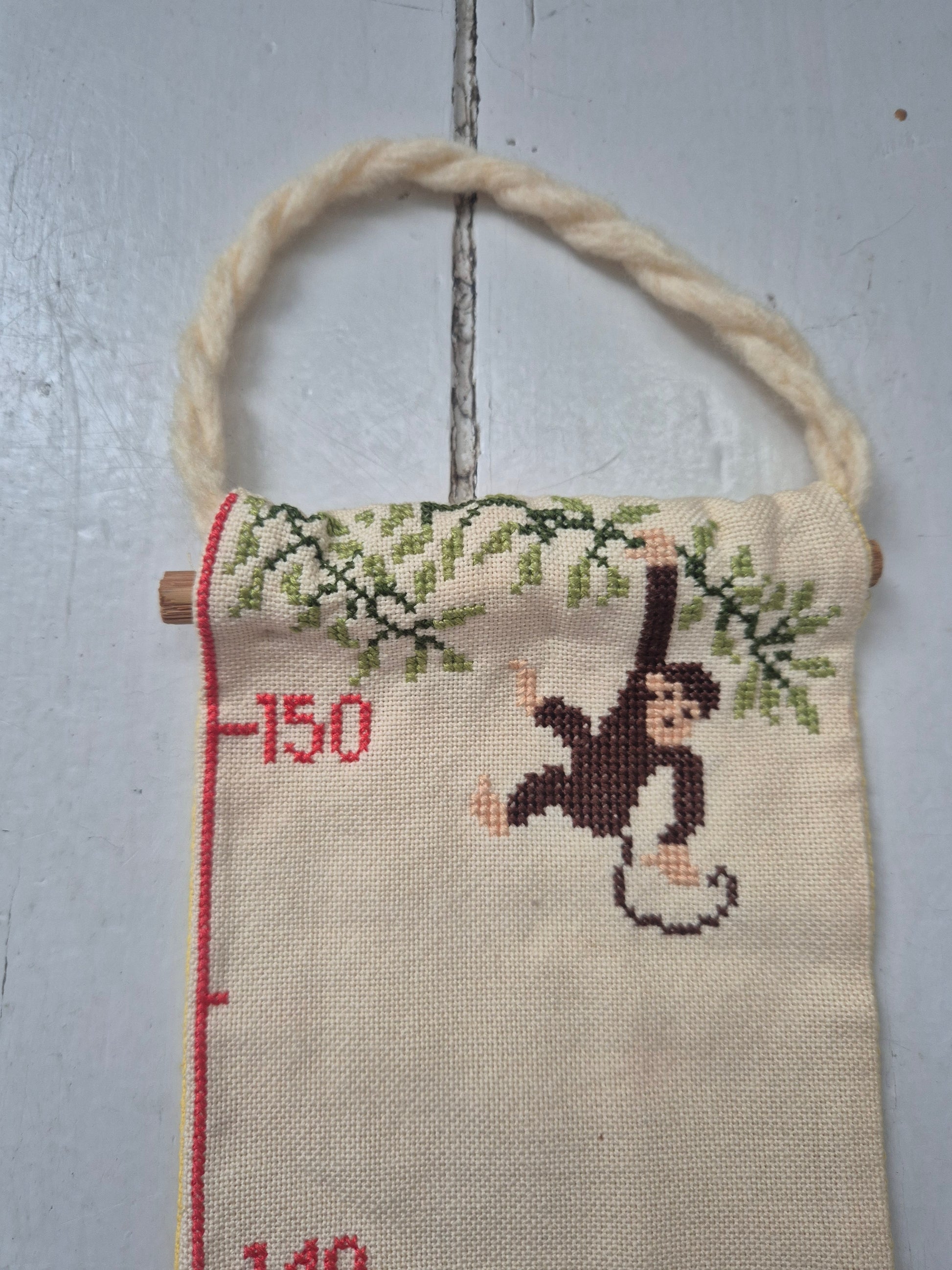Met de jaren meegroeien, letterlijk. Deze geborduurde groeimeter met aapjes en giraffes is pure nostalgie voor aan de muur van de kinderkamer. Met touwtje om op te hangen en charmant handwerk dat elke centimeter een glimlach geeft.