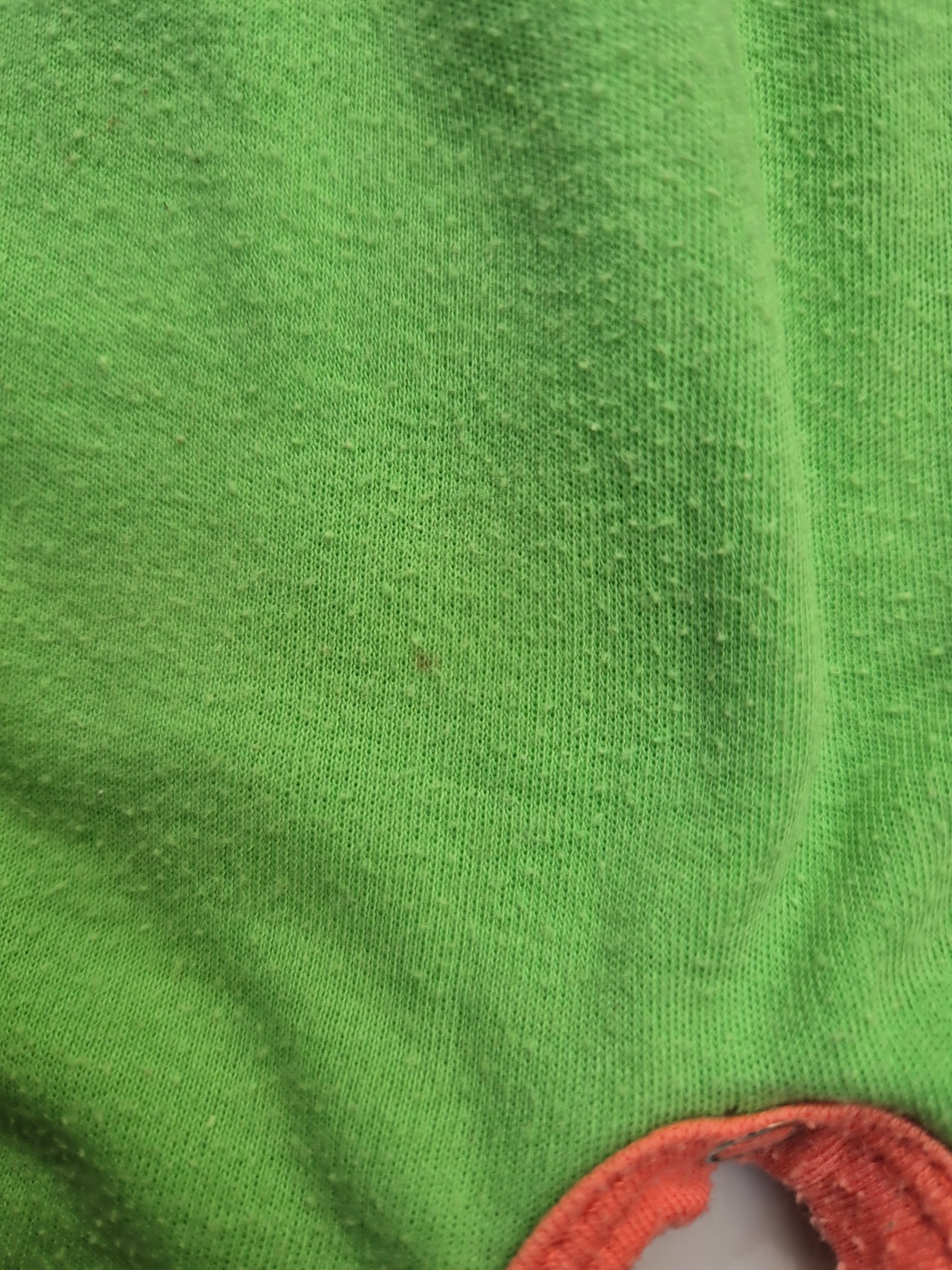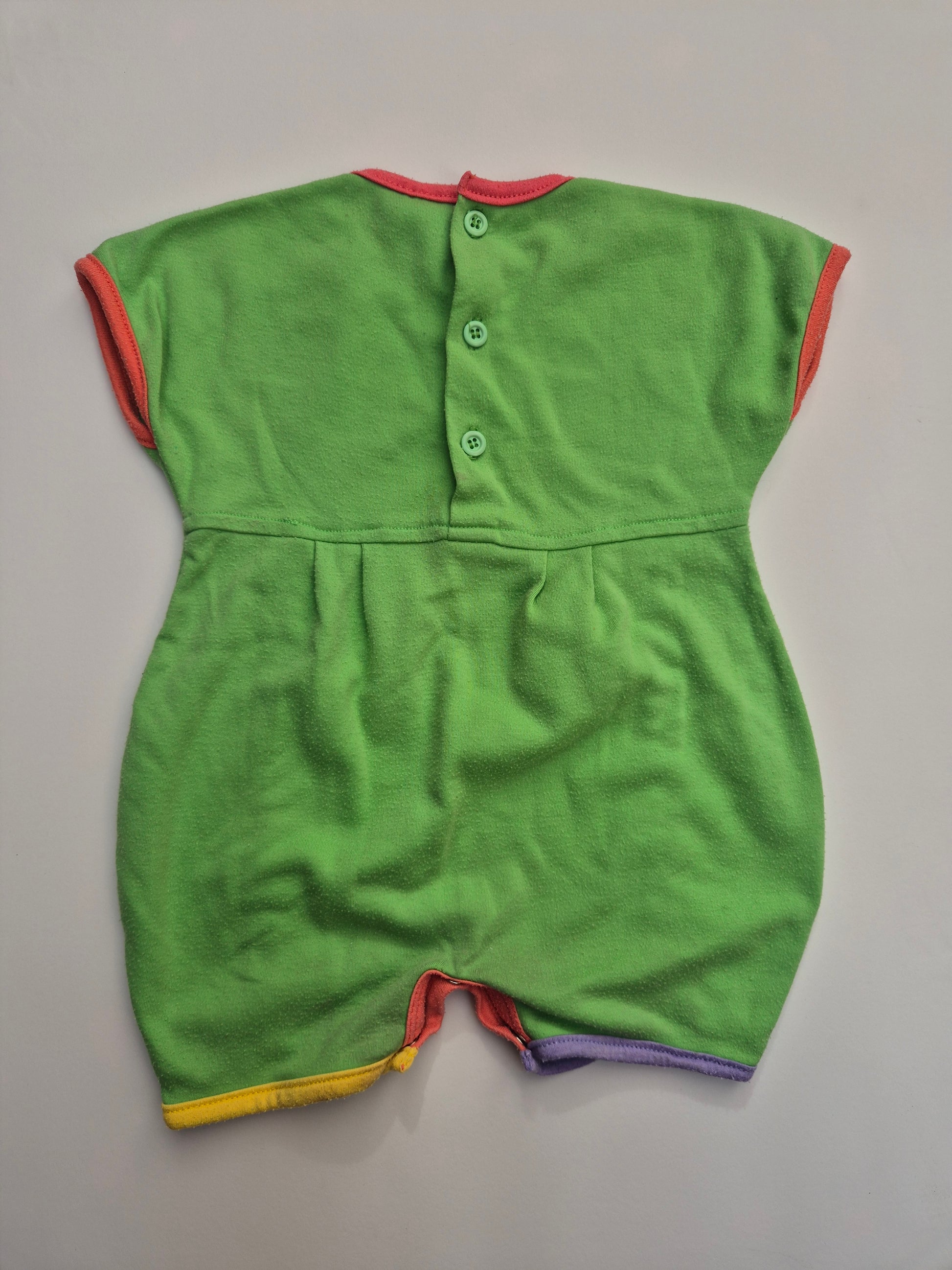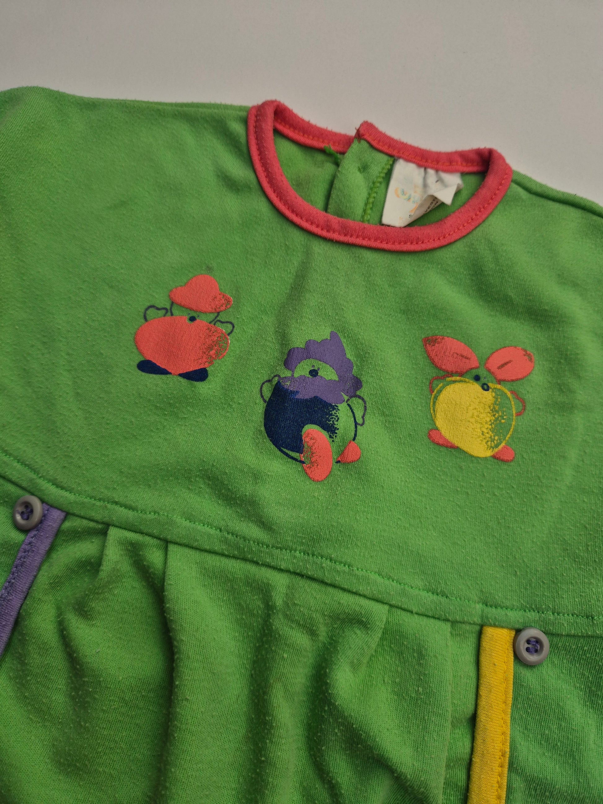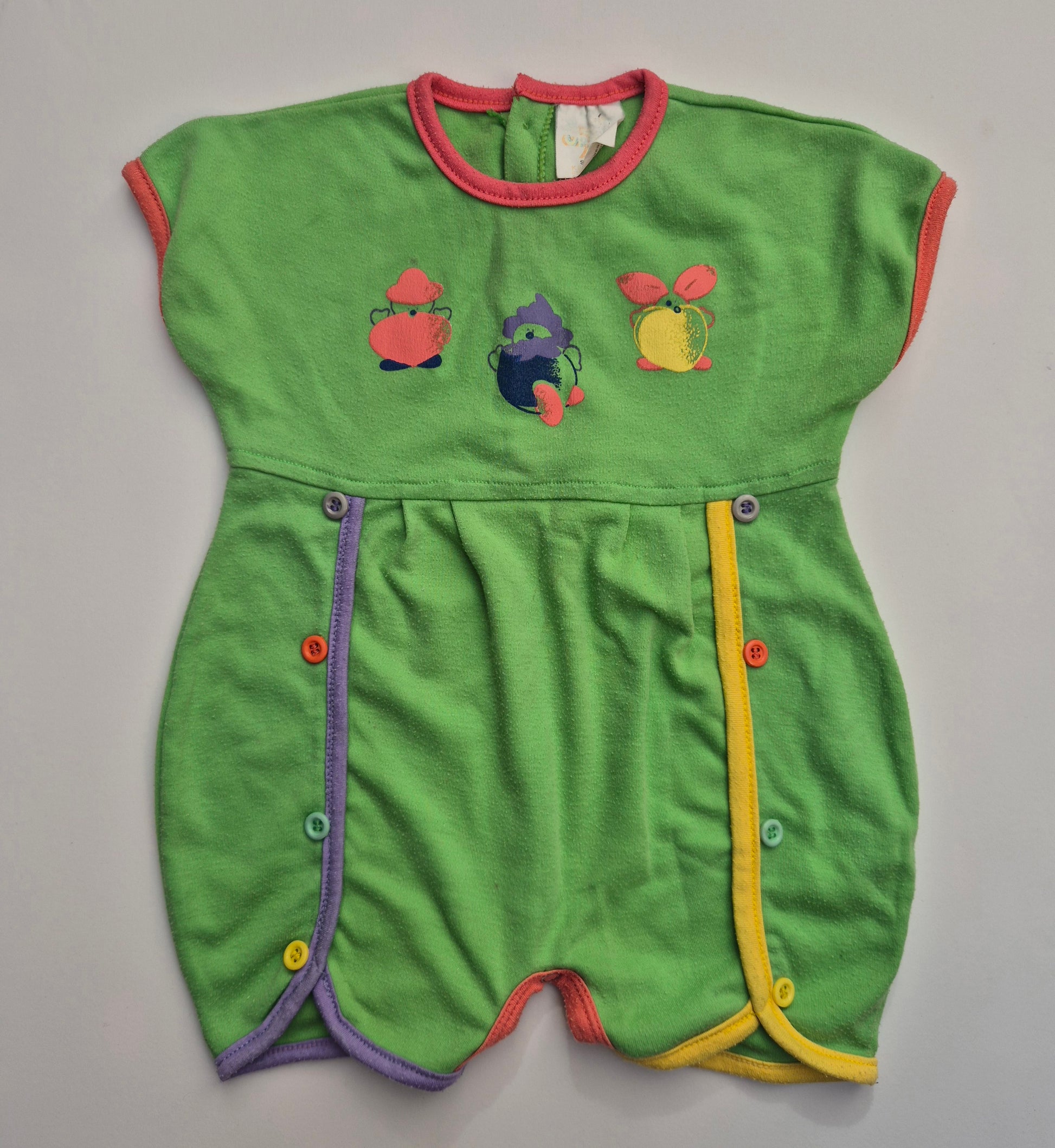 Opvallend pakje in felgroen met kleurrijke knoopjes en speelse print. Voor een frisse vintage look. Handige drukknoopjes bij de benen.