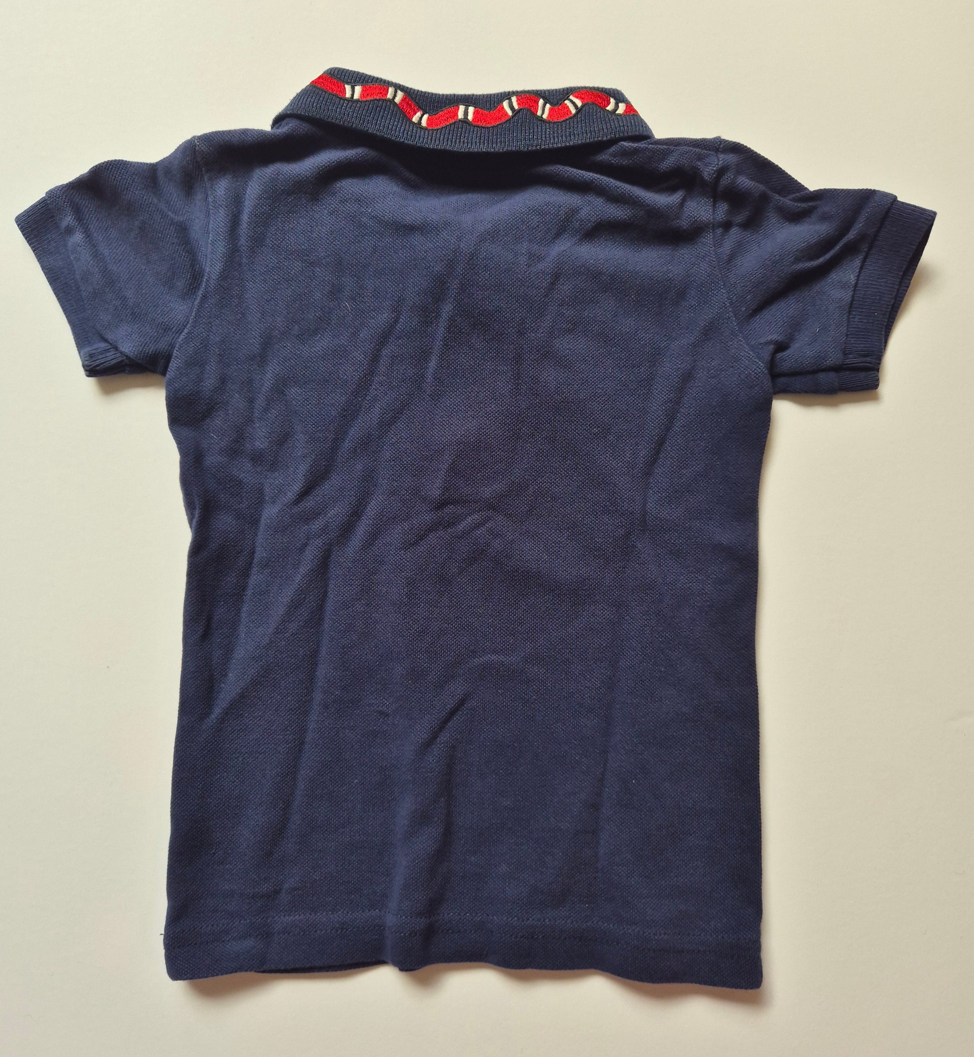 Donkerblauwe Gucci polo met korte mouwen en kraag vol geborduurde slangen en ster. Stijlvol en tijdloos.