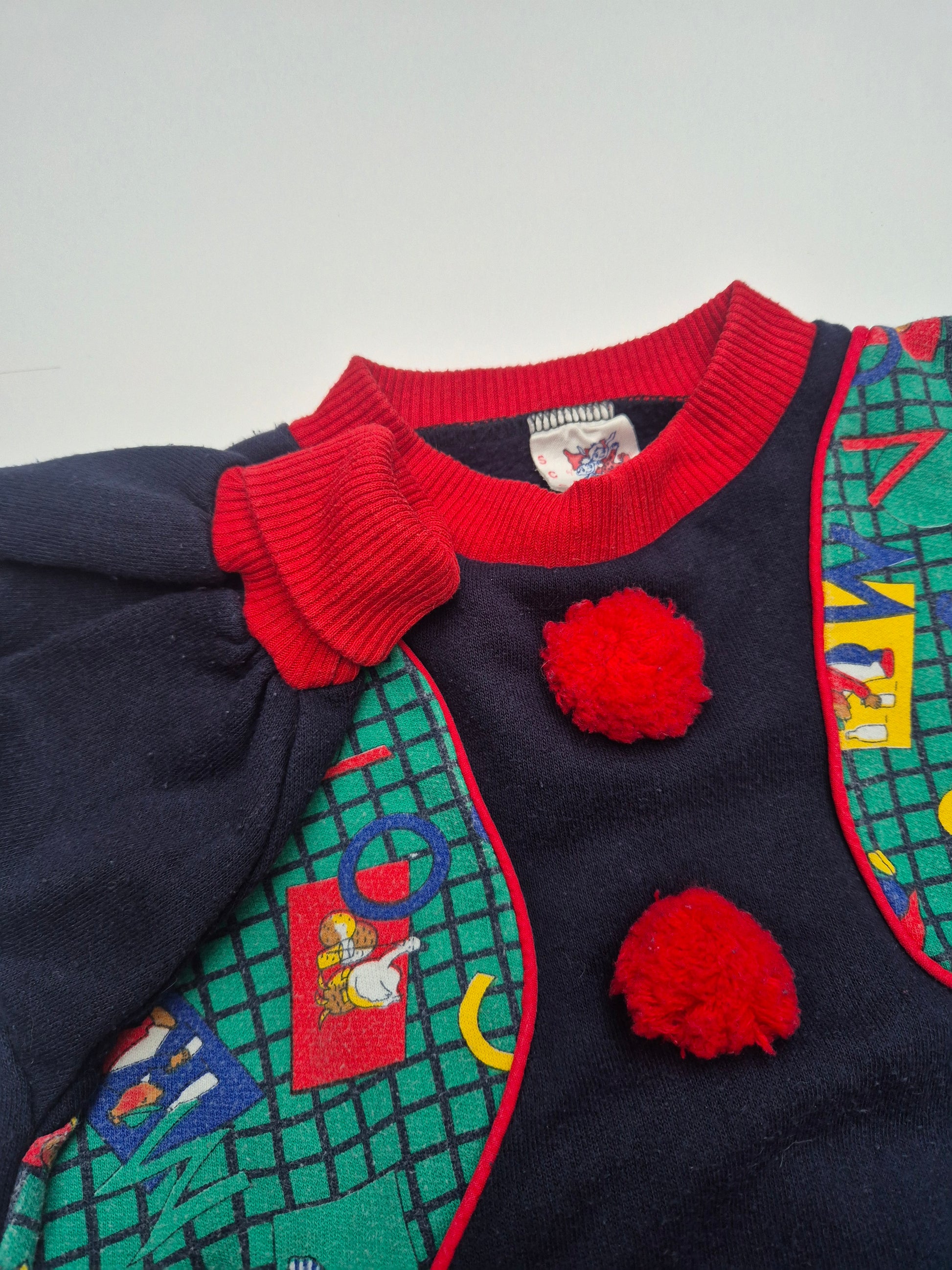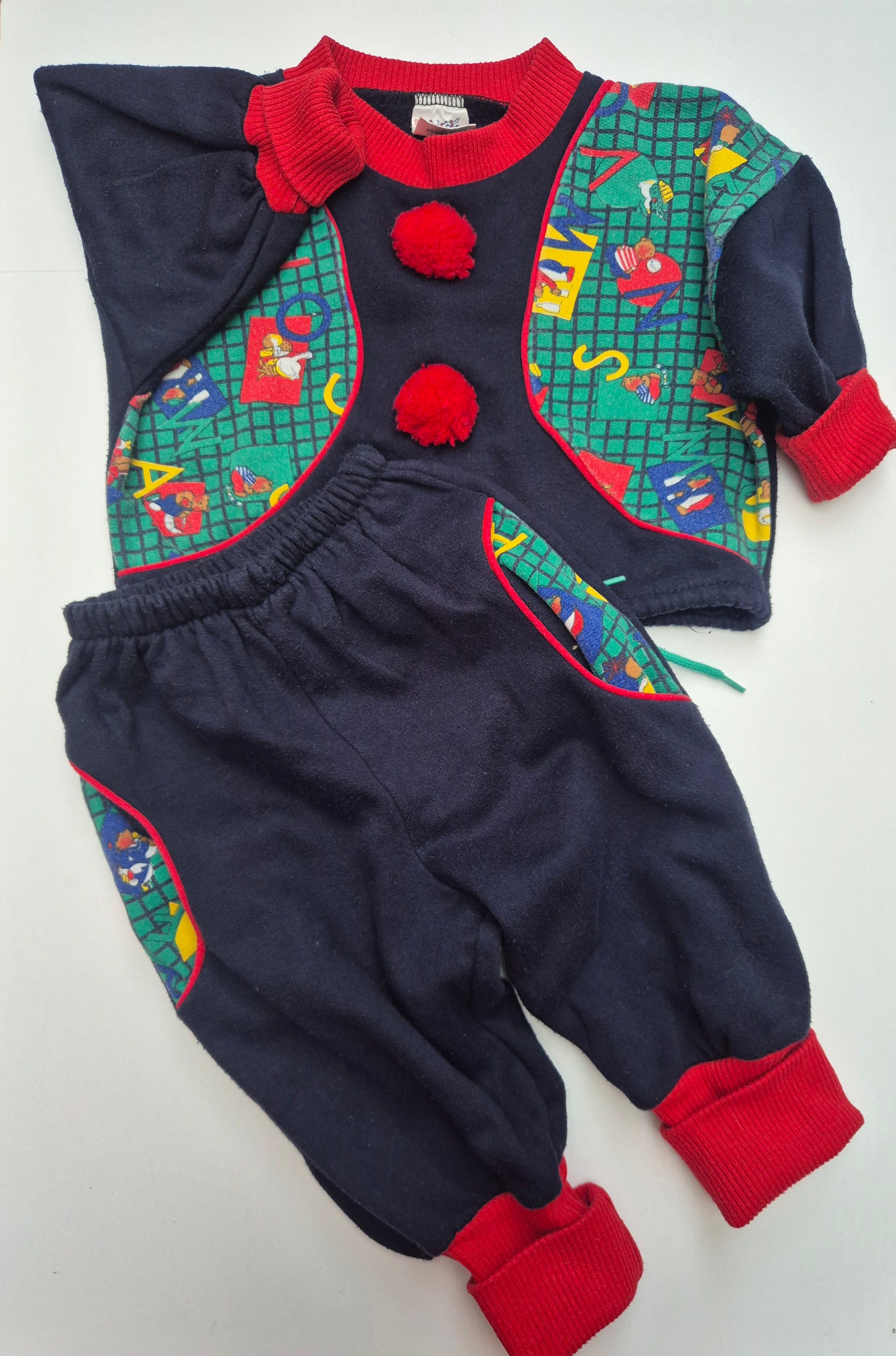 Super retro pak met speelse letters, pompons en knalrode boorden. Voor mini-clowns met stijl.