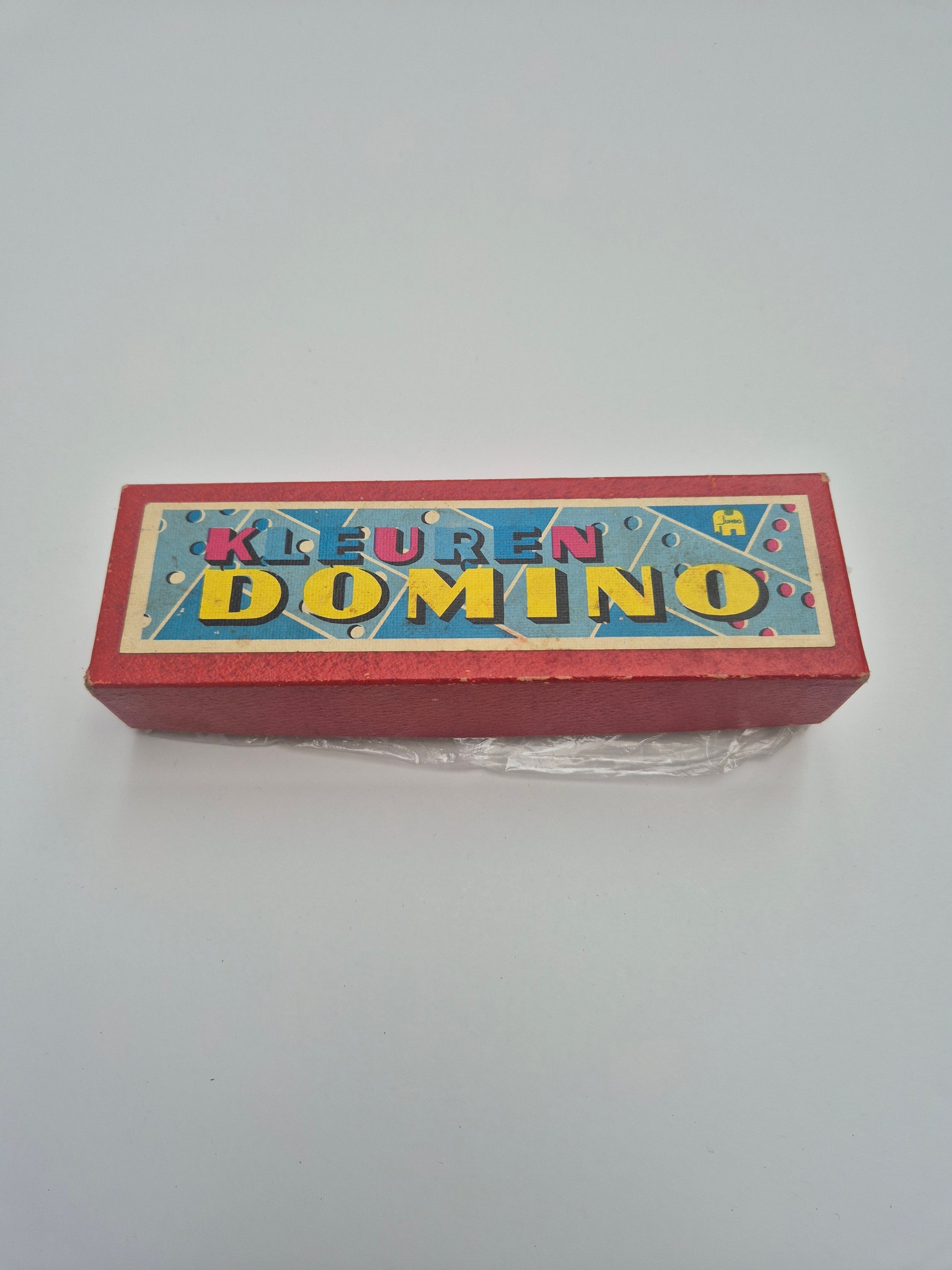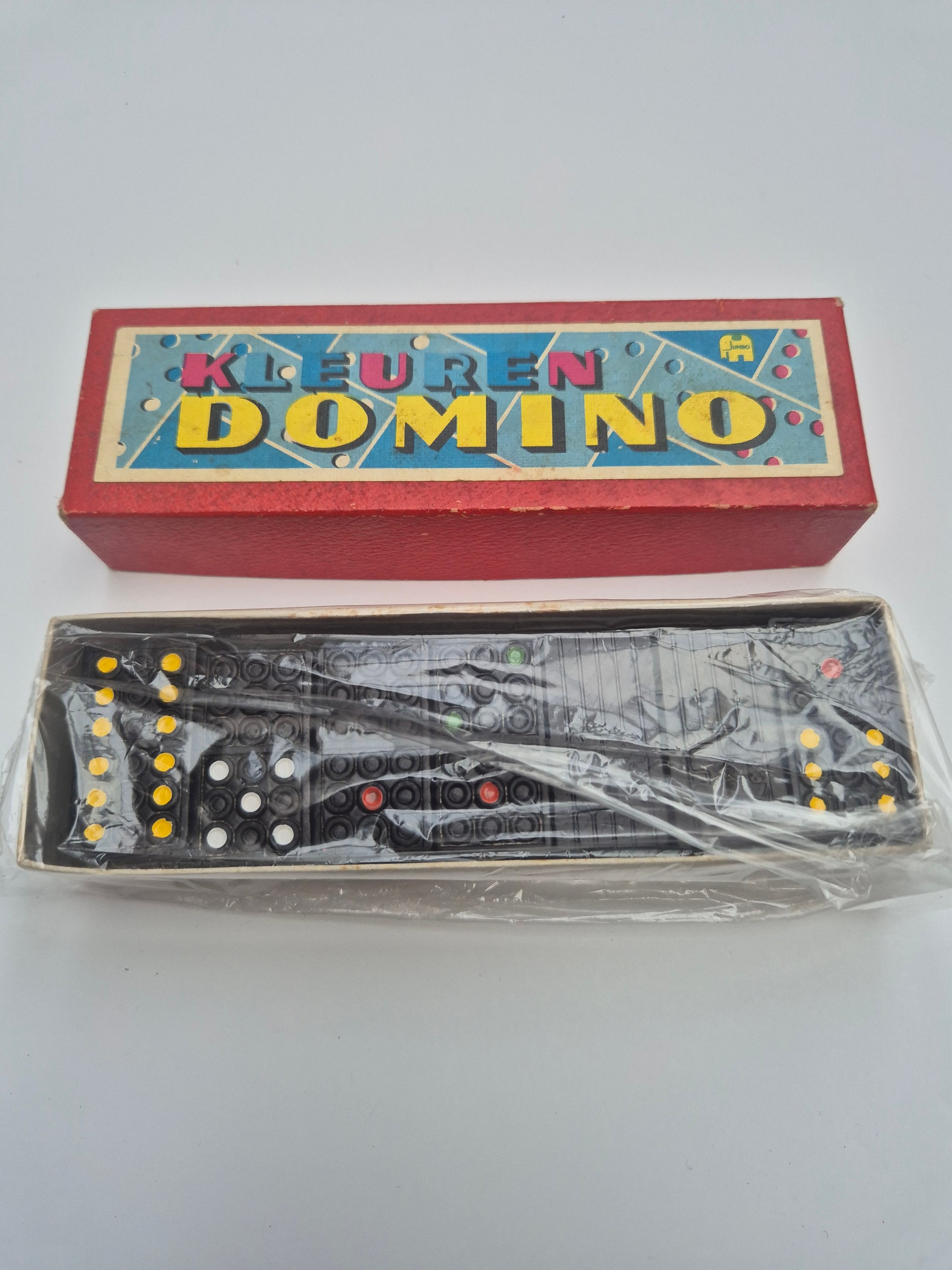 Oud vertrouwd dominospel, maar dan met vrolijke gekleurde stippen. In originele doos.
