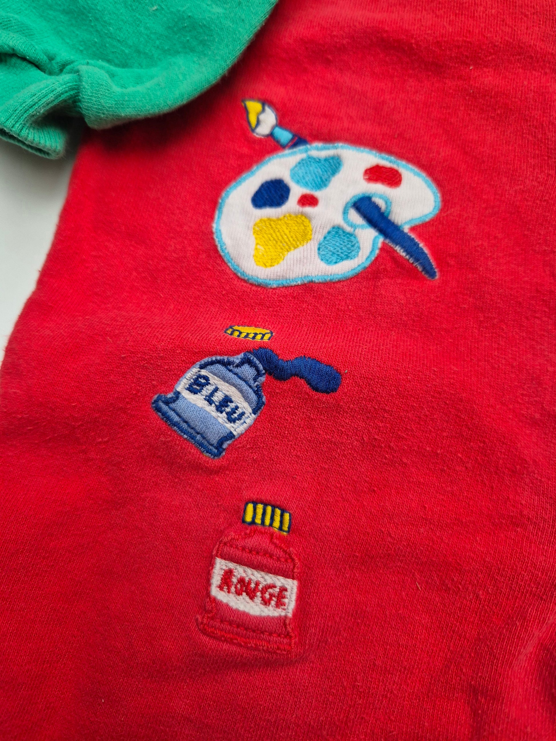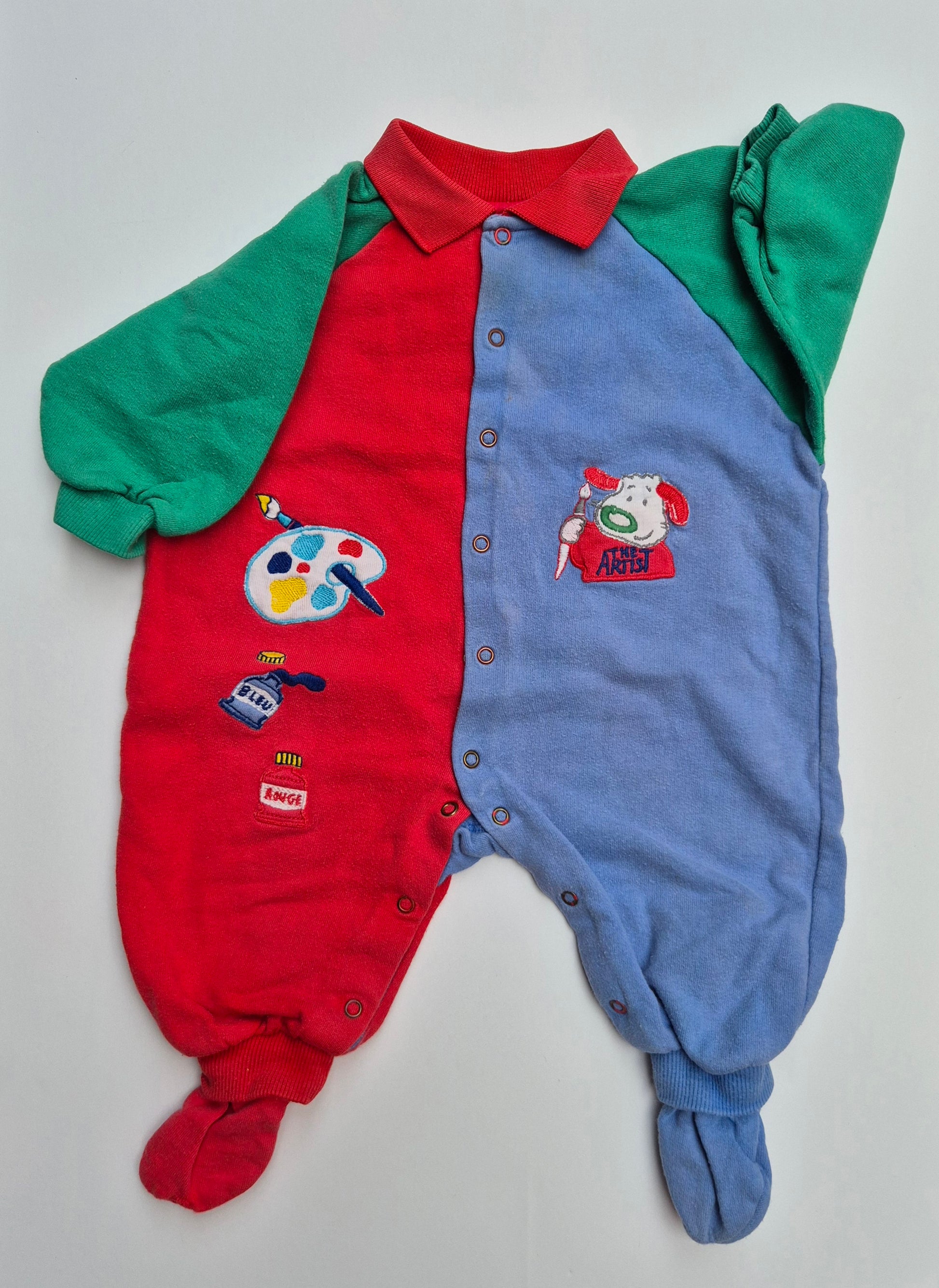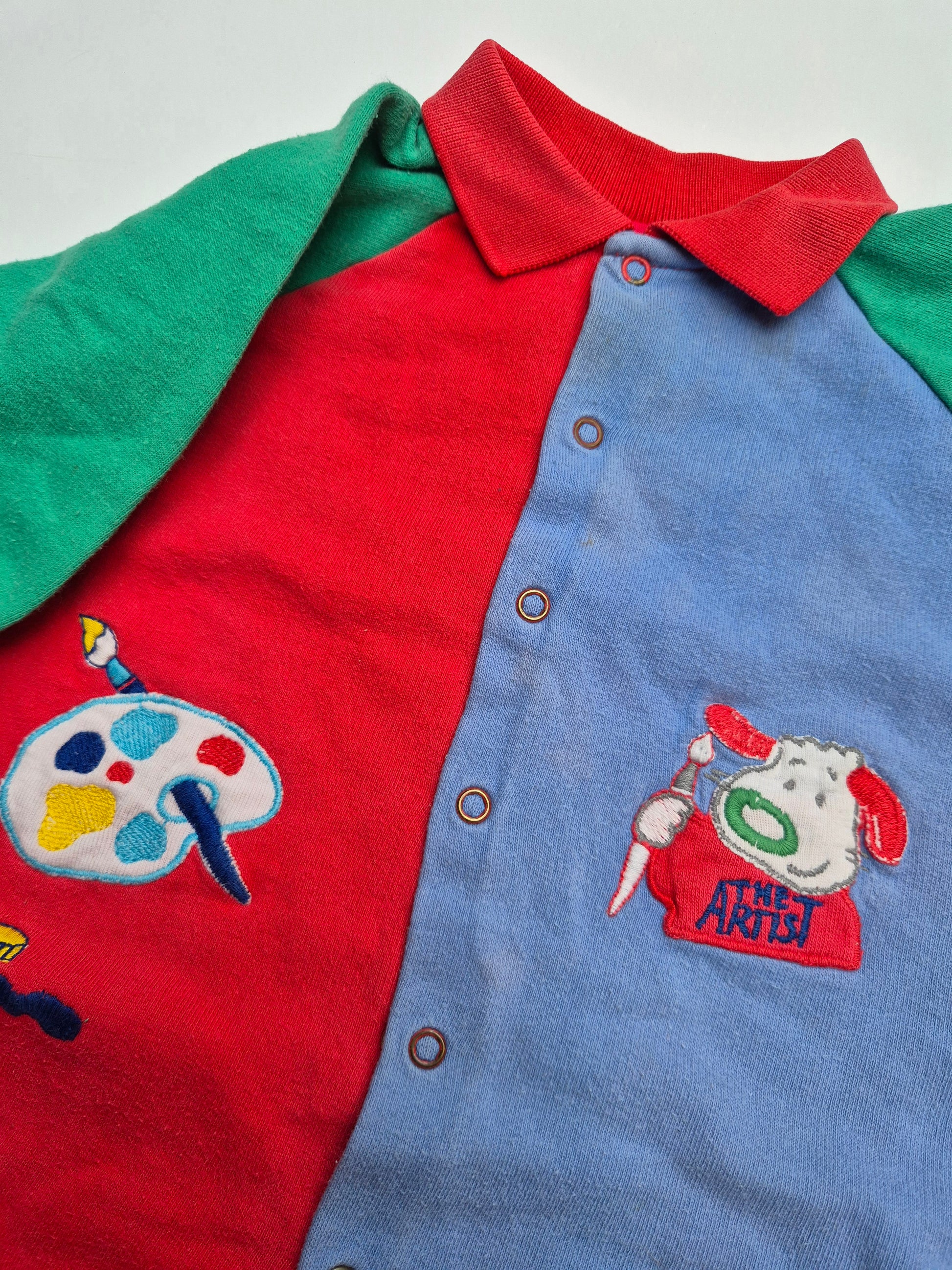 Een classic vintage pakje in rood, groen en blauw, met vrolijke borduursels van verf, kwast en een hondje ‘The Artist’. Een uniek item waarmee jouw wiebelmensje er kleurrijk op los kan kruipen.