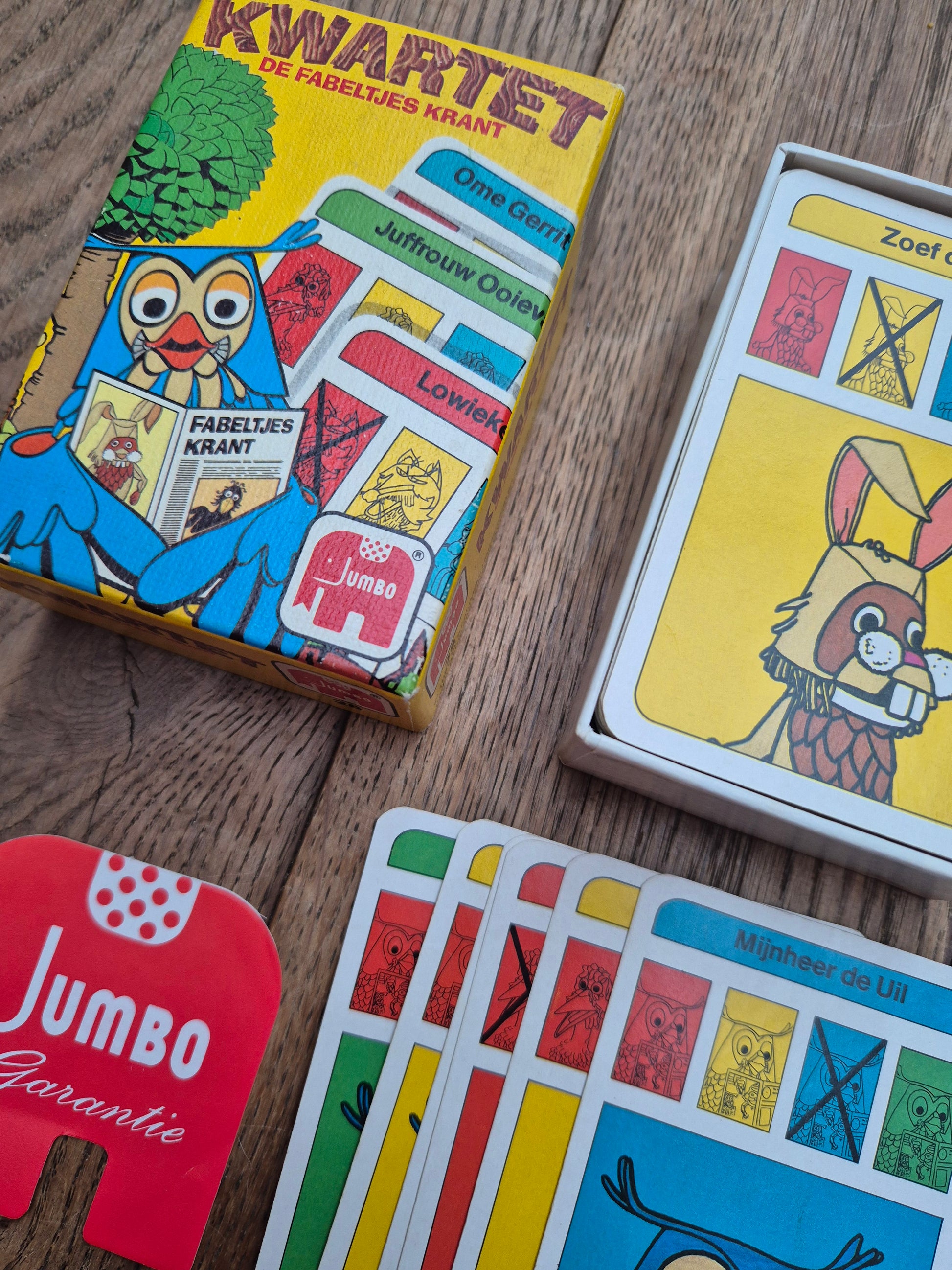 Origineel vintage kwartetspel van De Fabeltjeskrant met figuren als Mijnheer de Uil, Zoef de Haas en Juffrouw Ooievaar. Compleet spel in doos, inclusief de klassieke rode Jumbo-garantiekaart. Een nostalgisch pareltje voor jong en oud.