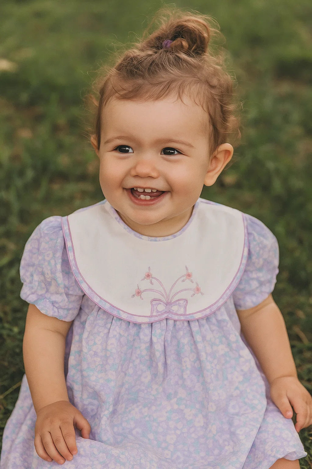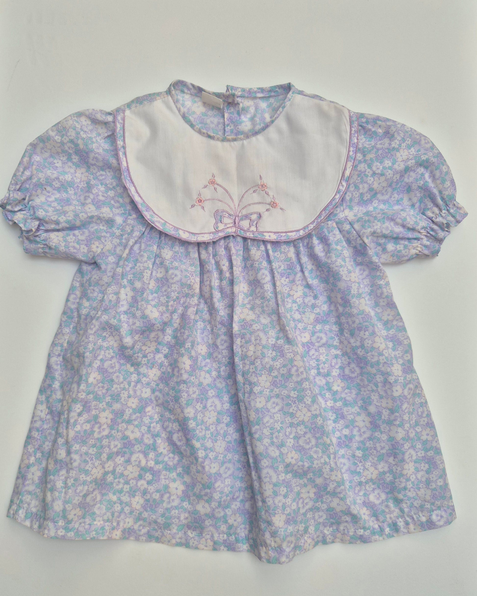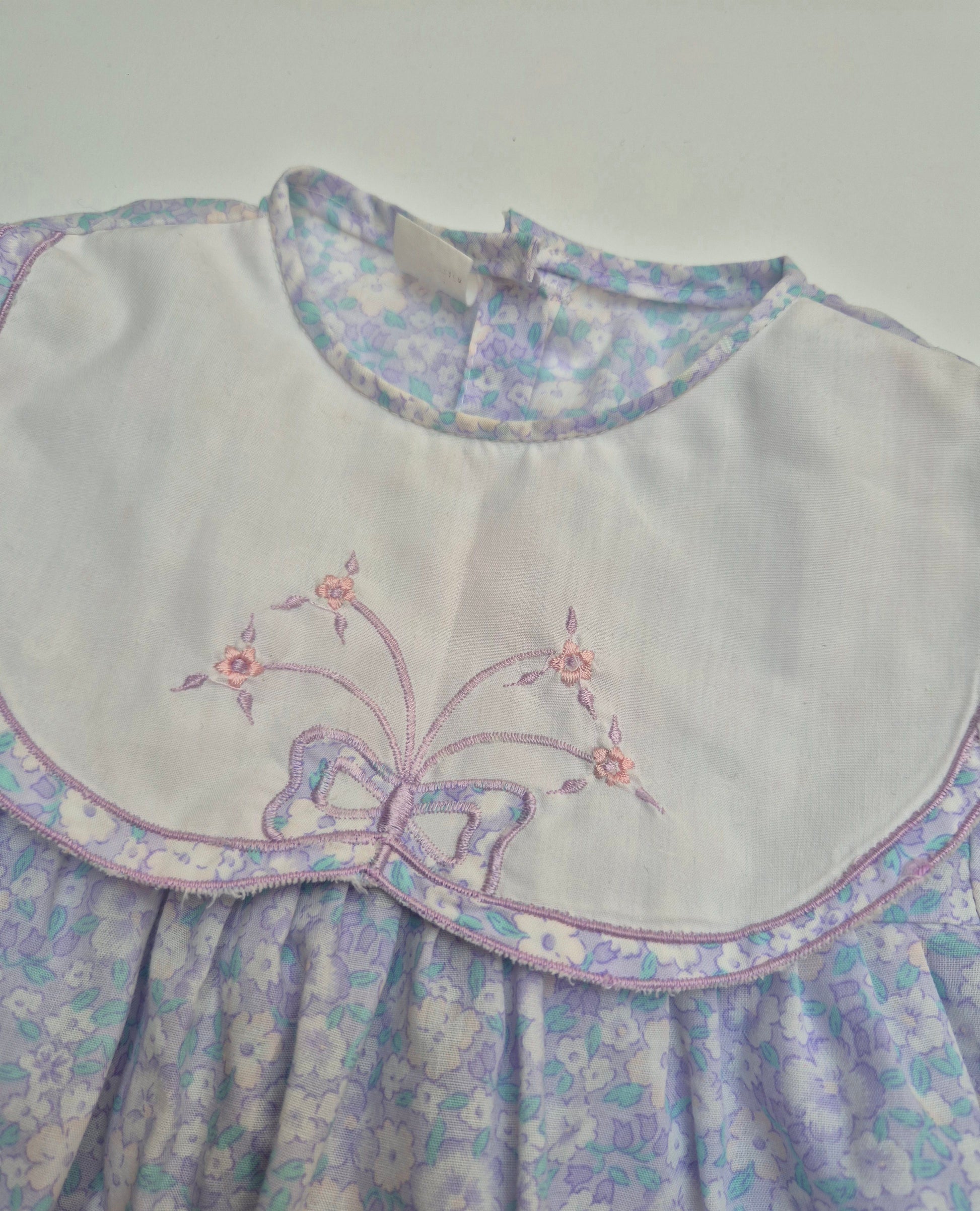 Zomers en speels: lila jurkje met bloemen en een wit kraagje. Classic vintage.