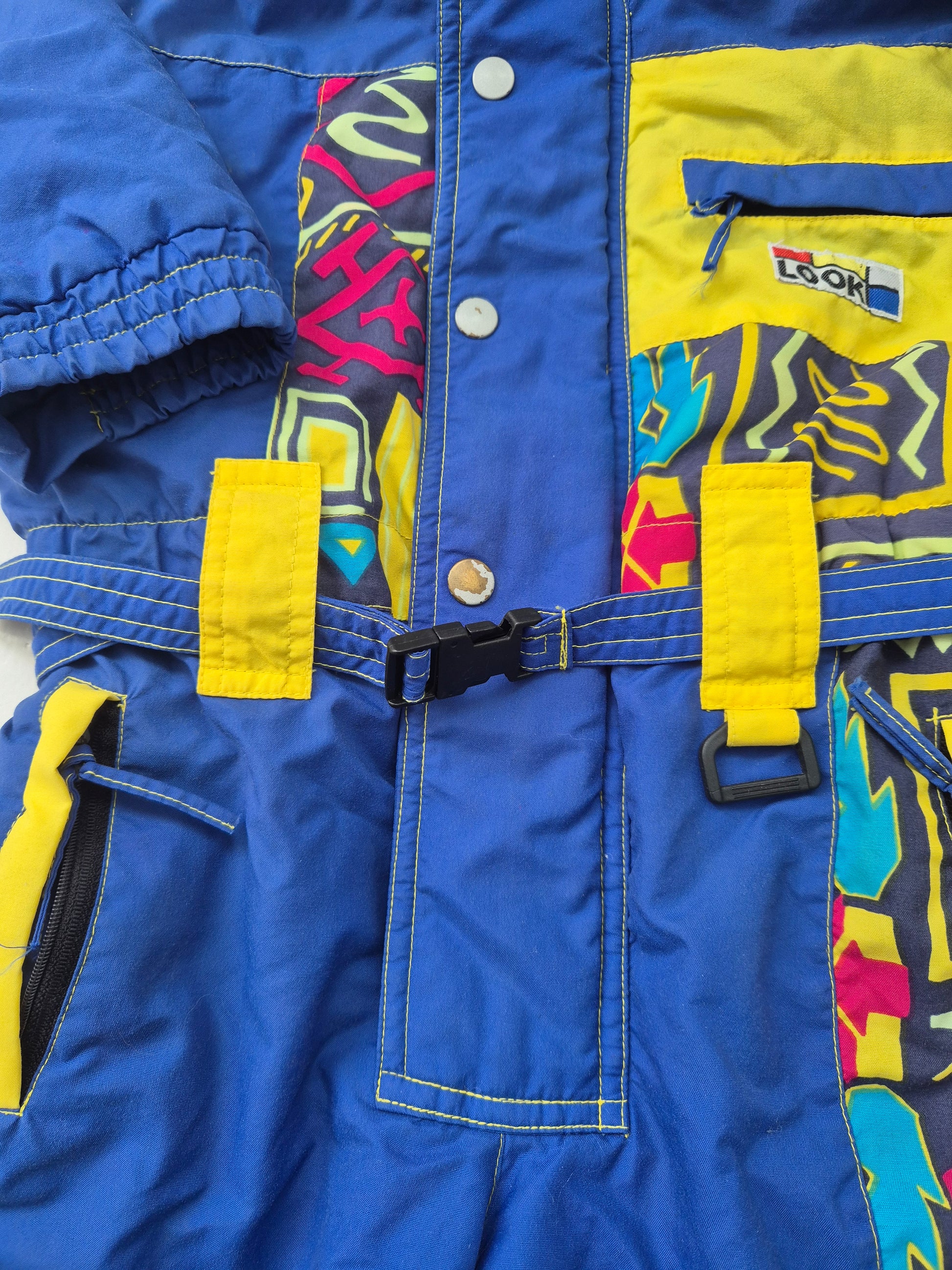 Knalblauw skipak met kleurrijke jaren 90-prints en gele details. Retro skivibes op z'n best.