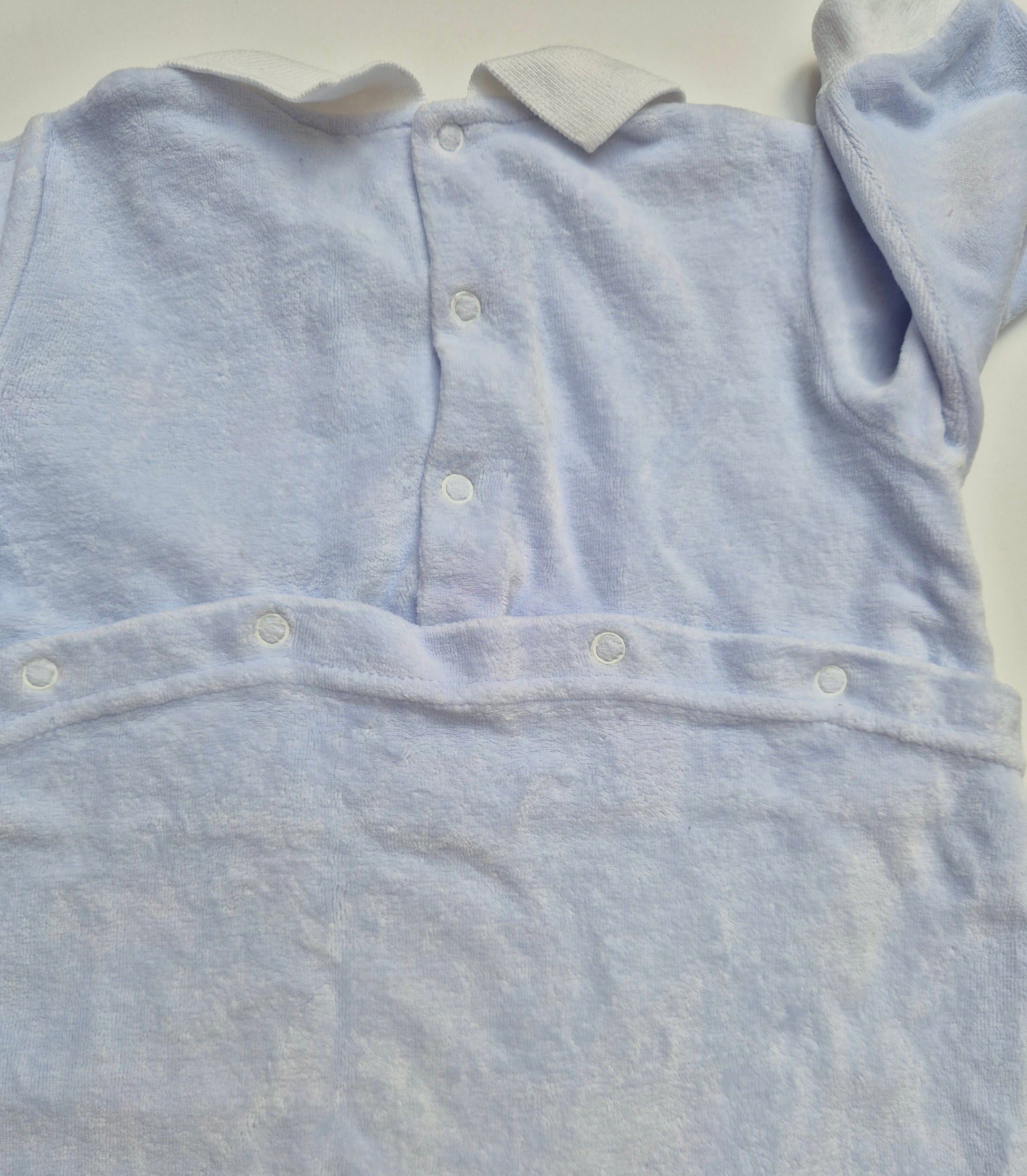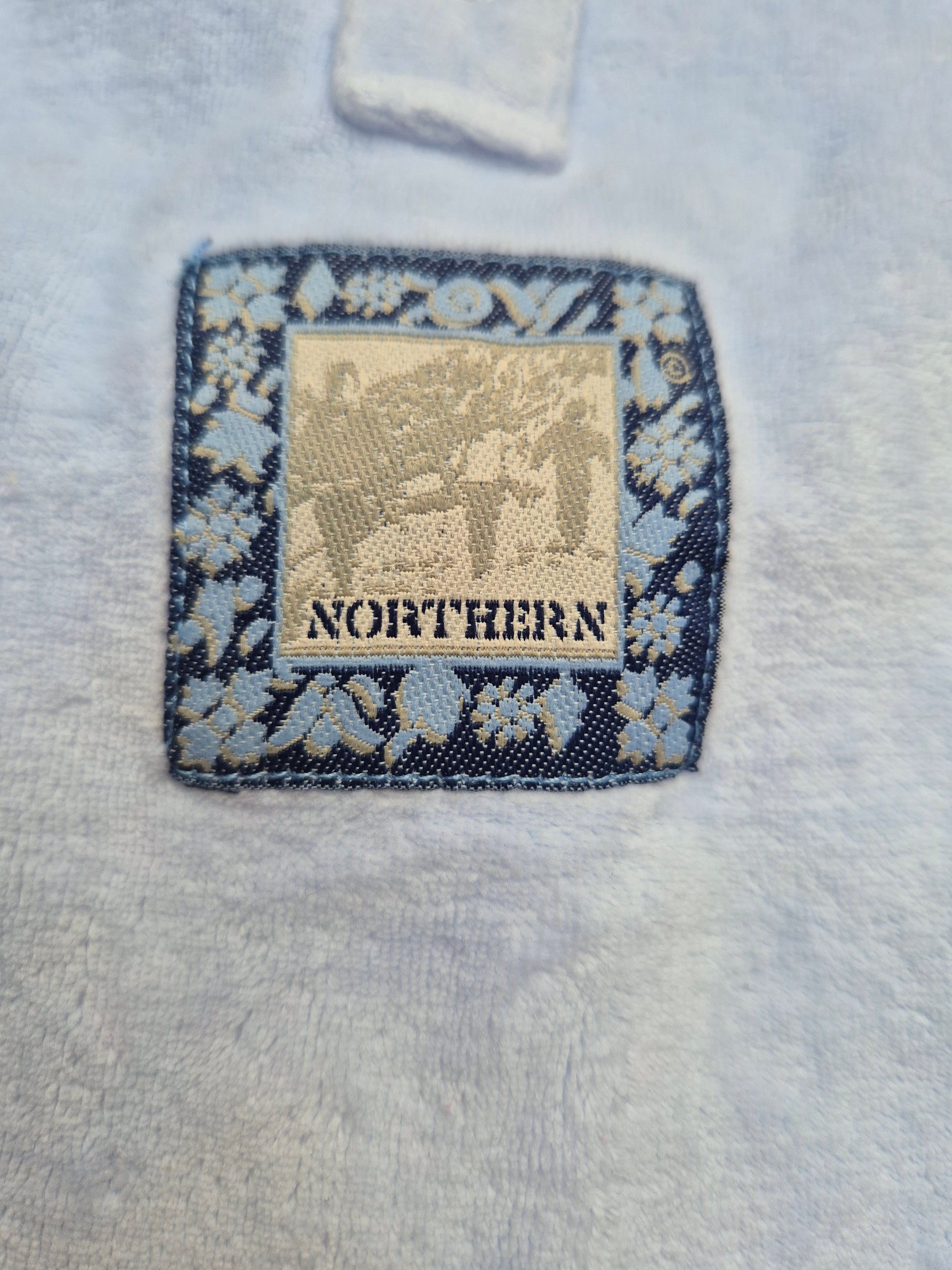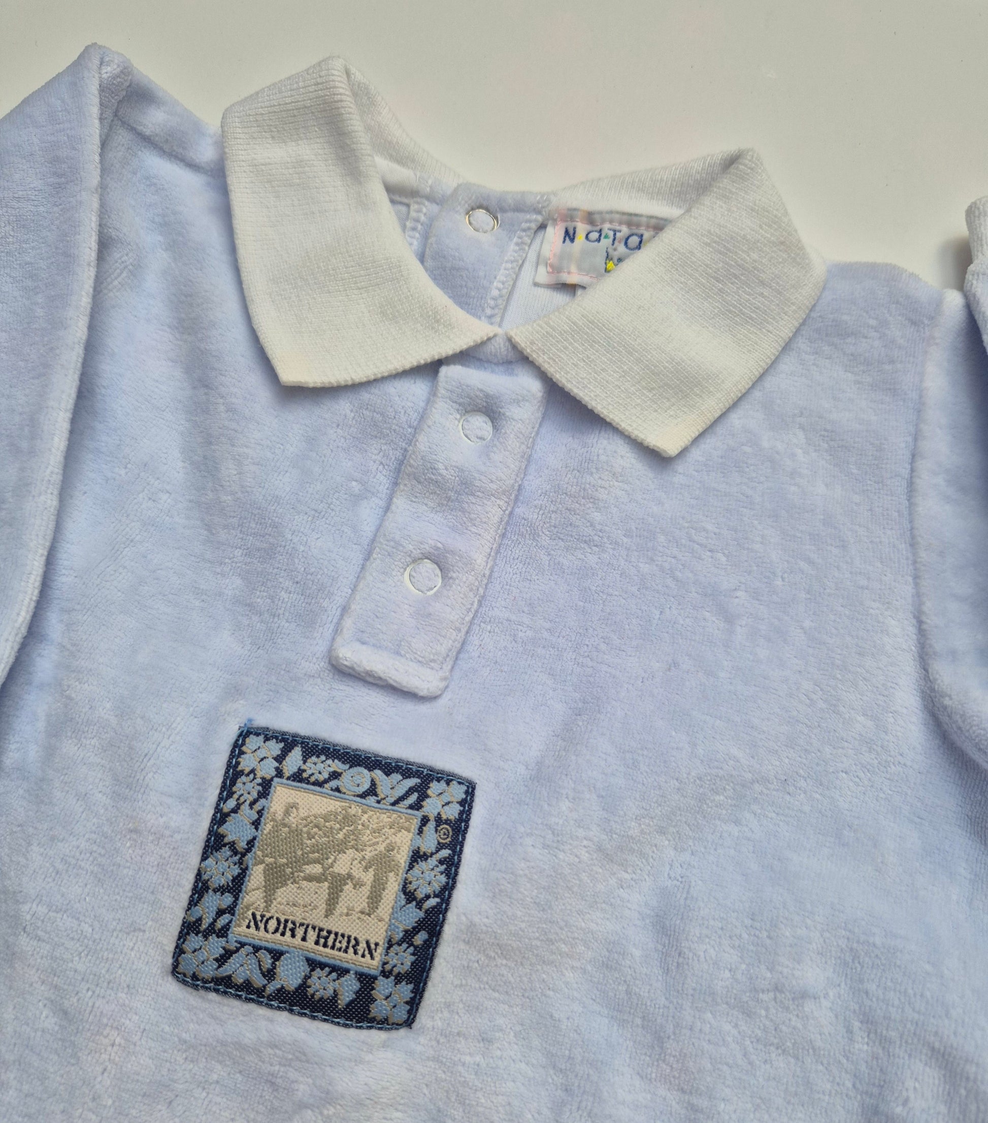 Knuffelzacht pakje in lichtblauw met witte polo-kraag en Northern patch op de borst. Met handige drukknoopjes aan de achterkant voor makkelijk uit en aantrekken.