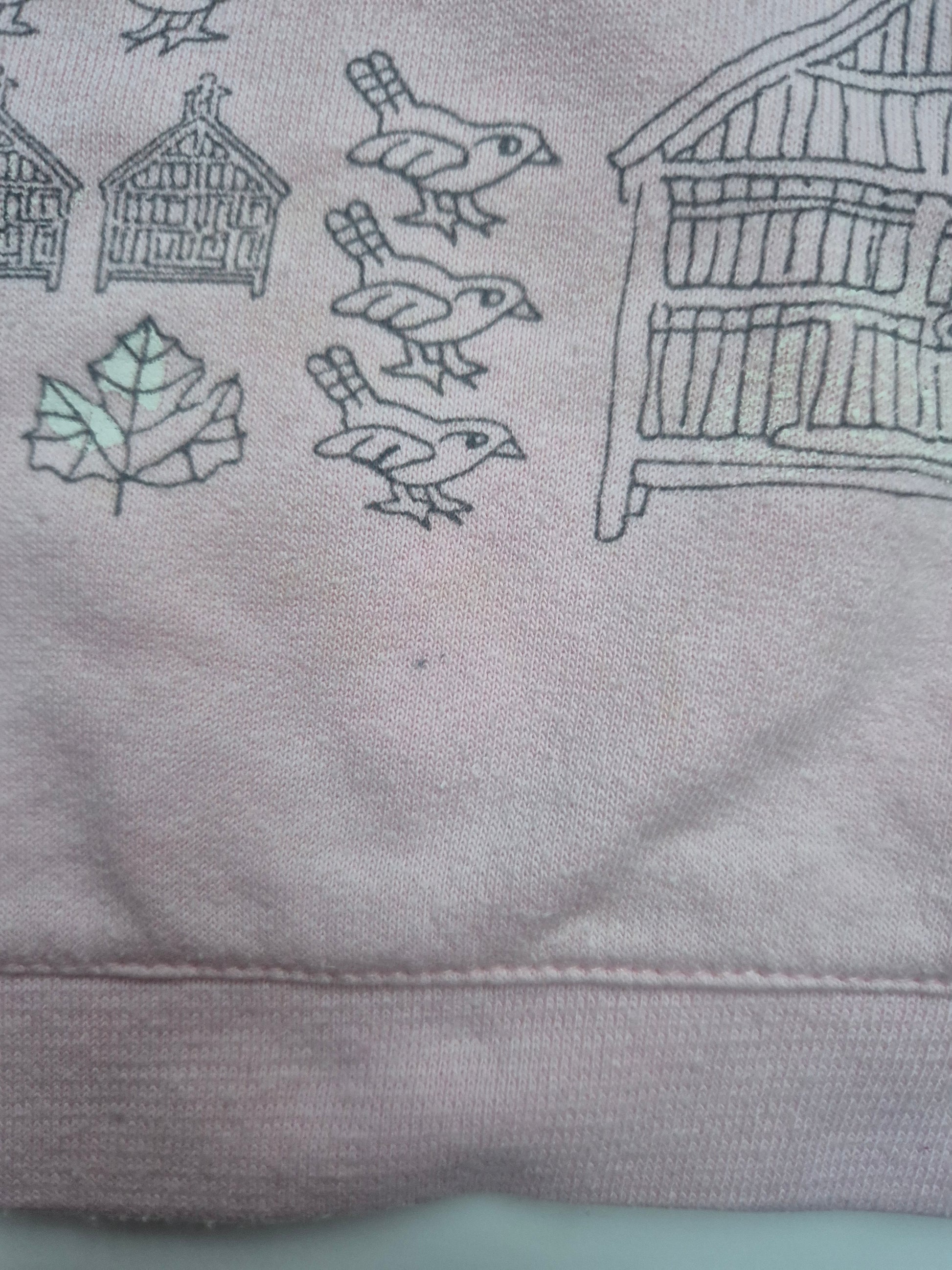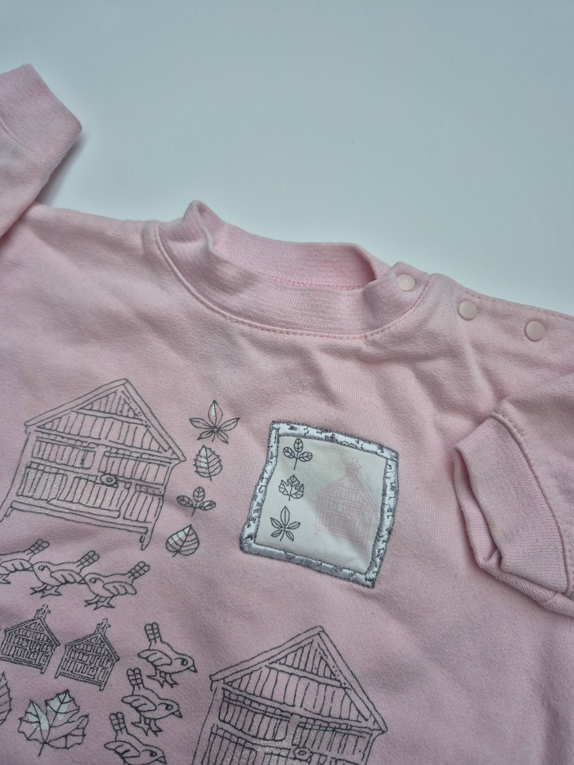Lieve roze sweater met fijne tekenstijlprint. De subtiele illustraties van huisjes en bladeren geven een dromerige, nostalgische sfeer.