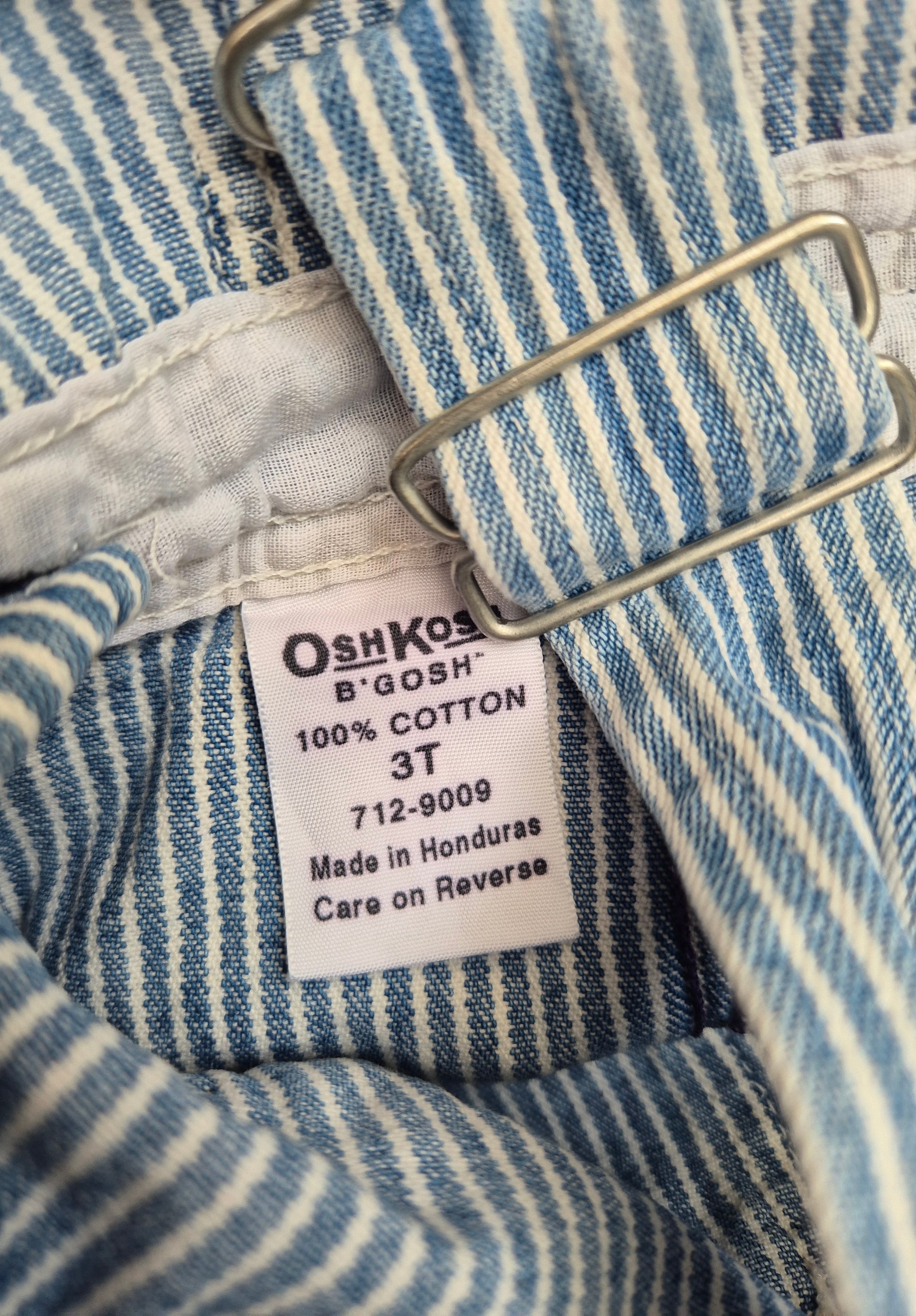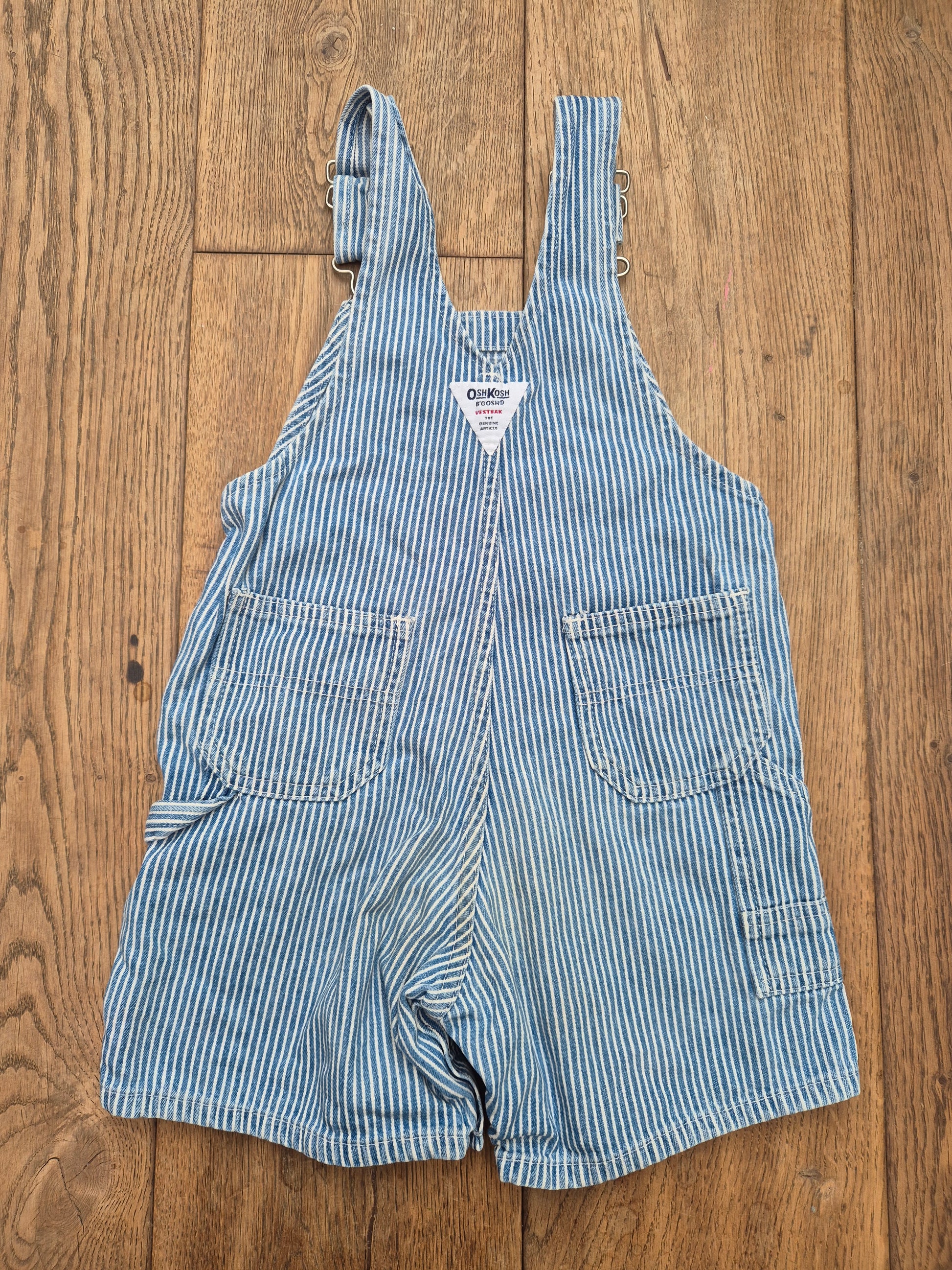 Een echte OshKosh klassieker. Stevig denim, blauw witte strepen, zakjes en die herkenbare retro uitstraling.