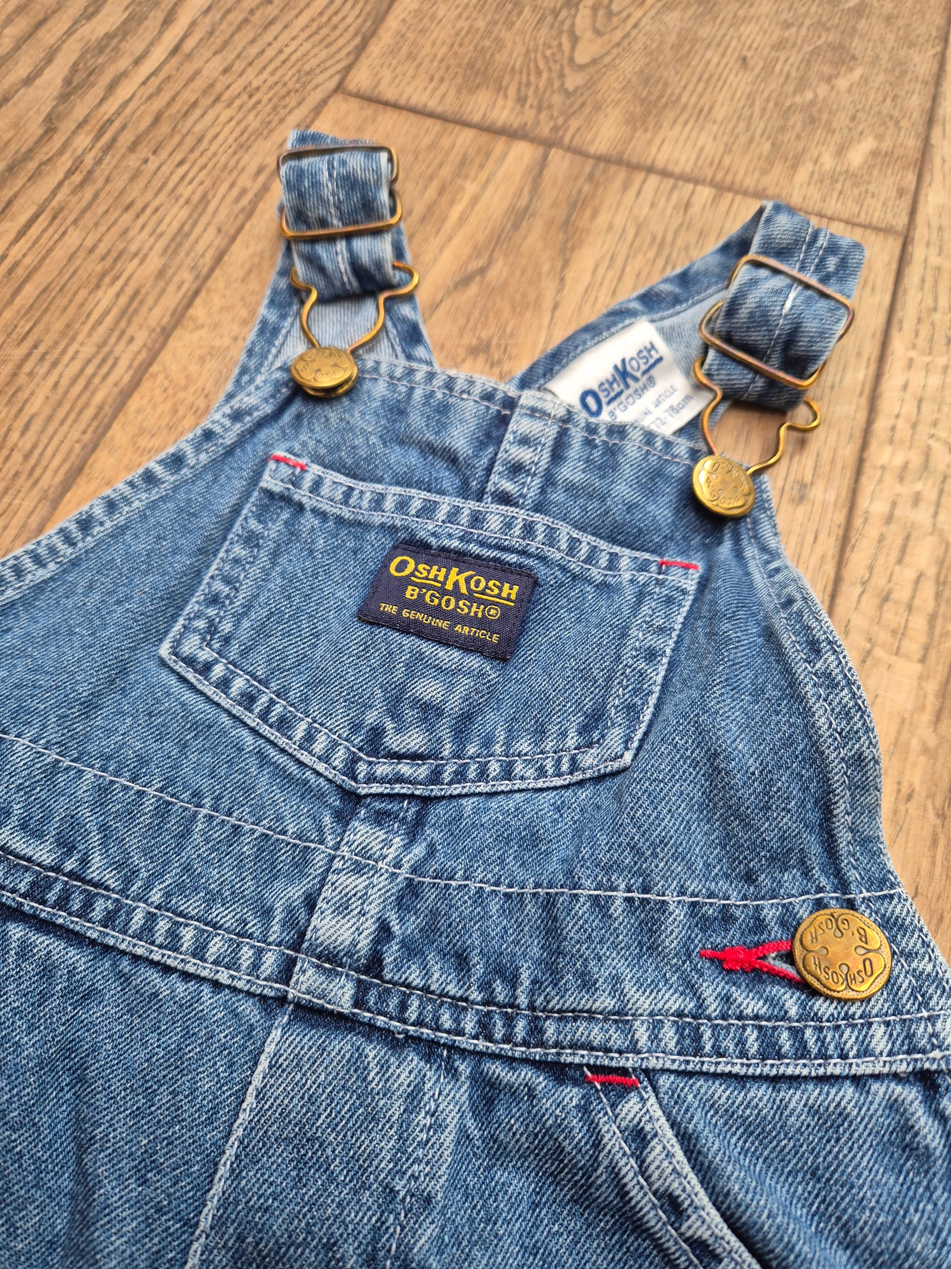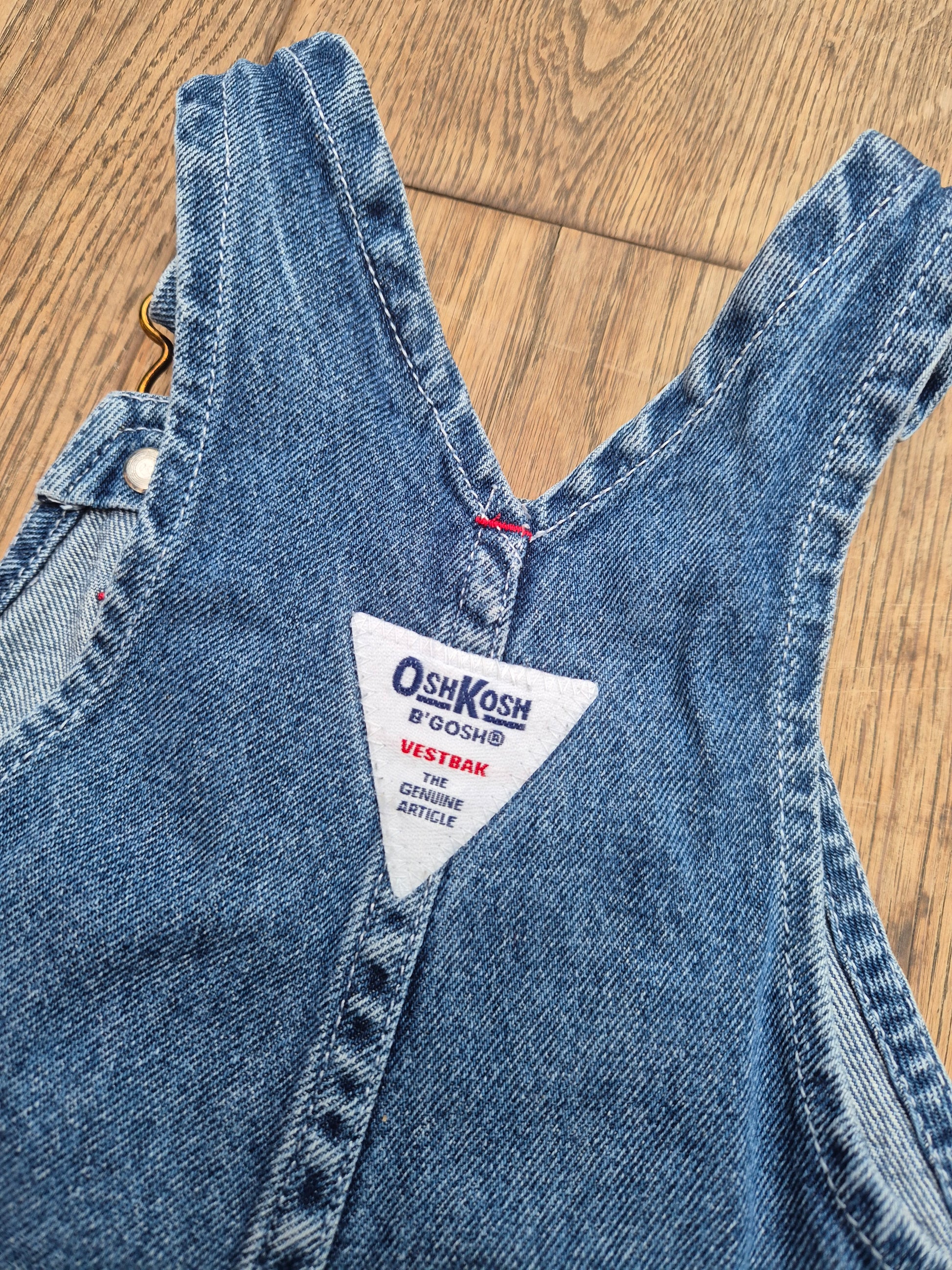 Echte vintage klassieker van OshKosh in stoer denim. Met verstelbare bandjes, gouden knoopjes en rode stiksels. Een tijdloos stuk dat elke outfit een dosis nostalgie geeft.