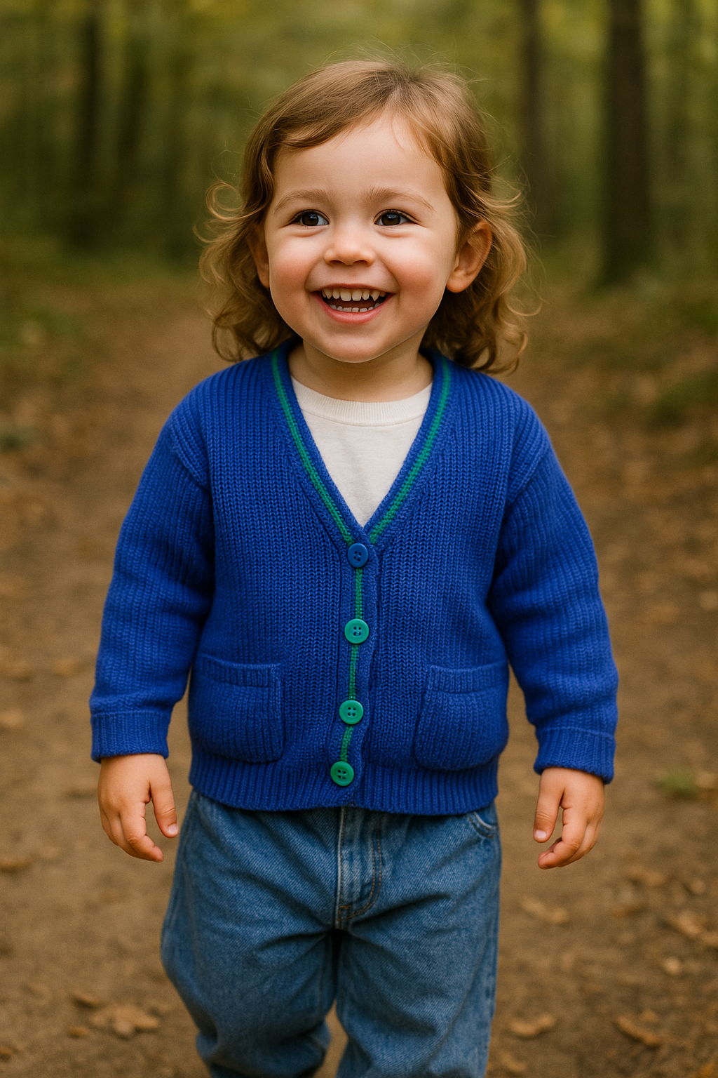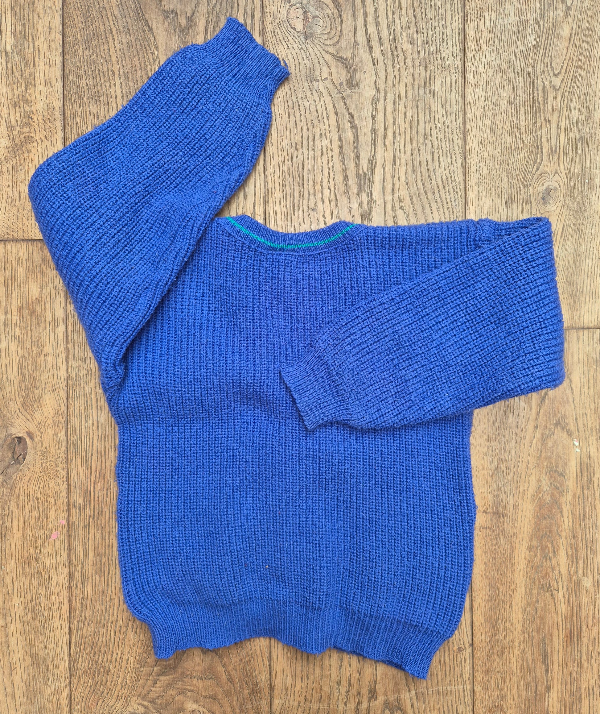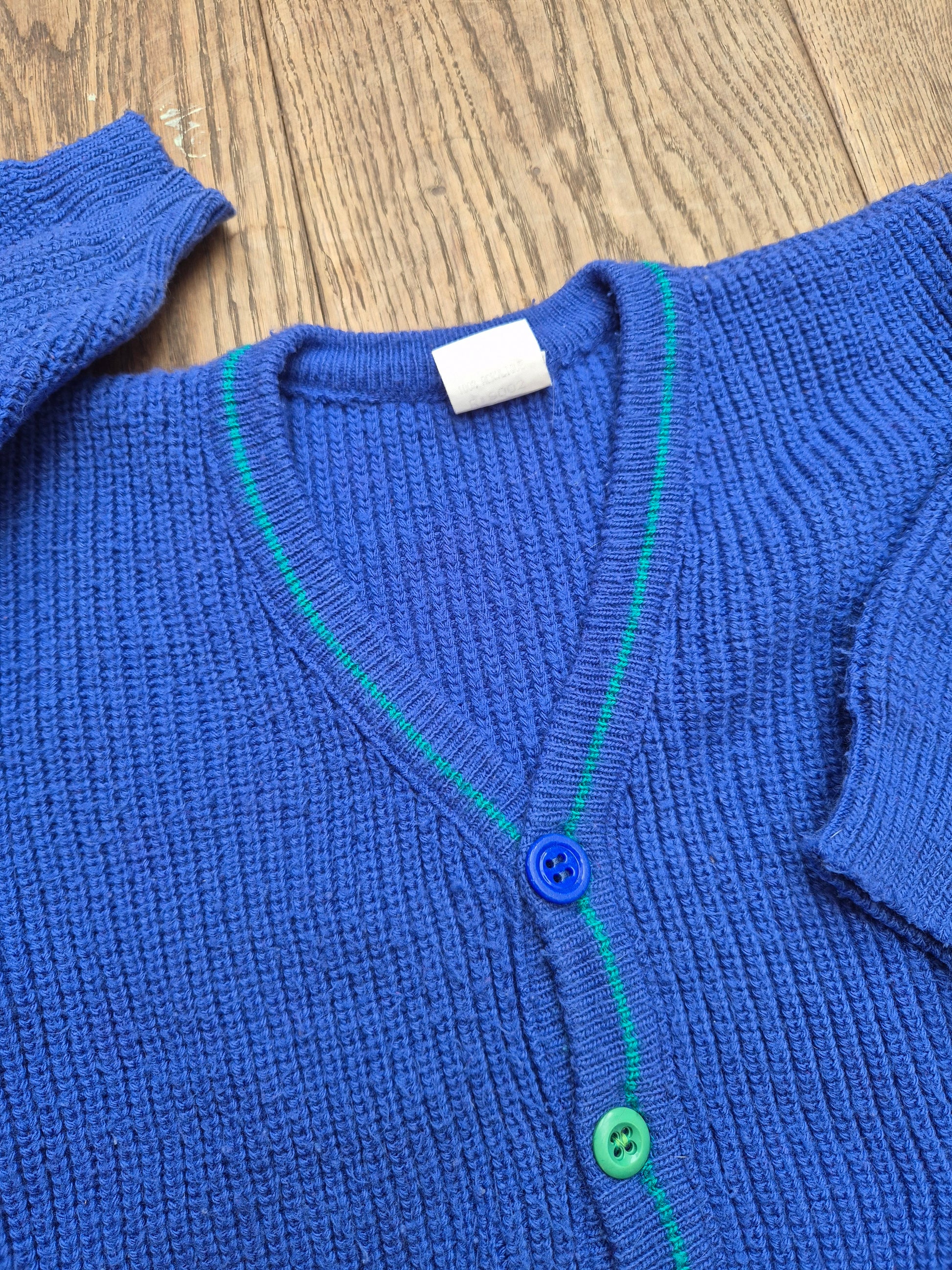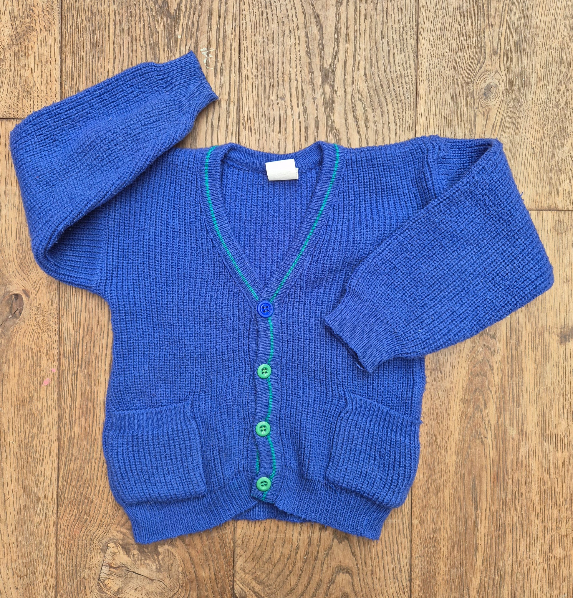 Vintage vest in het paars met contrasterende groene en blauwe knoopjes. Zachte wolmix, lekker warm en een vrolijke blikvanger voor frisse dagen.