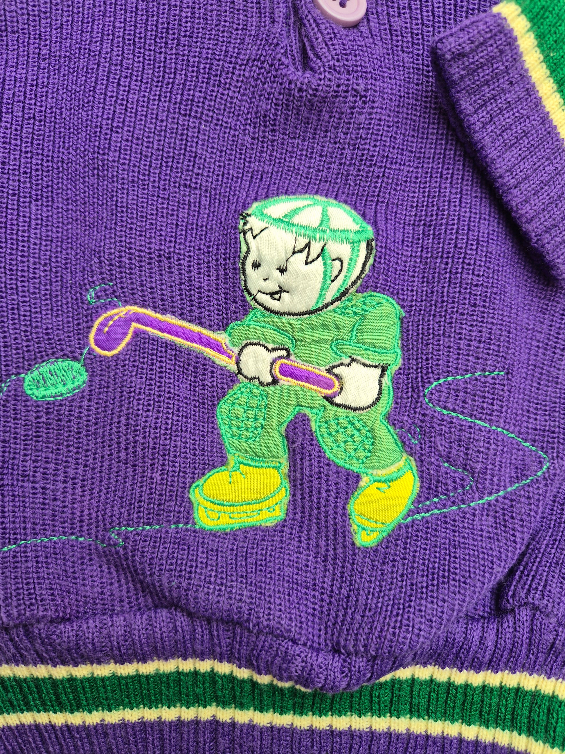 Unieke vintage trui in paars met borduursel van een ijshockeyspeler, wat een parel is dit.