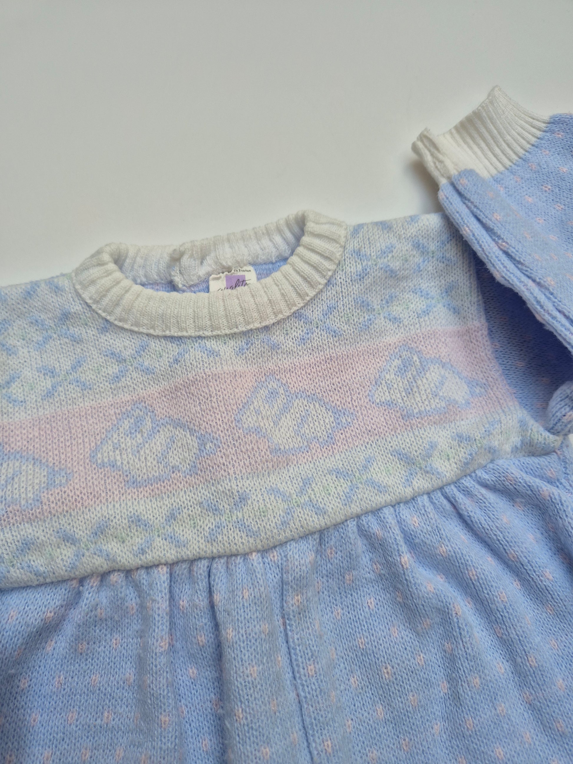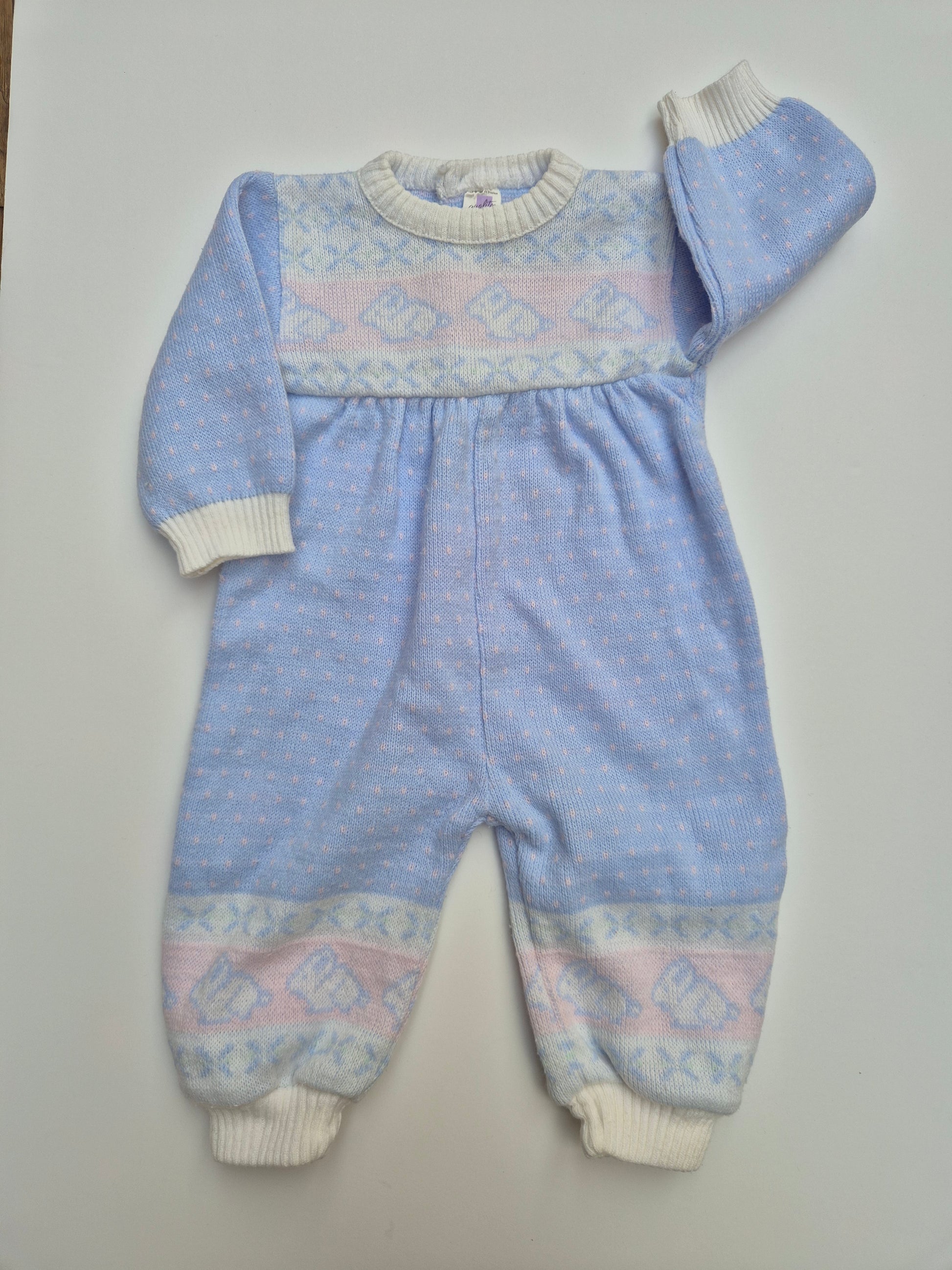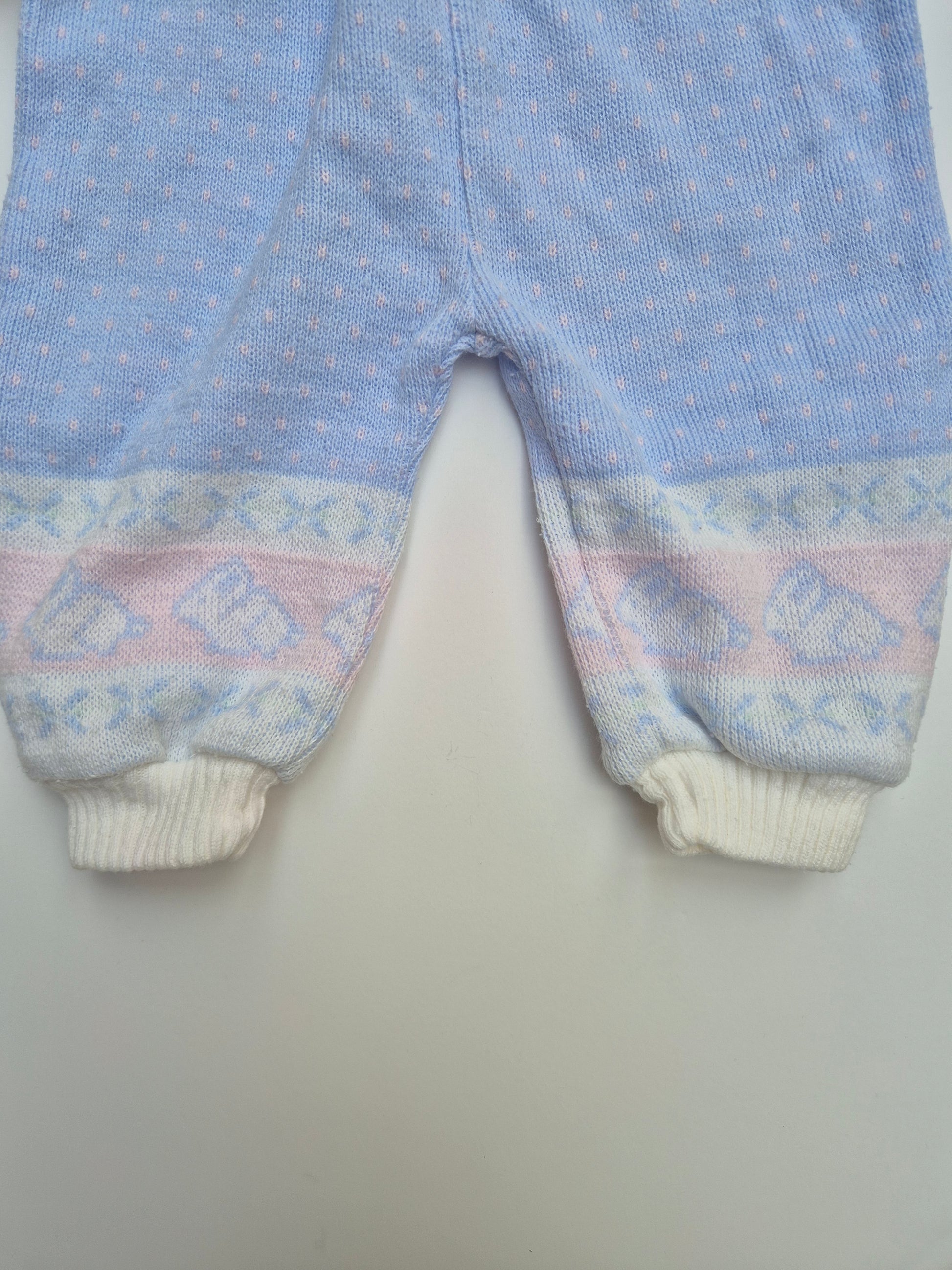 Zacht gebreid pak in pastelblauw met subtiele kerstvibes print. Warm, comfortabel en vol lieve retro-details.