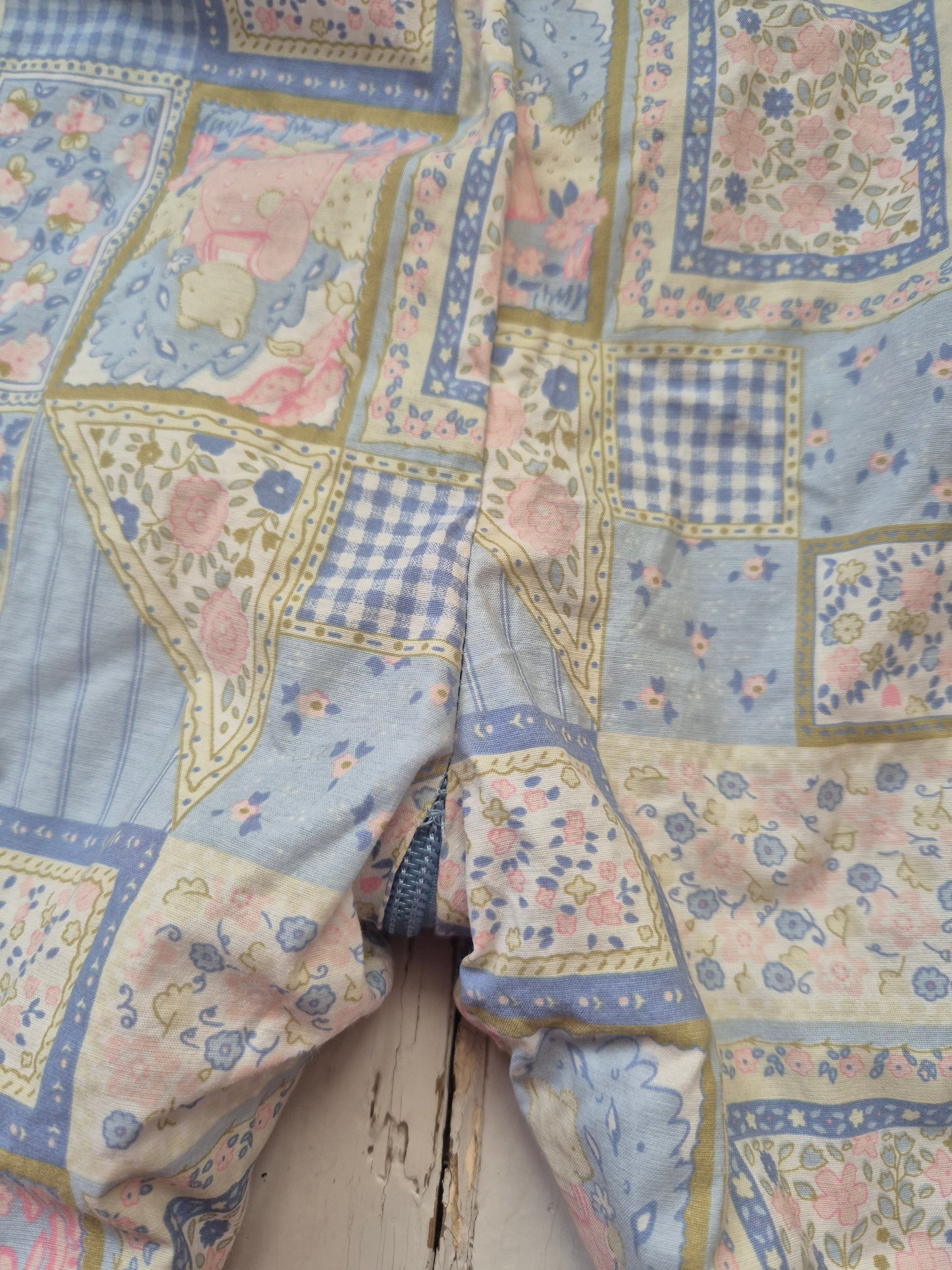 Zacht skipak in dromerige pastelkleuren met patchworkprint. Lichtblauw met tinten roze, lila en geel. Heerlijk gevoerd en met capuchon, perfect voor de allerkleinsten in de winter. Meer vintage dan dit krijg je het niet!