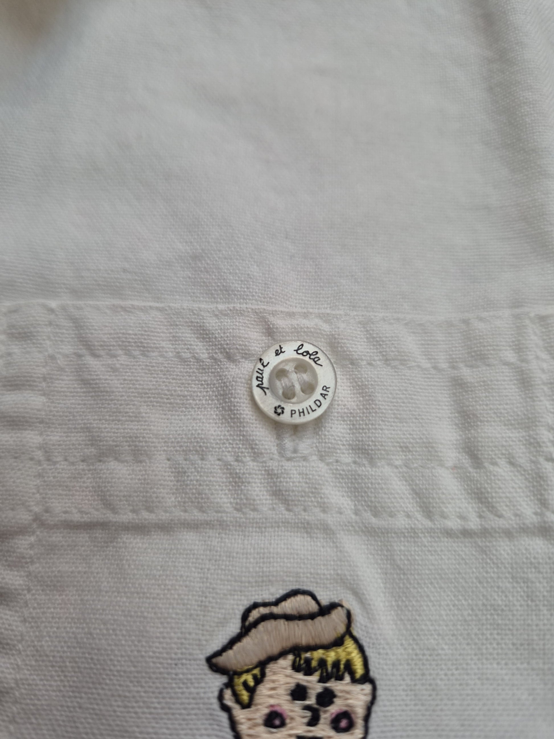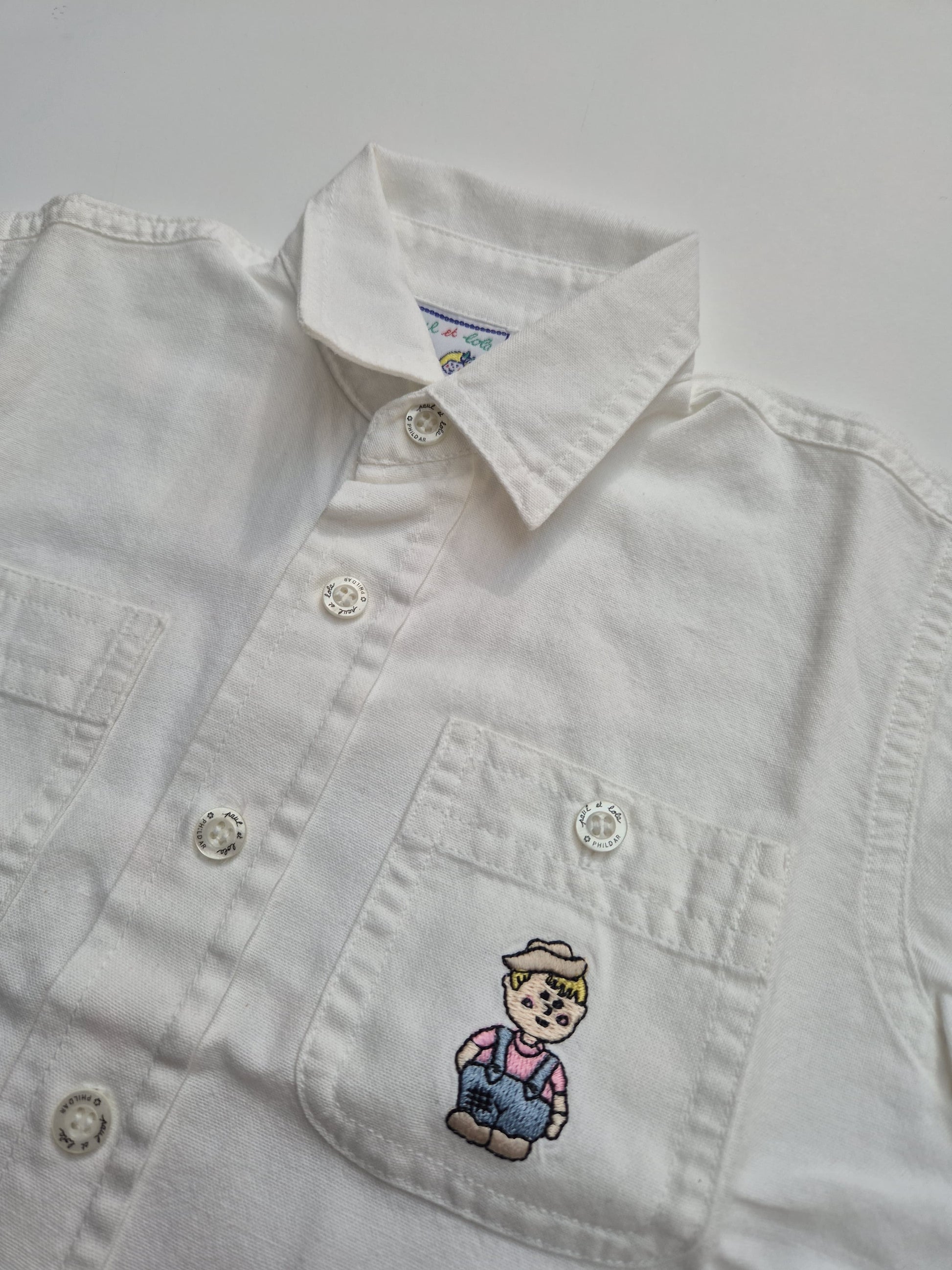 Klassiek wit overhemd van stevig katoen met boorden, details op de knoopjes en een vrolijk boertje op de borstzak. Stoer én lief, ideaal voor elke gelegenheid.