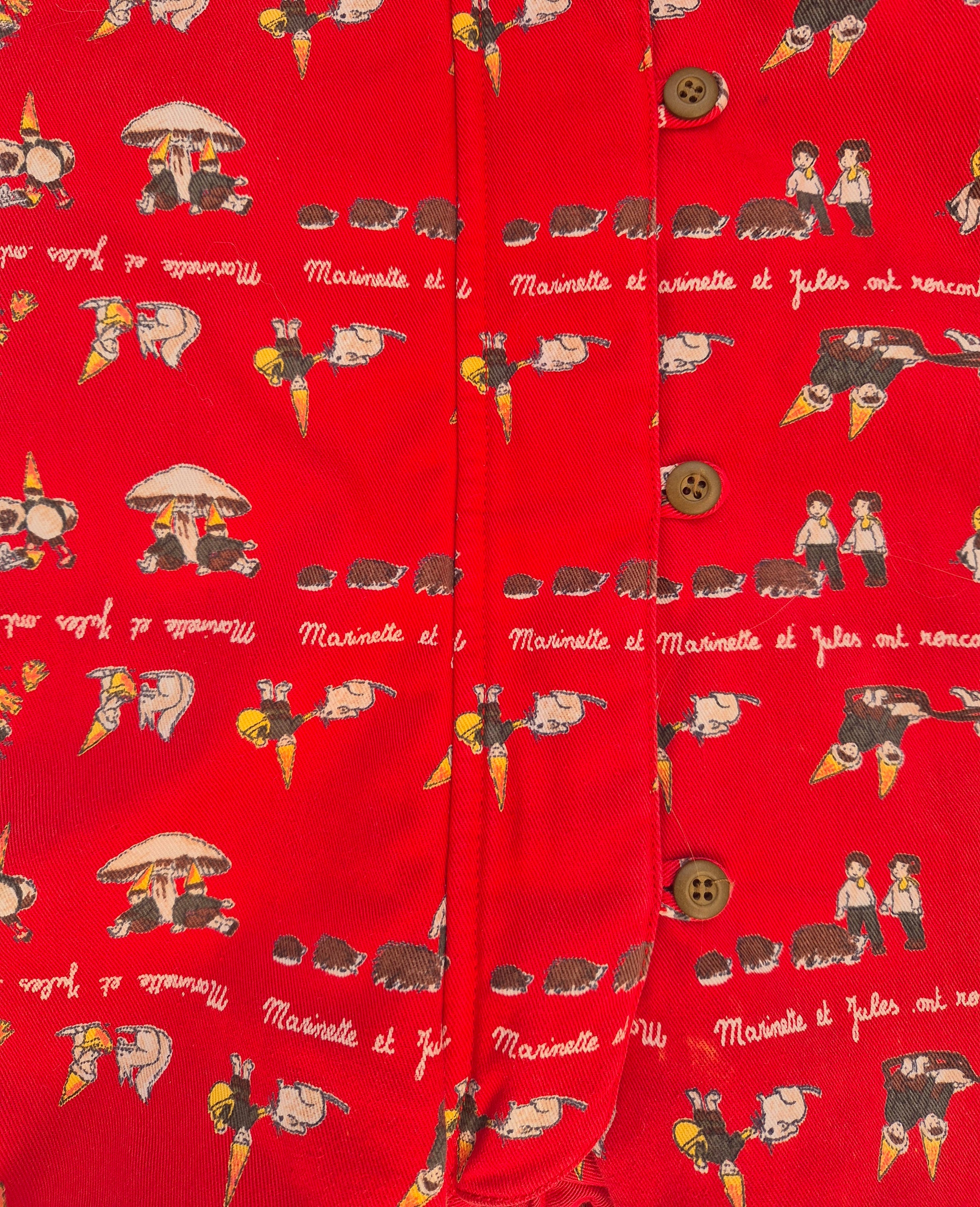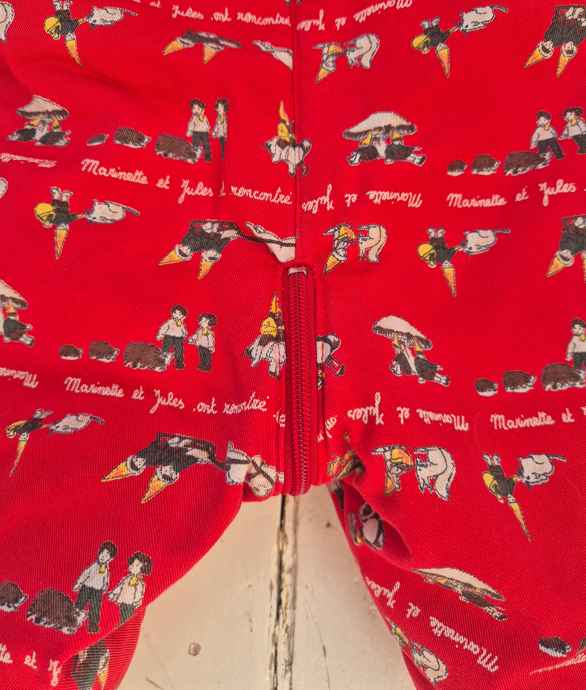 Deze rode eyecatcher is dik gevoerd en bezaaid met vrolijke figuurtjes.