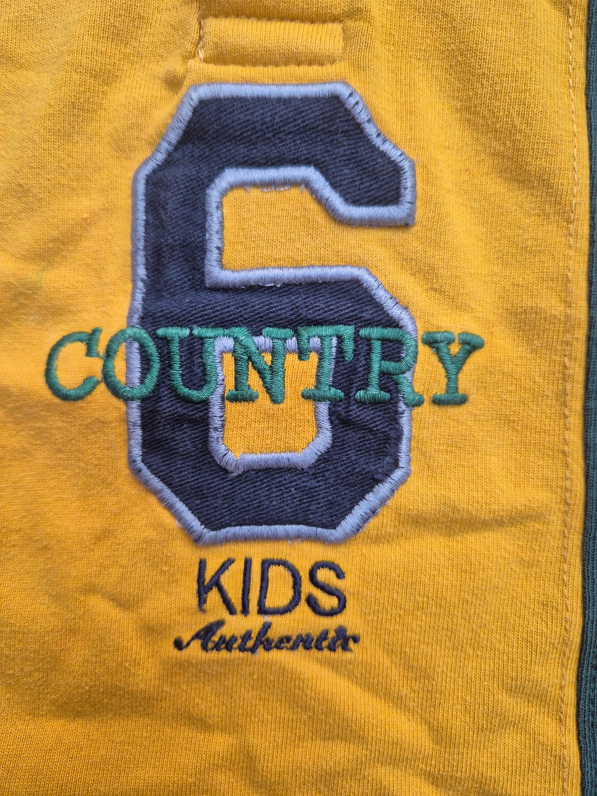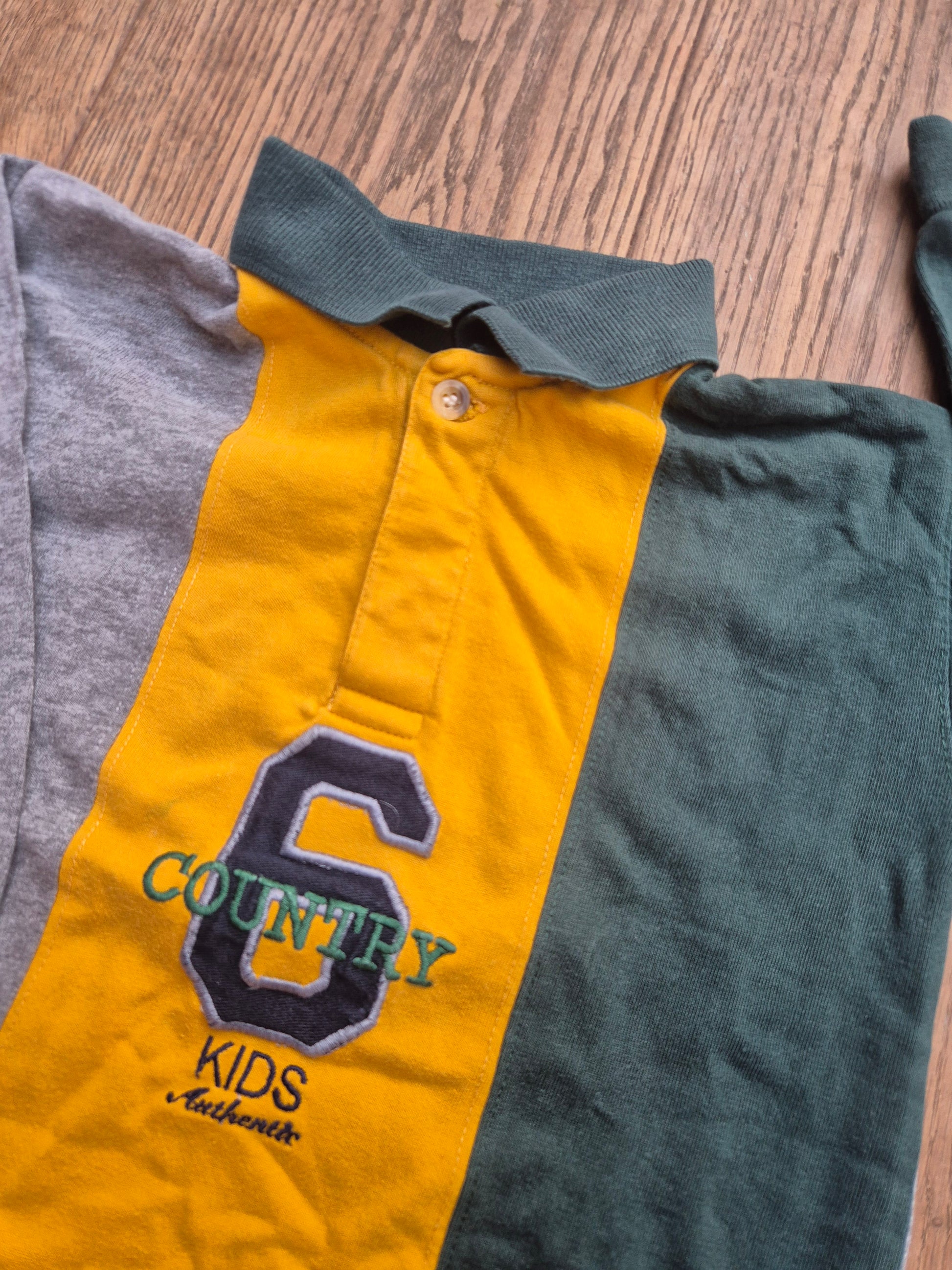 Een stoere colourblock polo rugby top voor kleine avonturiers. Met diepe groentinten, zacht grijs en een gele baan die meteen opvalt. De grote 6 op de voorkant maakt het extra retro sporty. Perfect voor ravotten, spelen en buiten ontdekken.