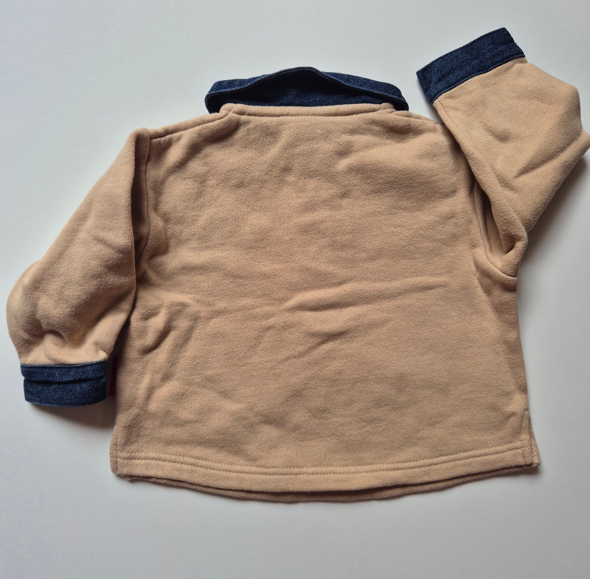 Beige longsleeve polo met donkerblauwe kraag in jeans look. Sportief en speels.