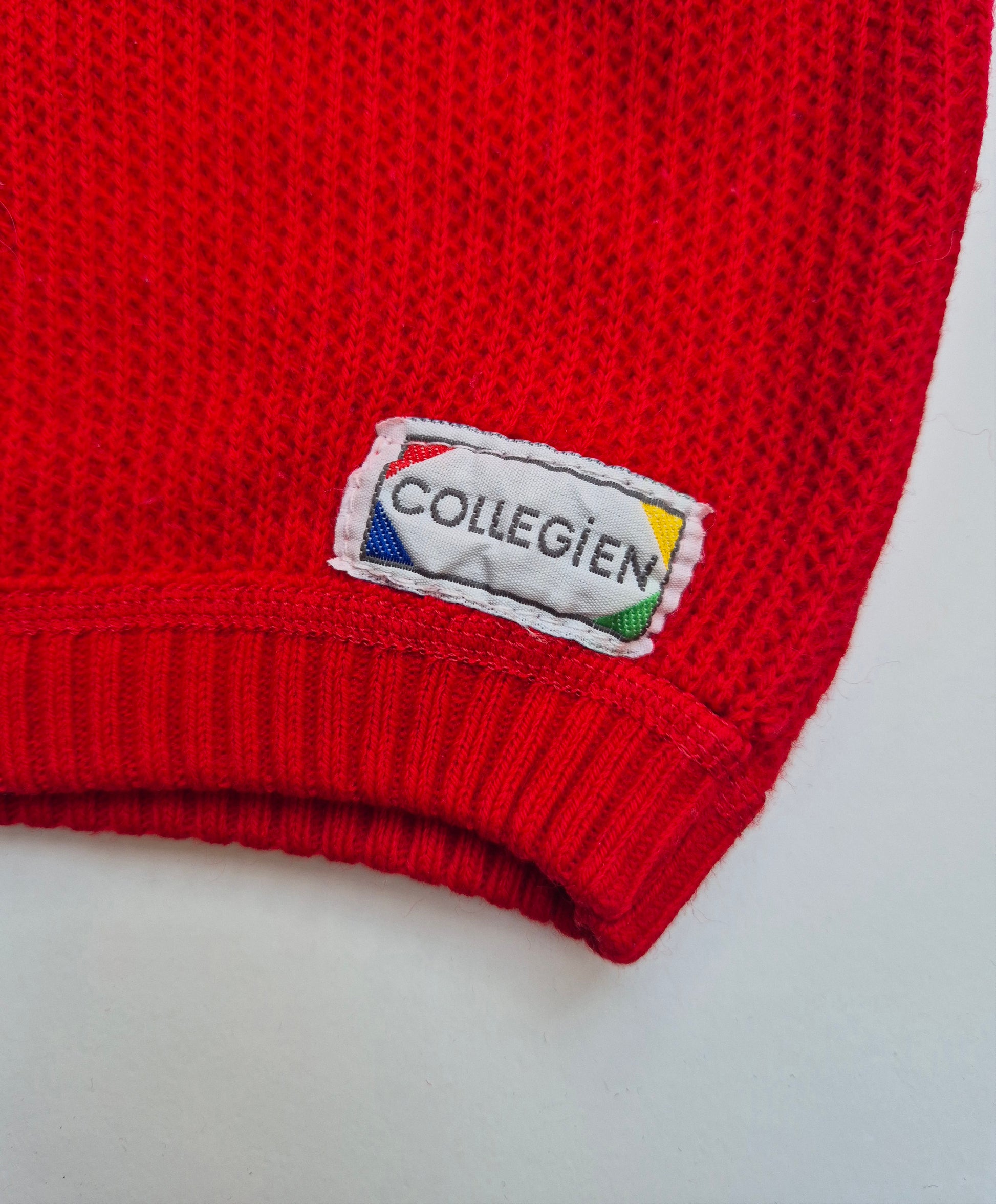 Felrode gebreide trui met donkerblauwe elleboogstukken. Warm, stoer en precies goed voor frisse dagen.