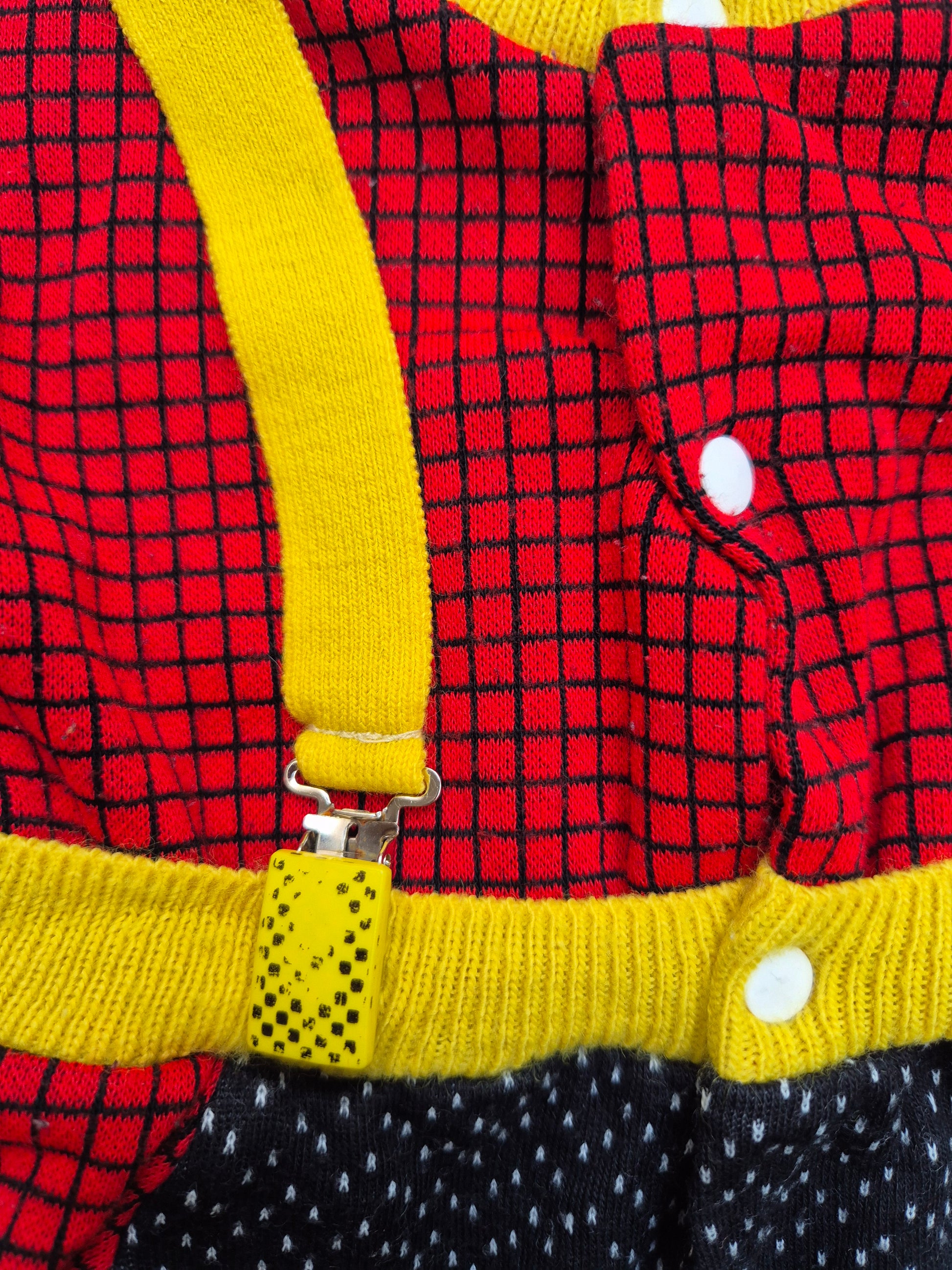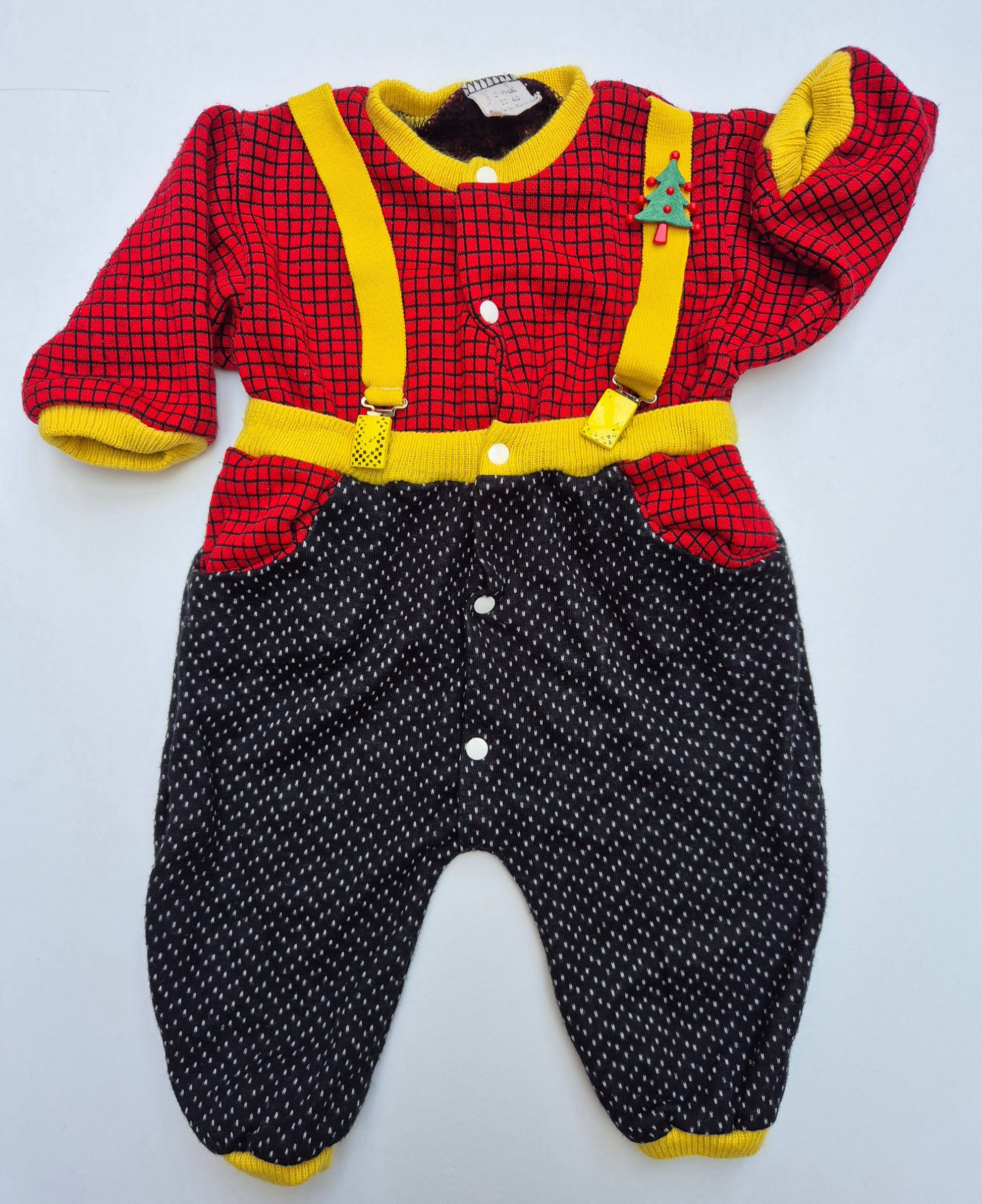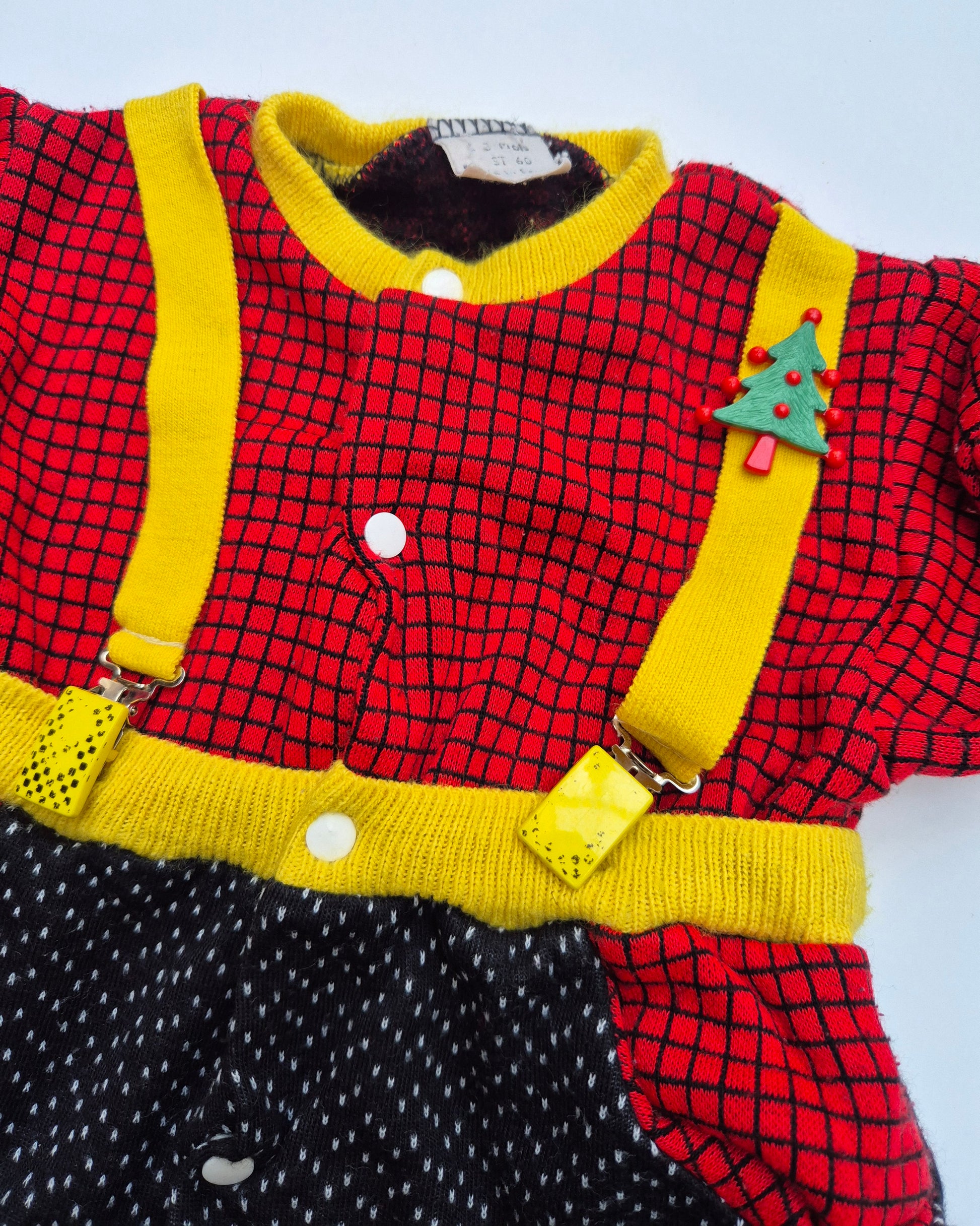 Uniek vintage boxpak met vrolijke kleuren en bretels. Zacht, warm en vol karakter, zelfs met mini kerstboompje op het borstje, wat een parel voor de kerst.