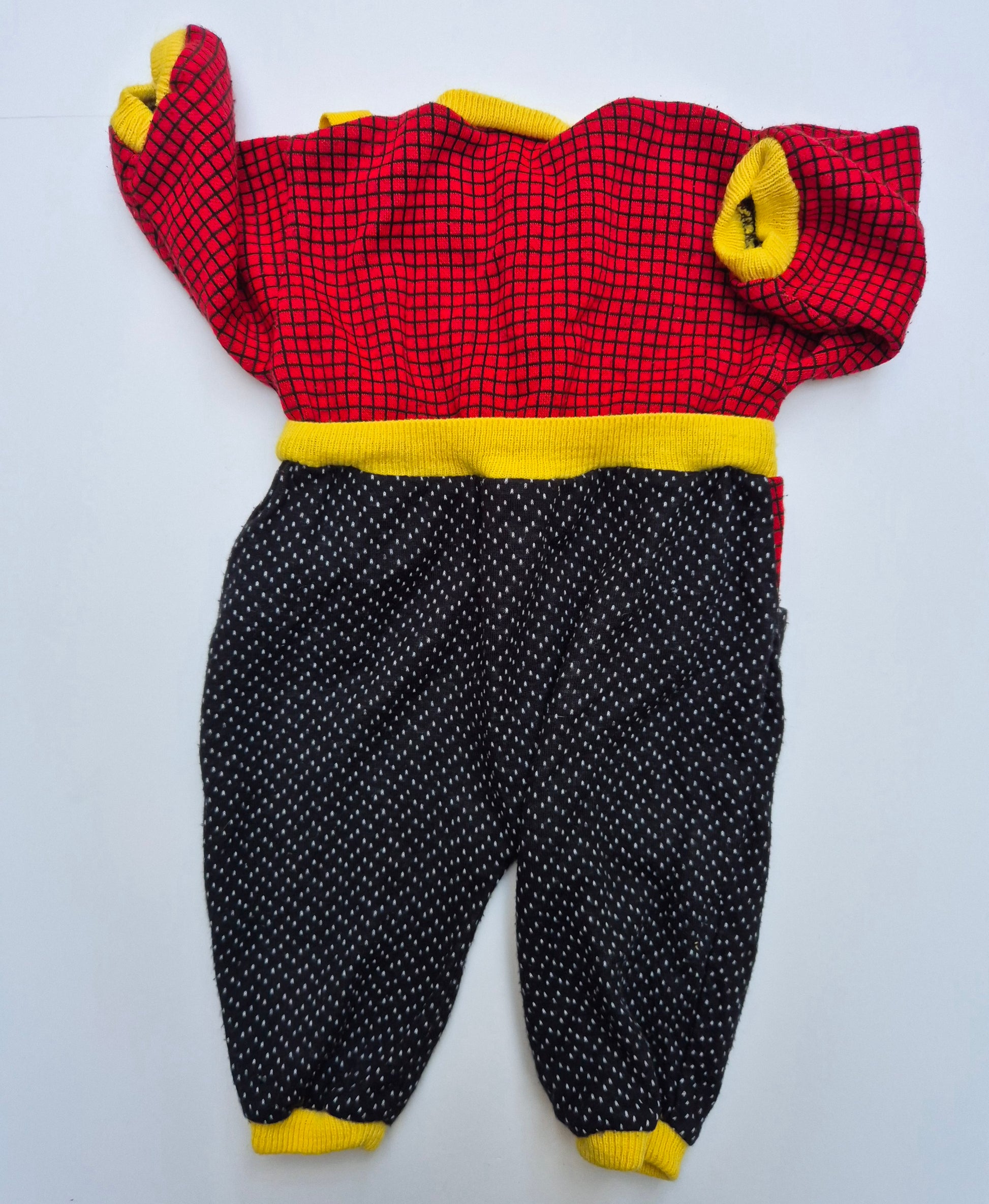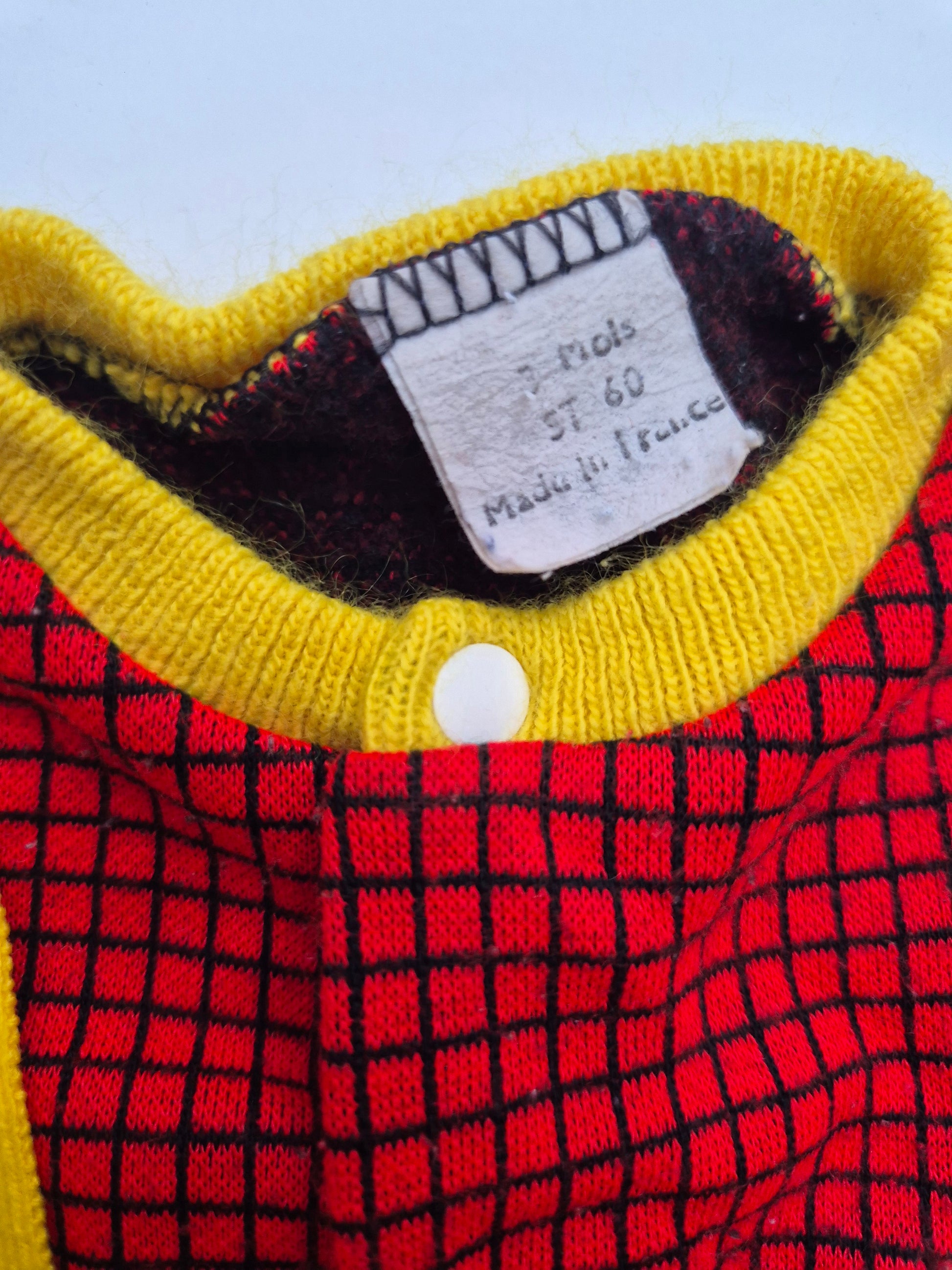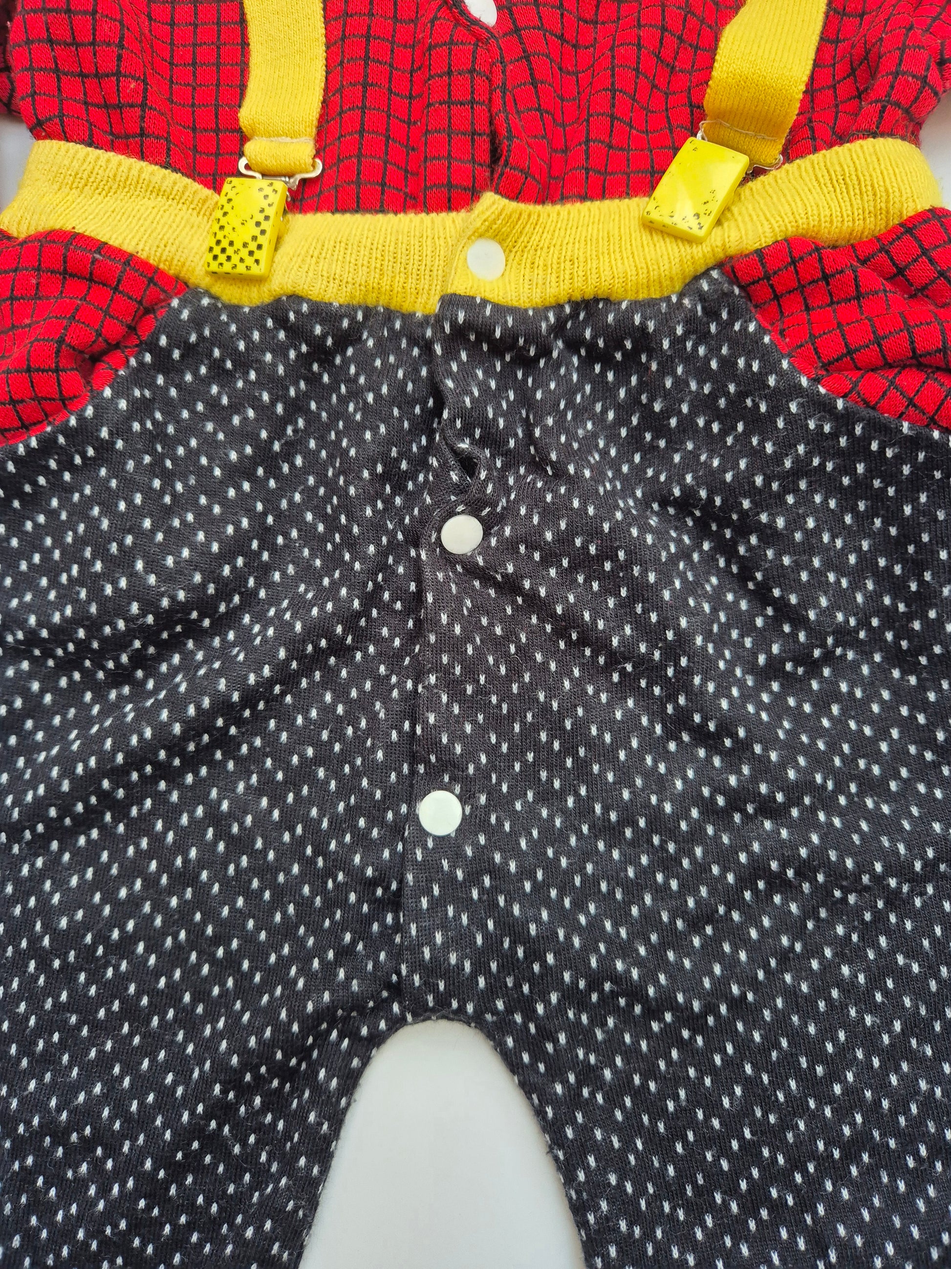 Uniek vintage boxpak met vrolijke kleuren en bretels. Zacht, warm en vol karakter, zelfs met mini kerstboompje op het borstje, wat een parel voor de kerst.