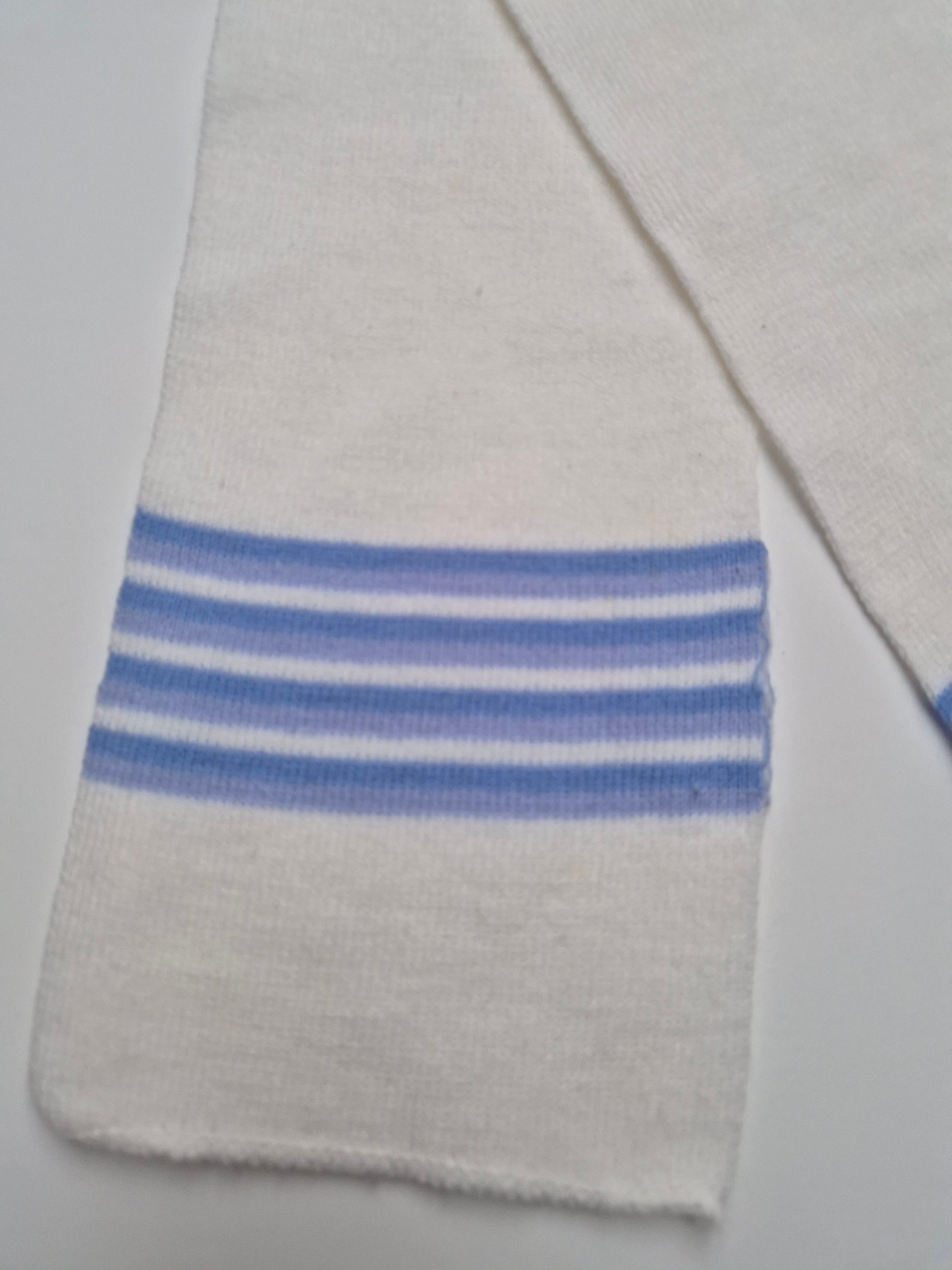 Witte vintage sjaal met sportieve strepen en een muis met voetbal. Lekker zacht en heerlijk eigenwijs.