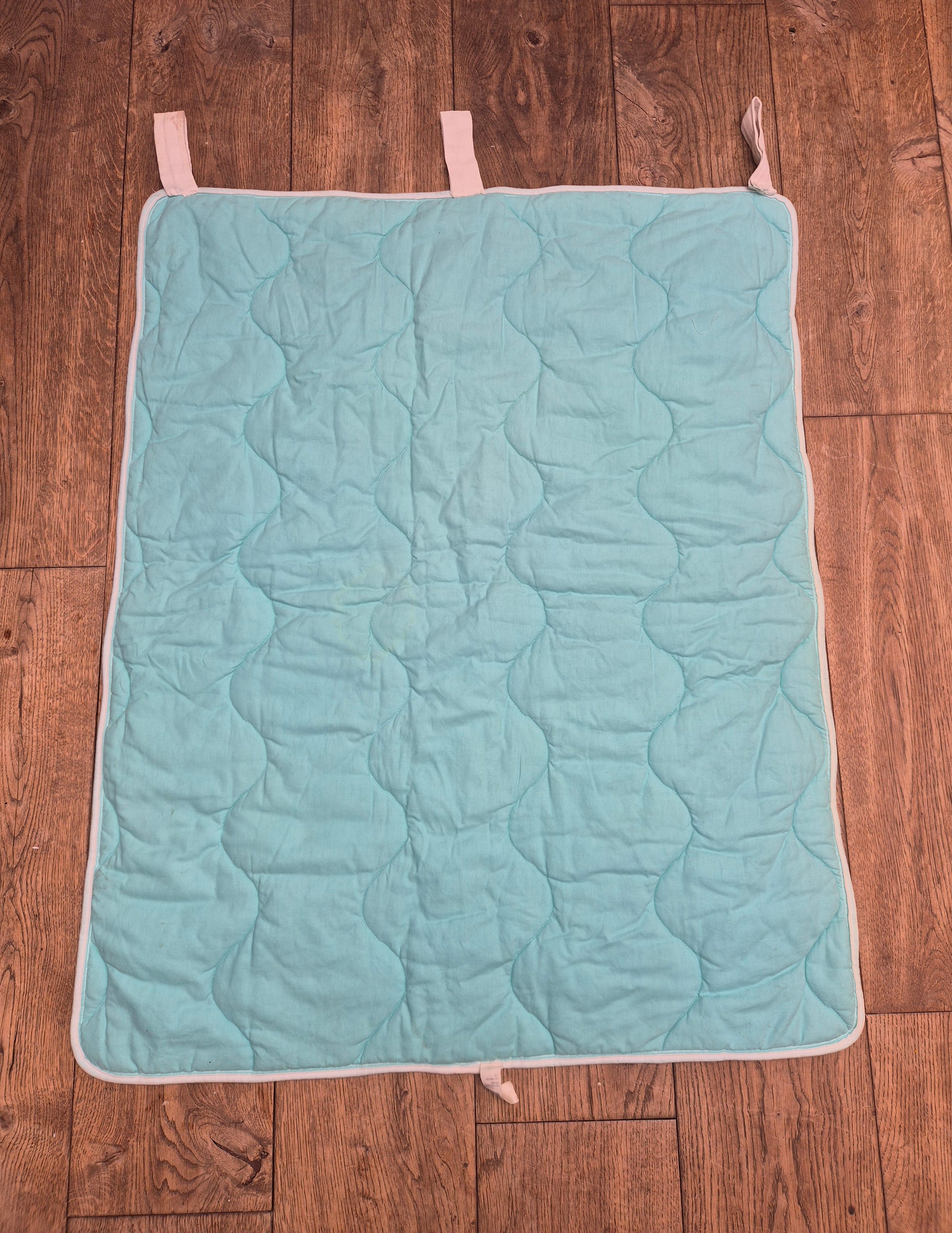 Zacht speelkleed met vrolijke illustratie van speelgoed in pastelkleuren. Ideaal als speelmat of decoratief kleedje in de kinderkamer.