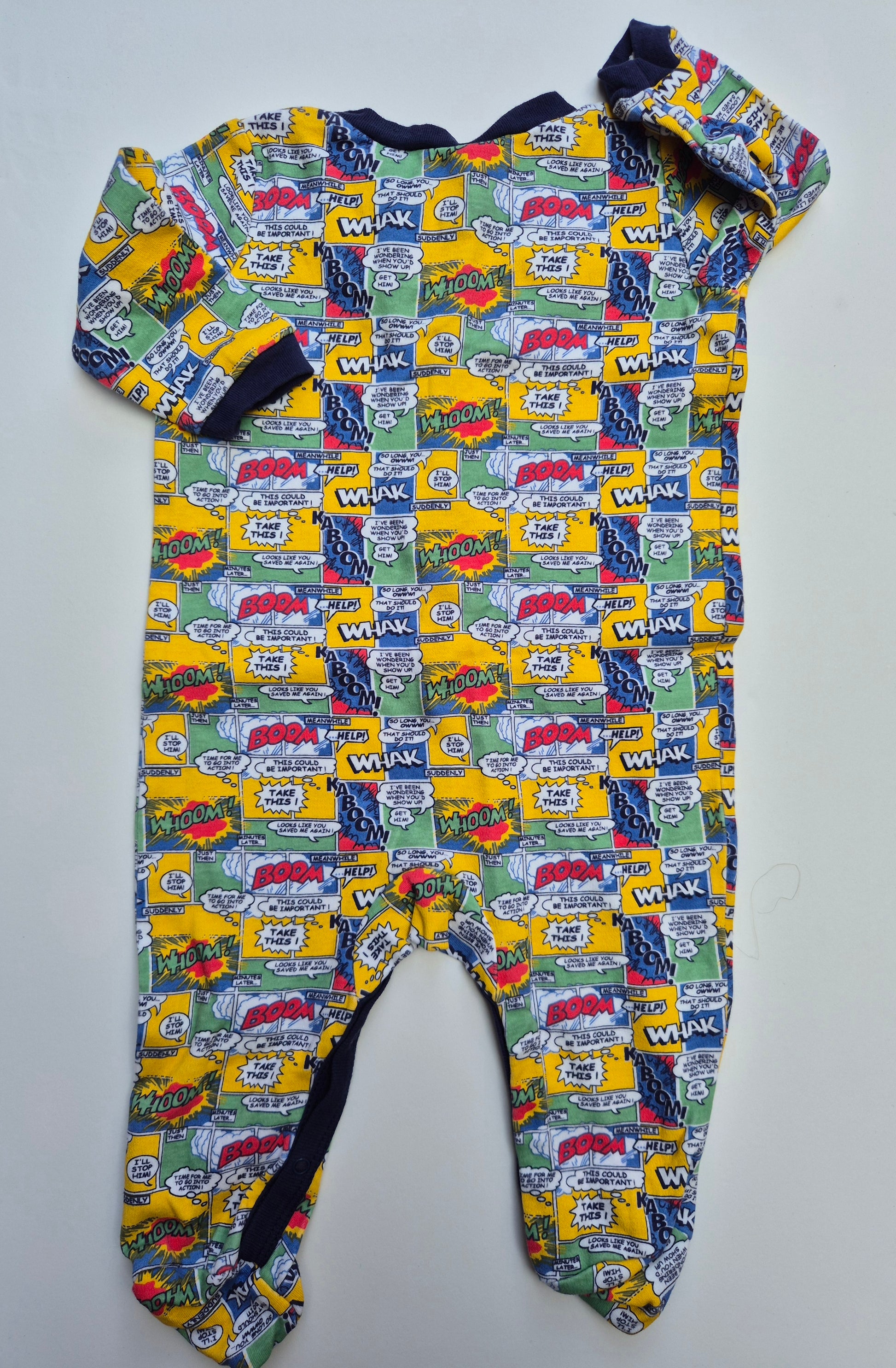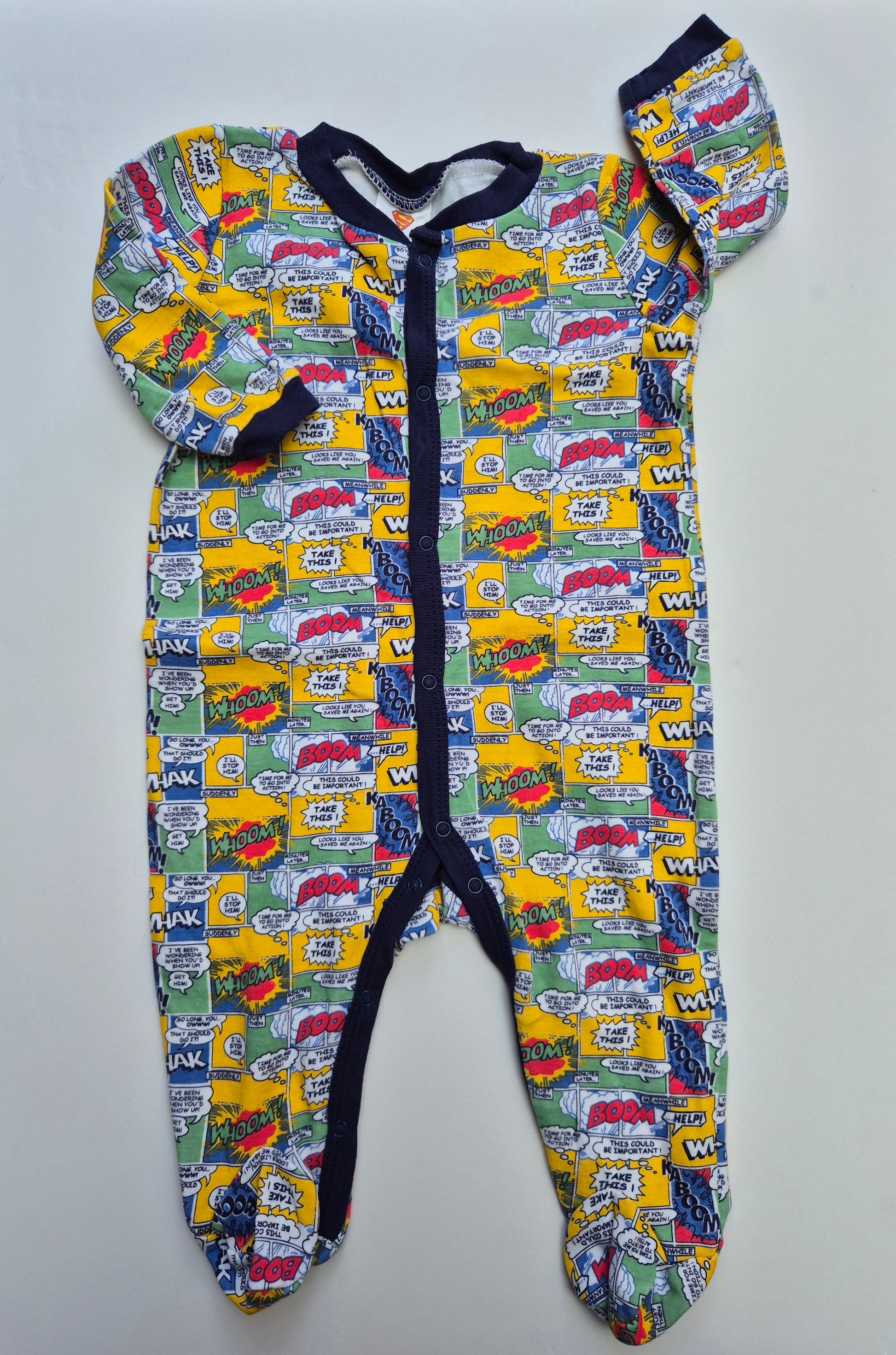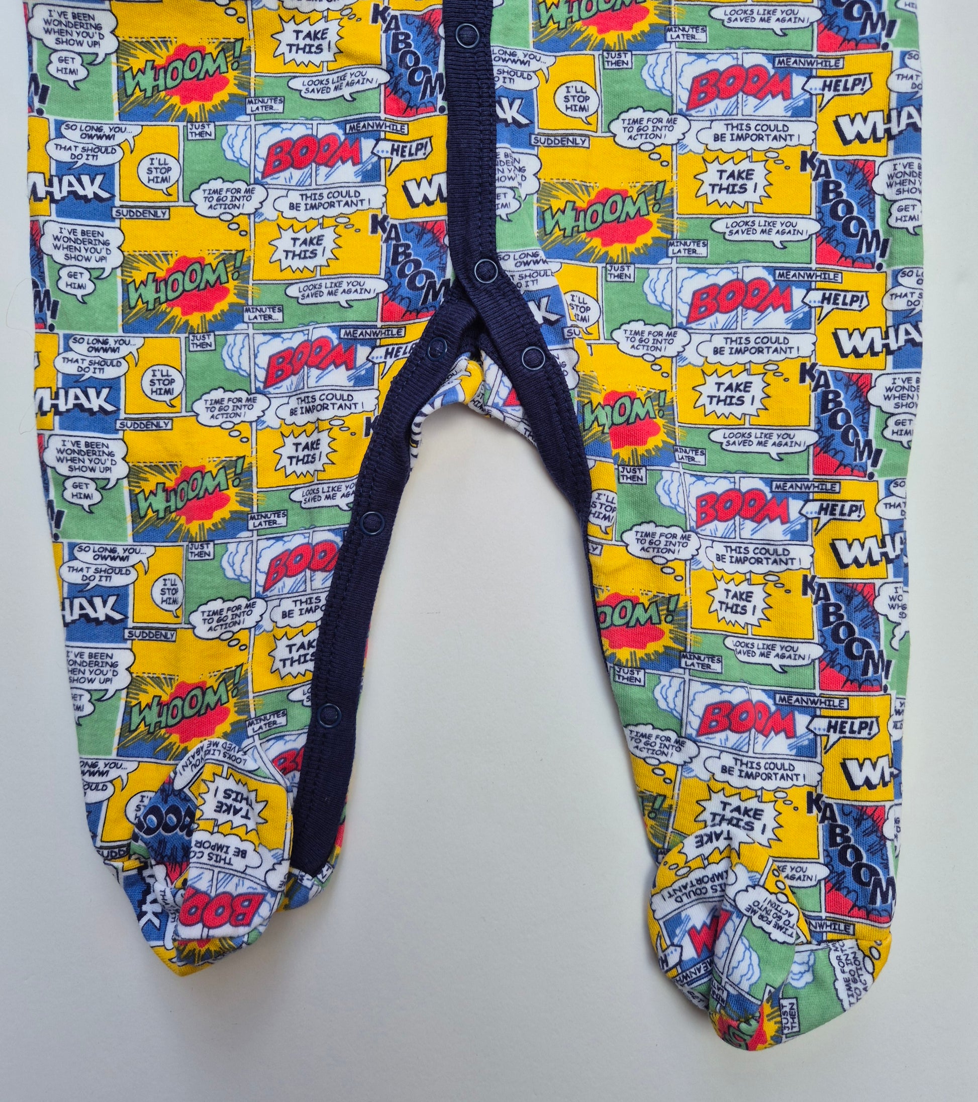 Speels pakje met all-over comic/stripprint van Superman. Met voetjes.