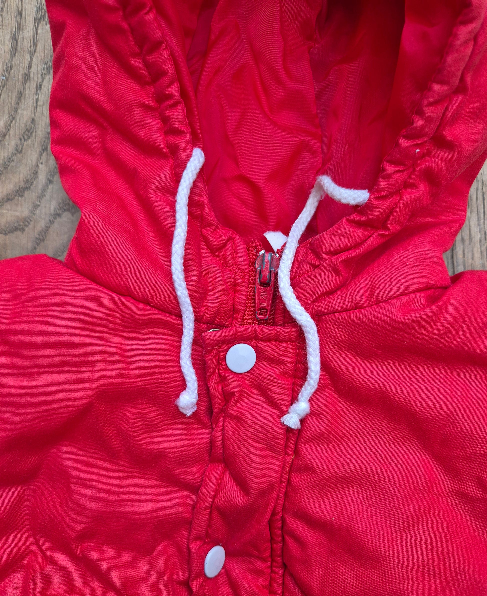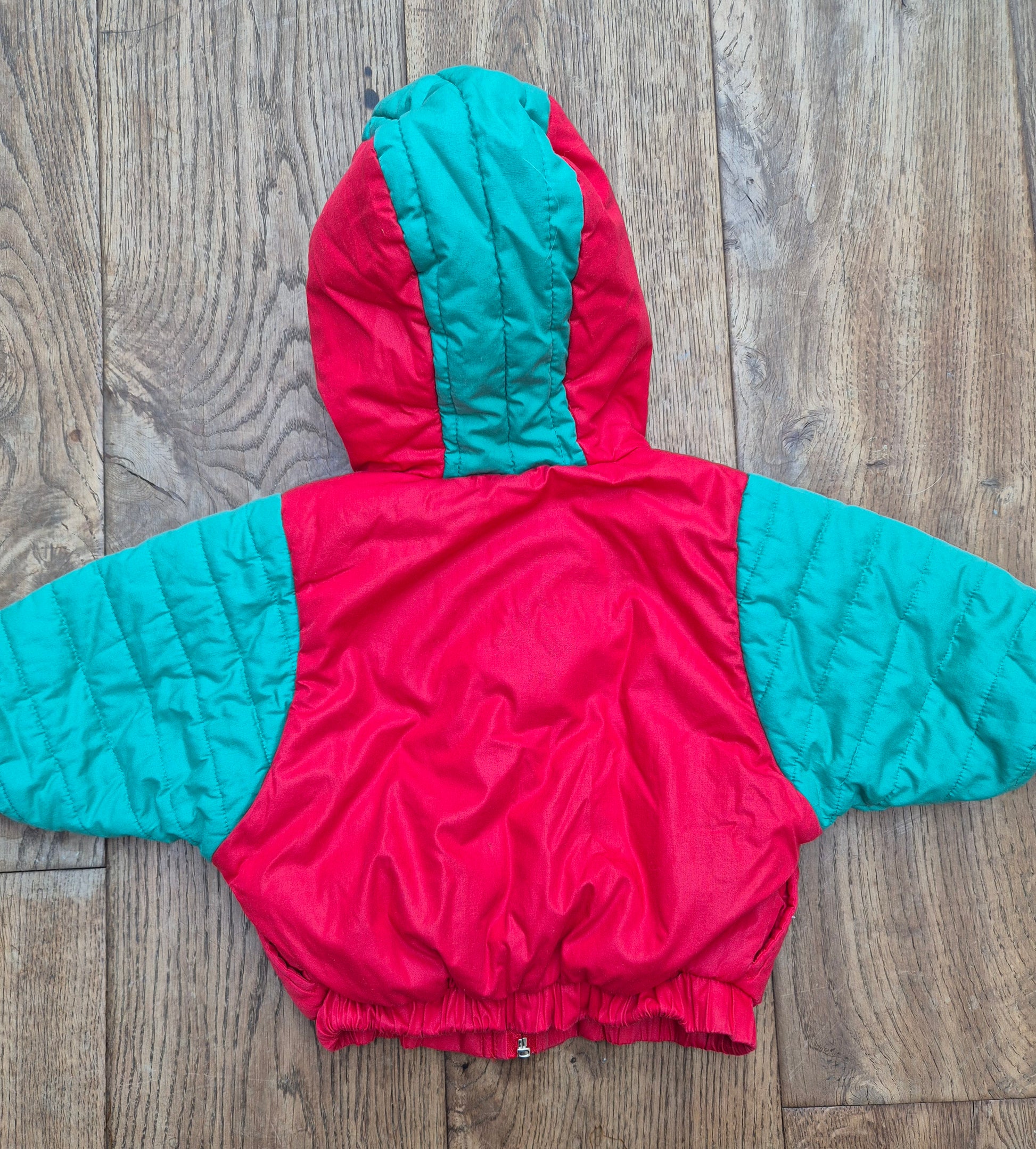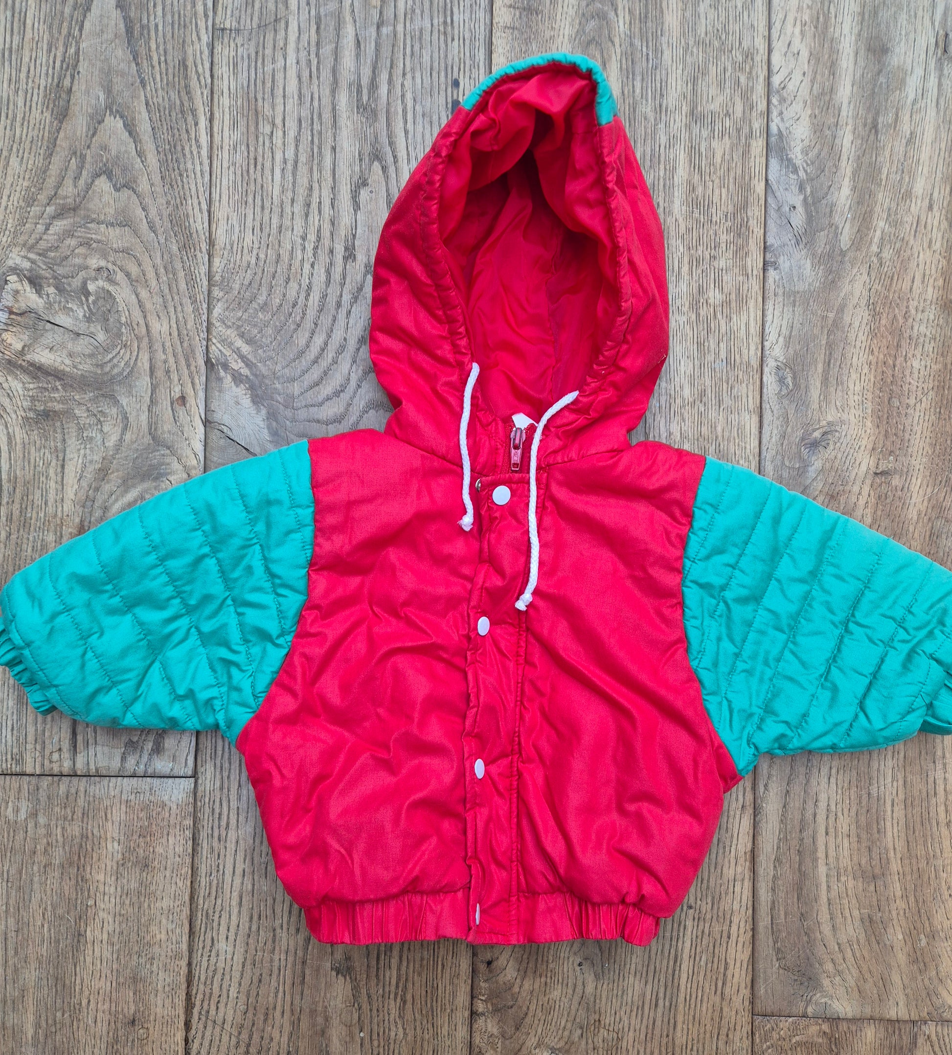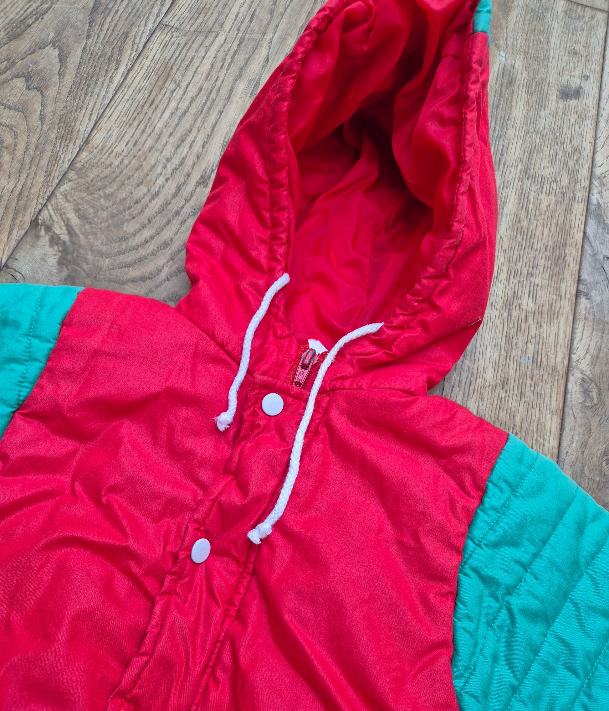 Opvallend vintage jasje met knalrode body en turquoise mouwen. Gevoerd, winddicht en met capuchon – klaar voor buitenpret.