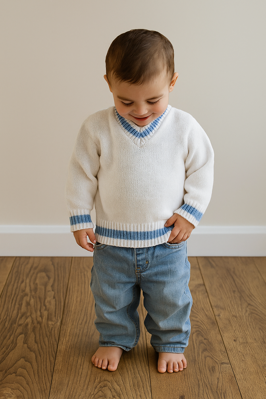 Een zachte, vintage knitted V hals trui in helder wit met blauwe strepen langs boord en mouwen. Retro tennis vibes in mini-formaat. Heerlijk zacht en super easy te combineren.