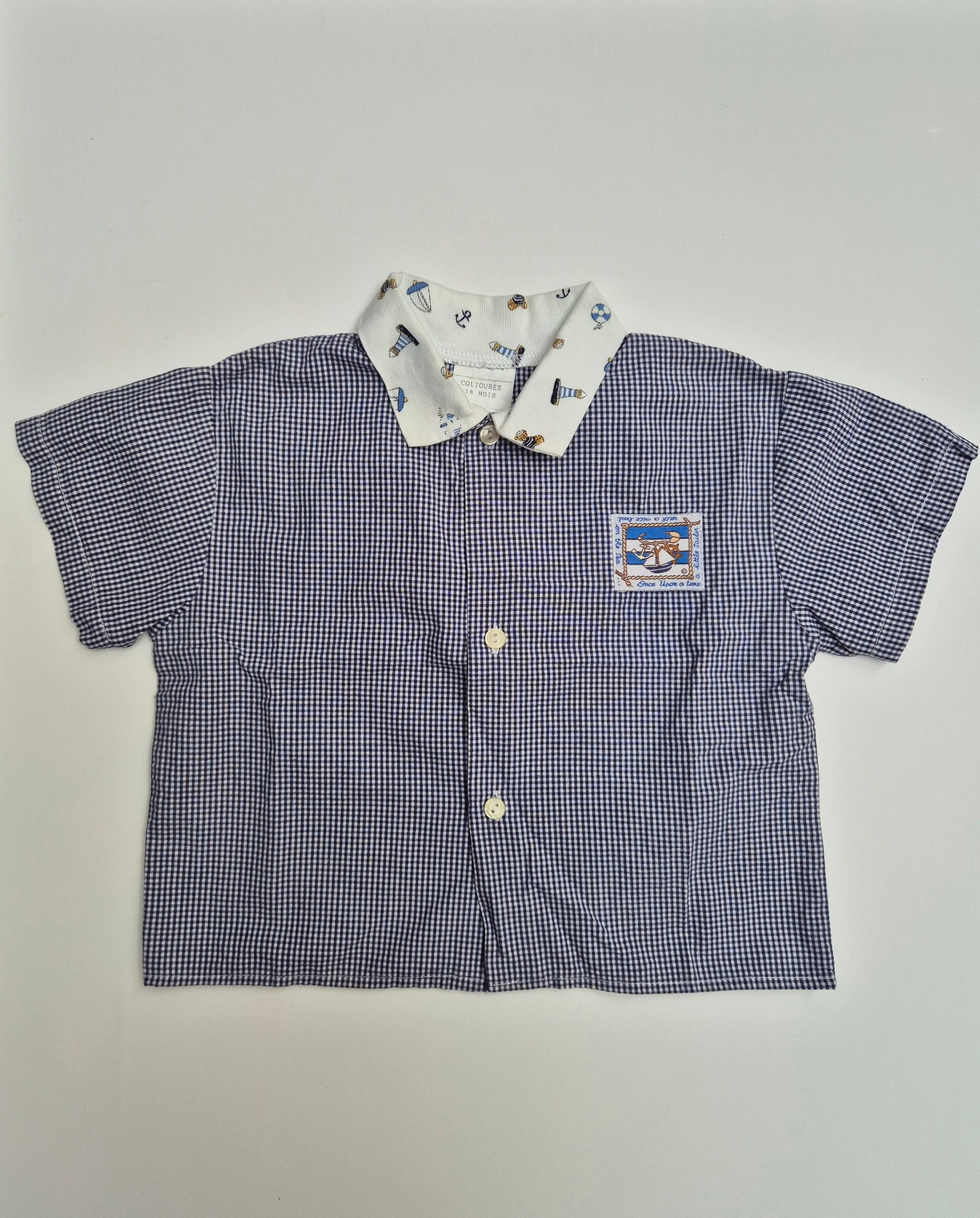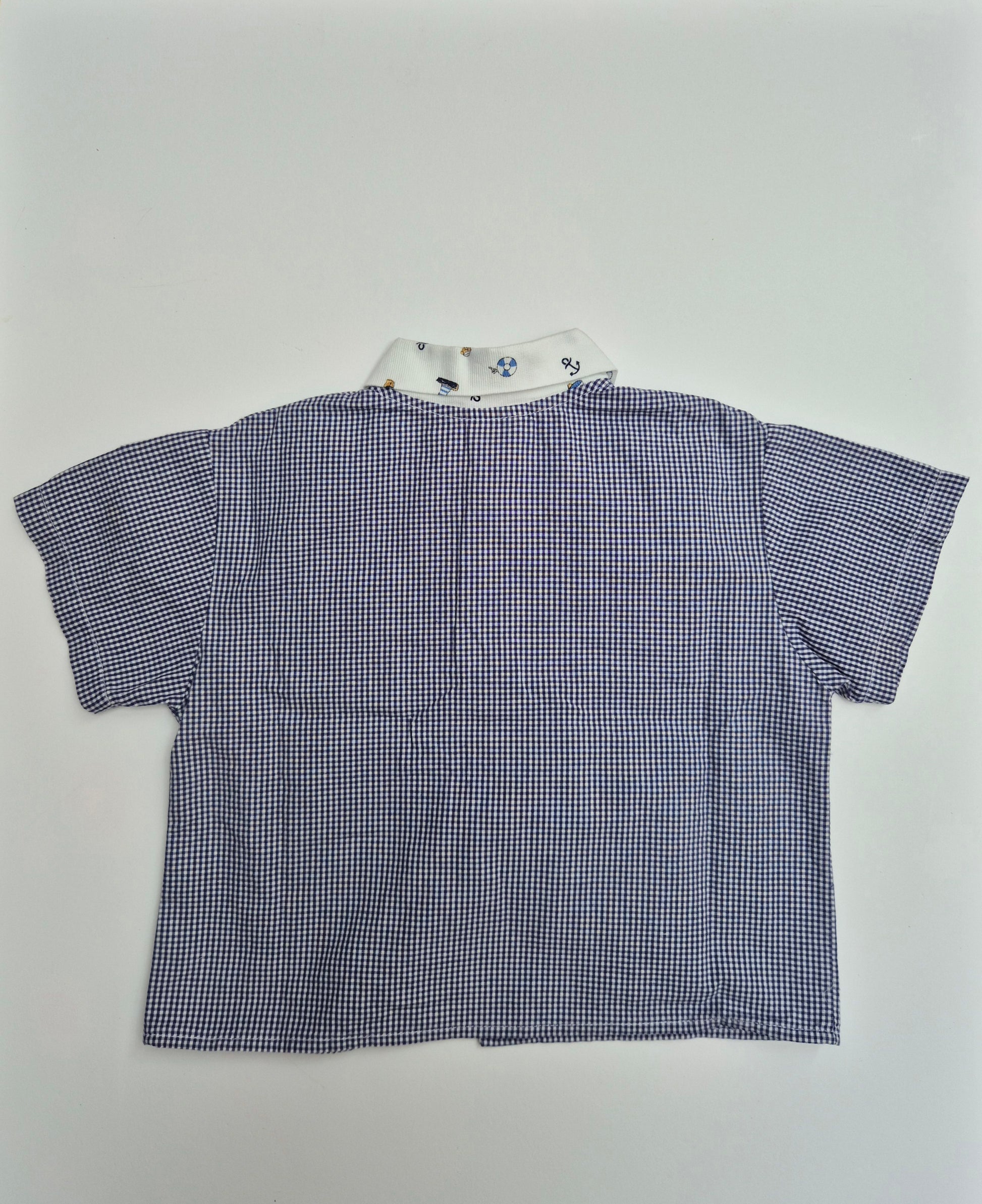 Donkerblauw geruit overhemd met zeethema in de kraag. Ankers, vuurtorens en scheepjes voor kleine kapiteins.