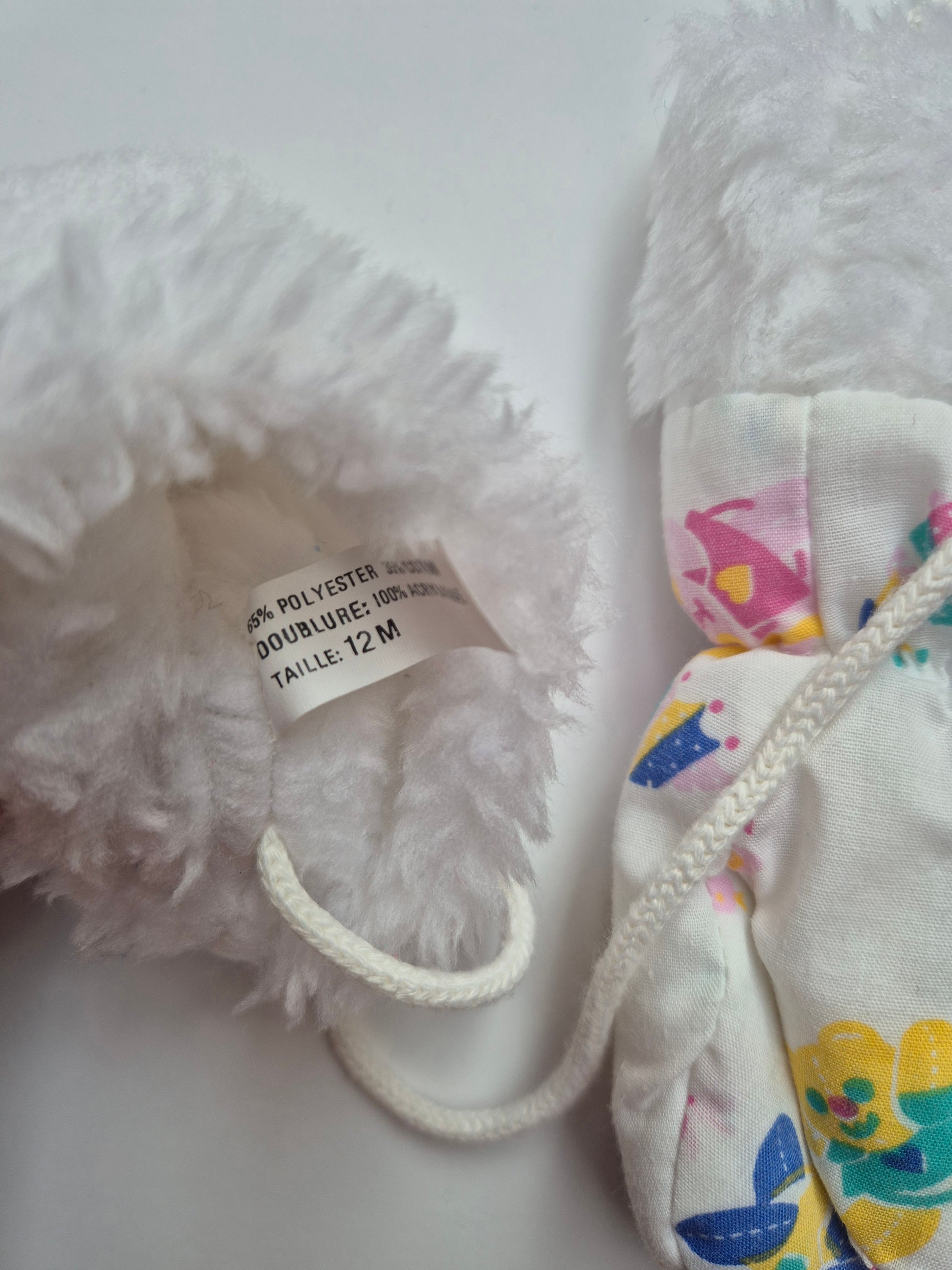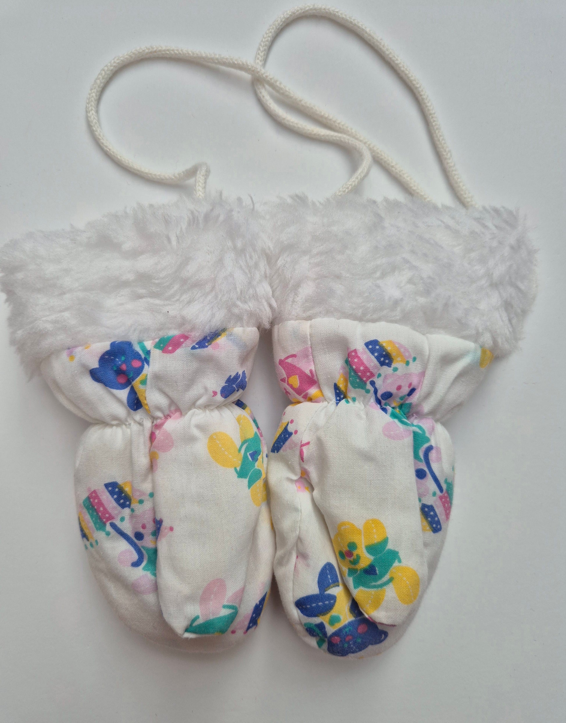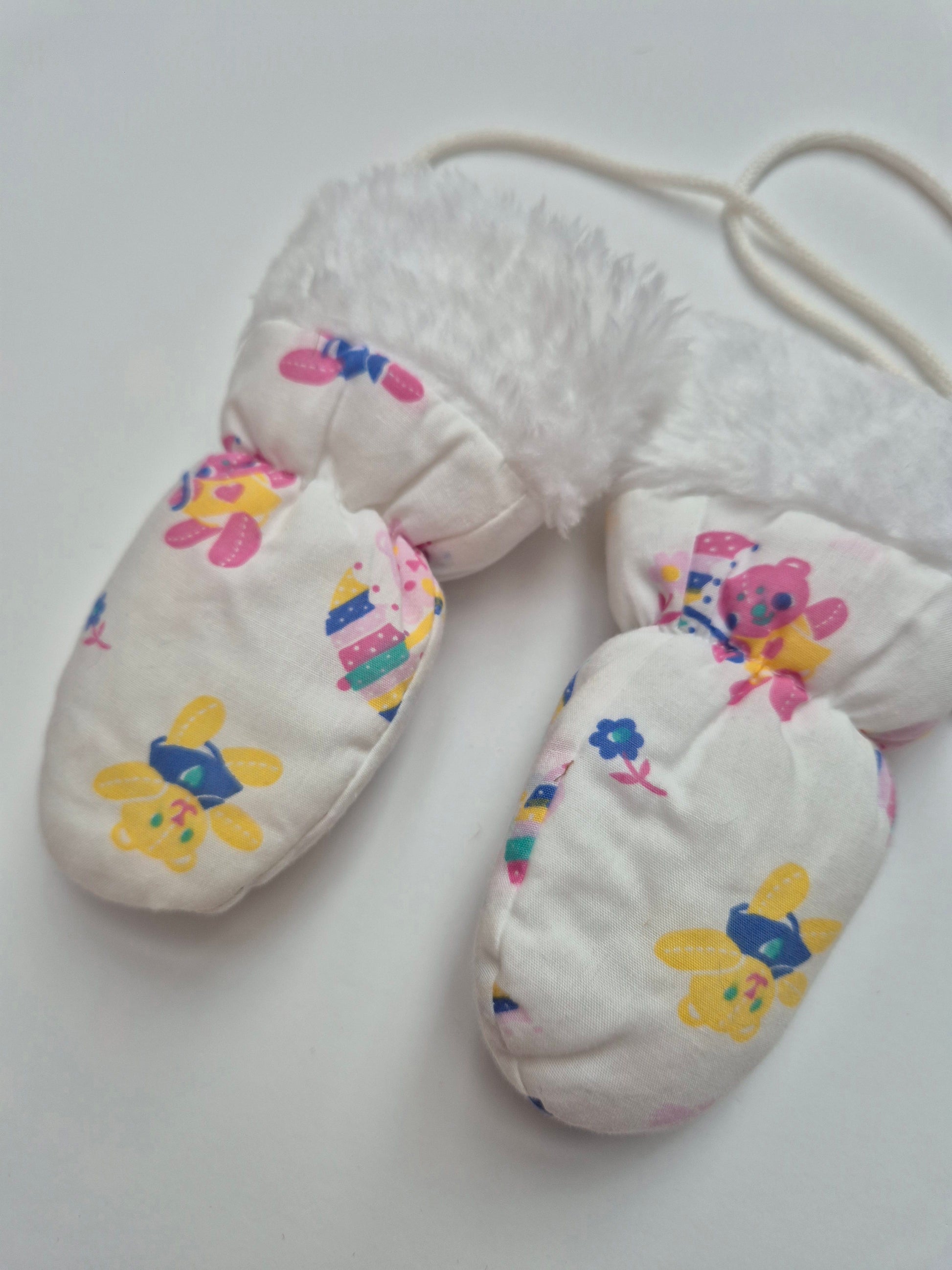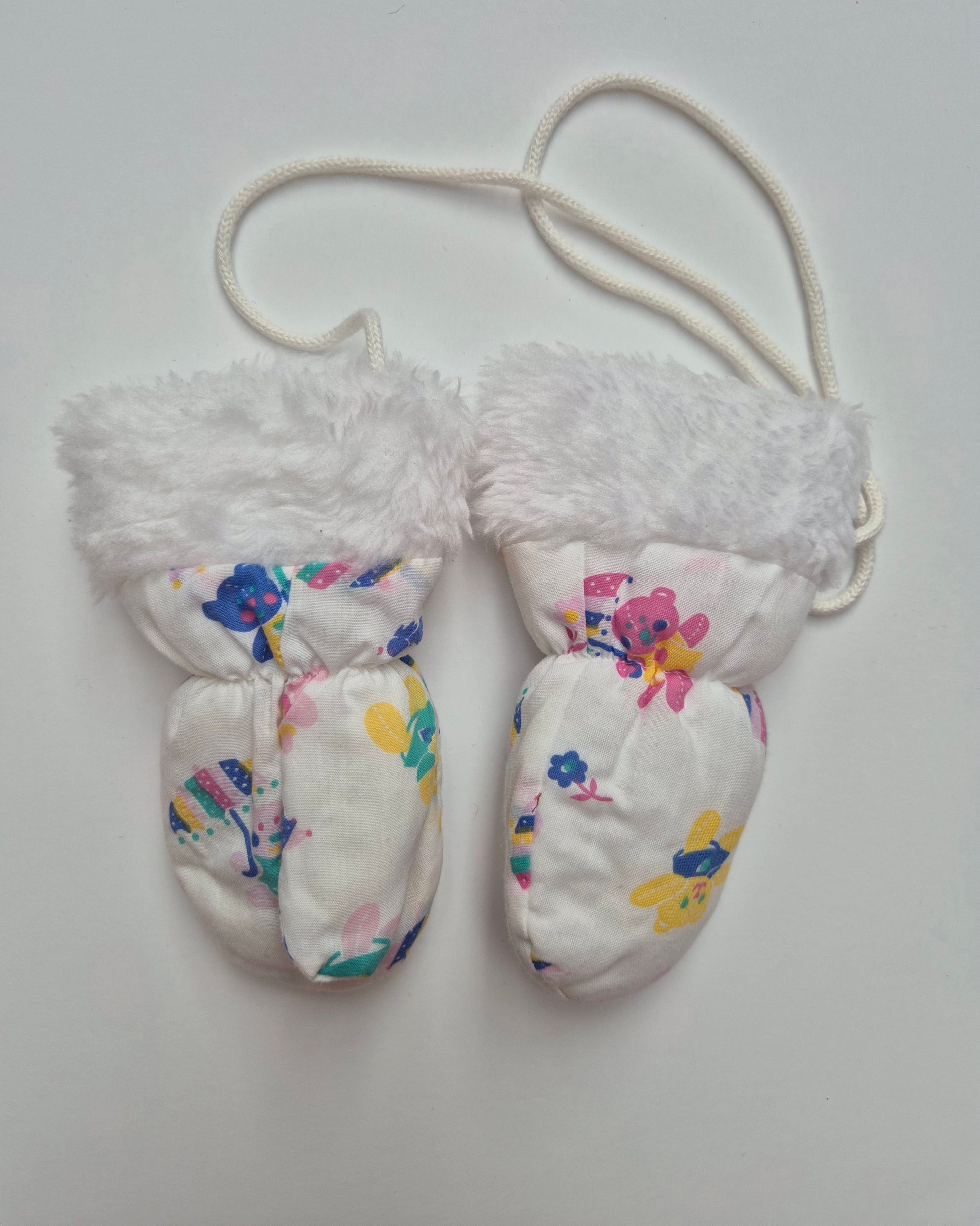 Zachte witte wantjes met bont randje en vrolijke print. Verbonden met een touwtje zodat ze niet kwijtraken. Nostalgisch en praktisch tegelijk, klaar voor winteravonturen.