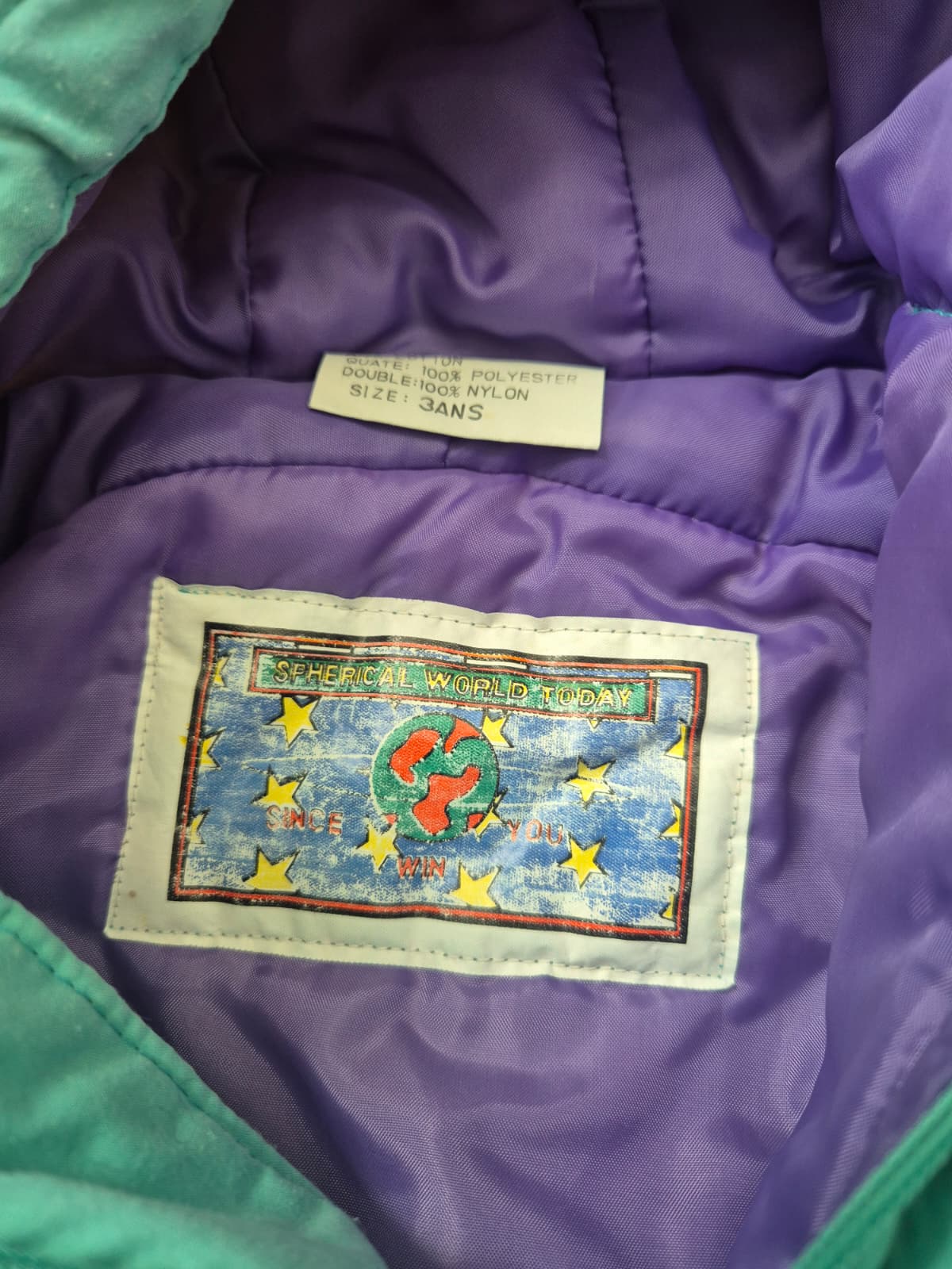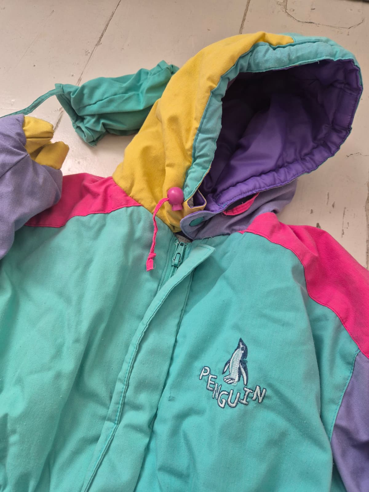 Opvallend vintage skipak in vrolijke kleuren. De mix van turquoise, paars, geel en roze maakt dit een echte 90s klassieker. Zacht gevoerd, met wantjes die weg kunnen worden gestopt in een rits in de mouw. Perfect voor sneeuwpret of koude winterdagen buiten.