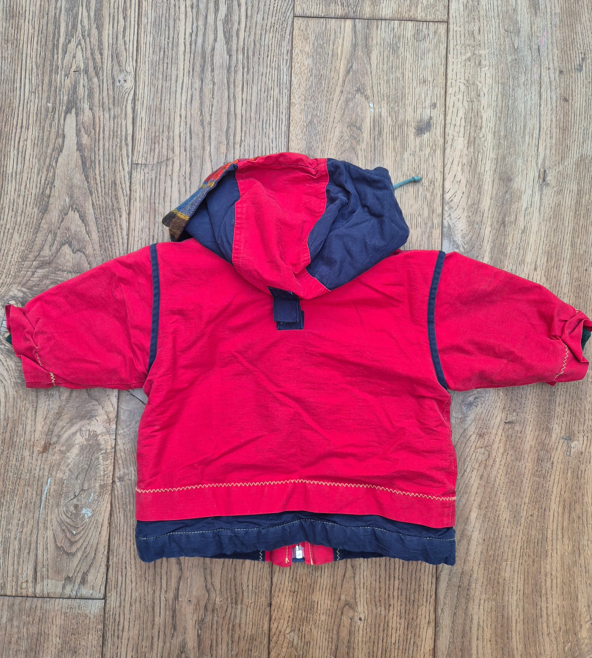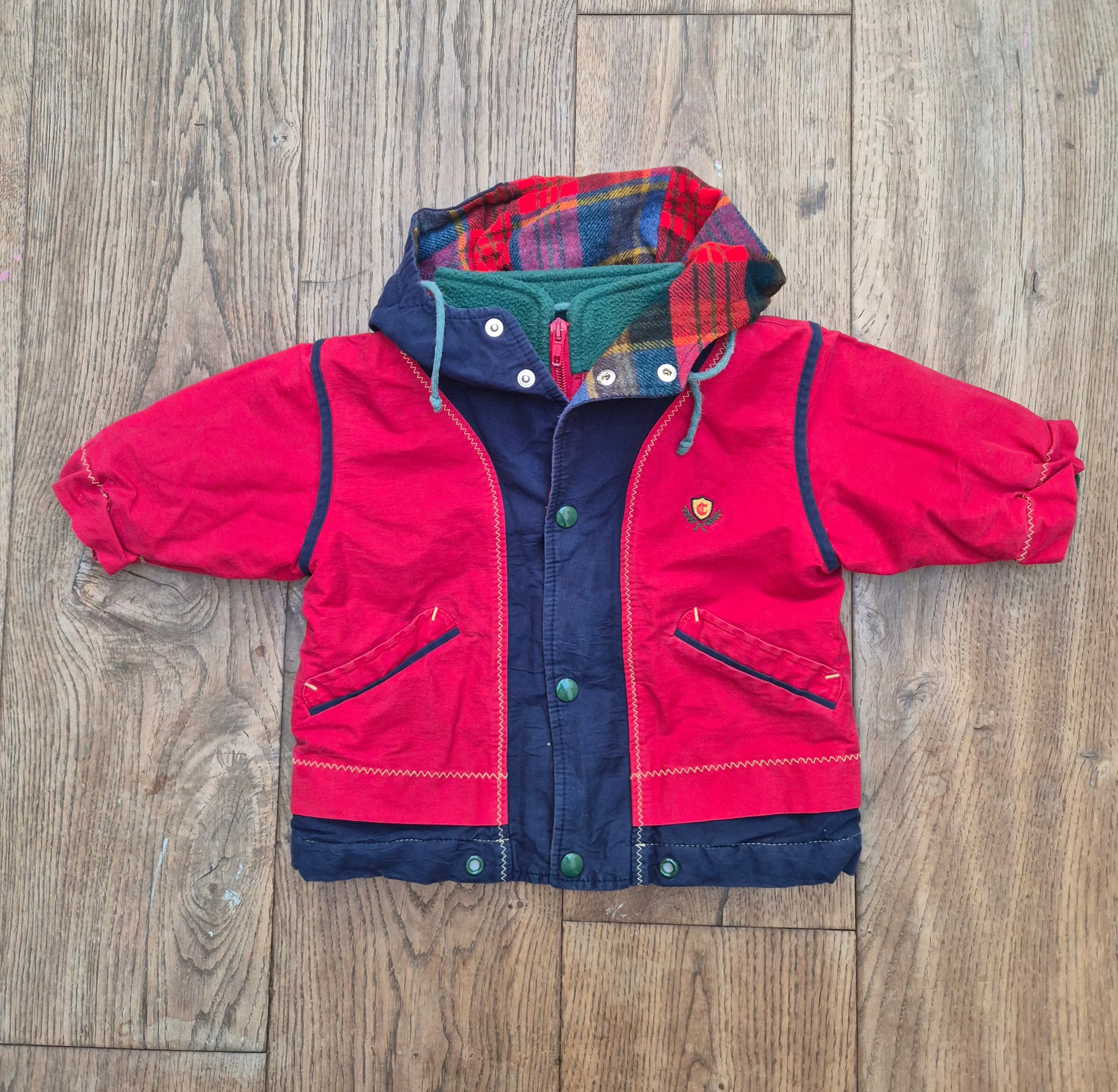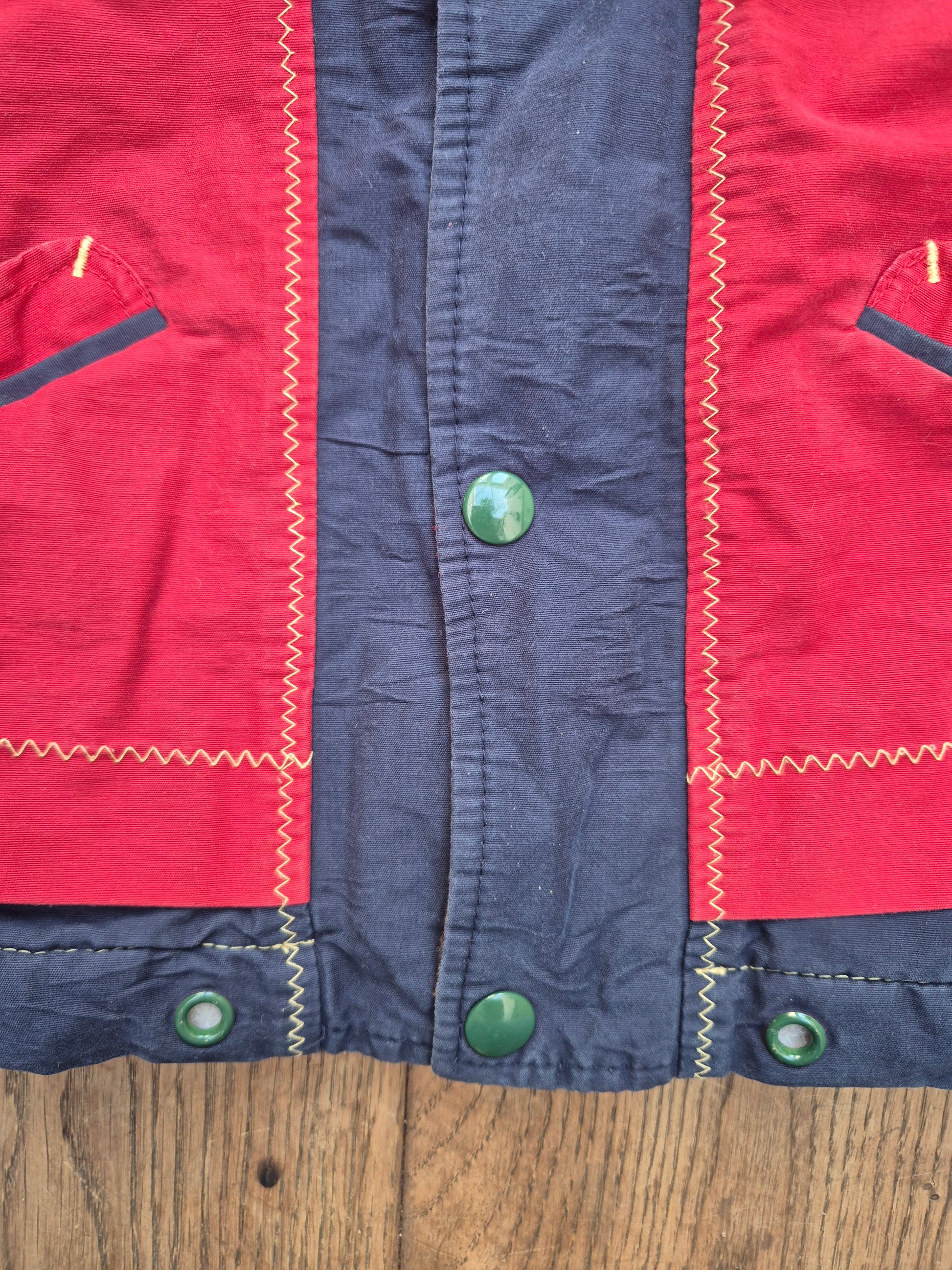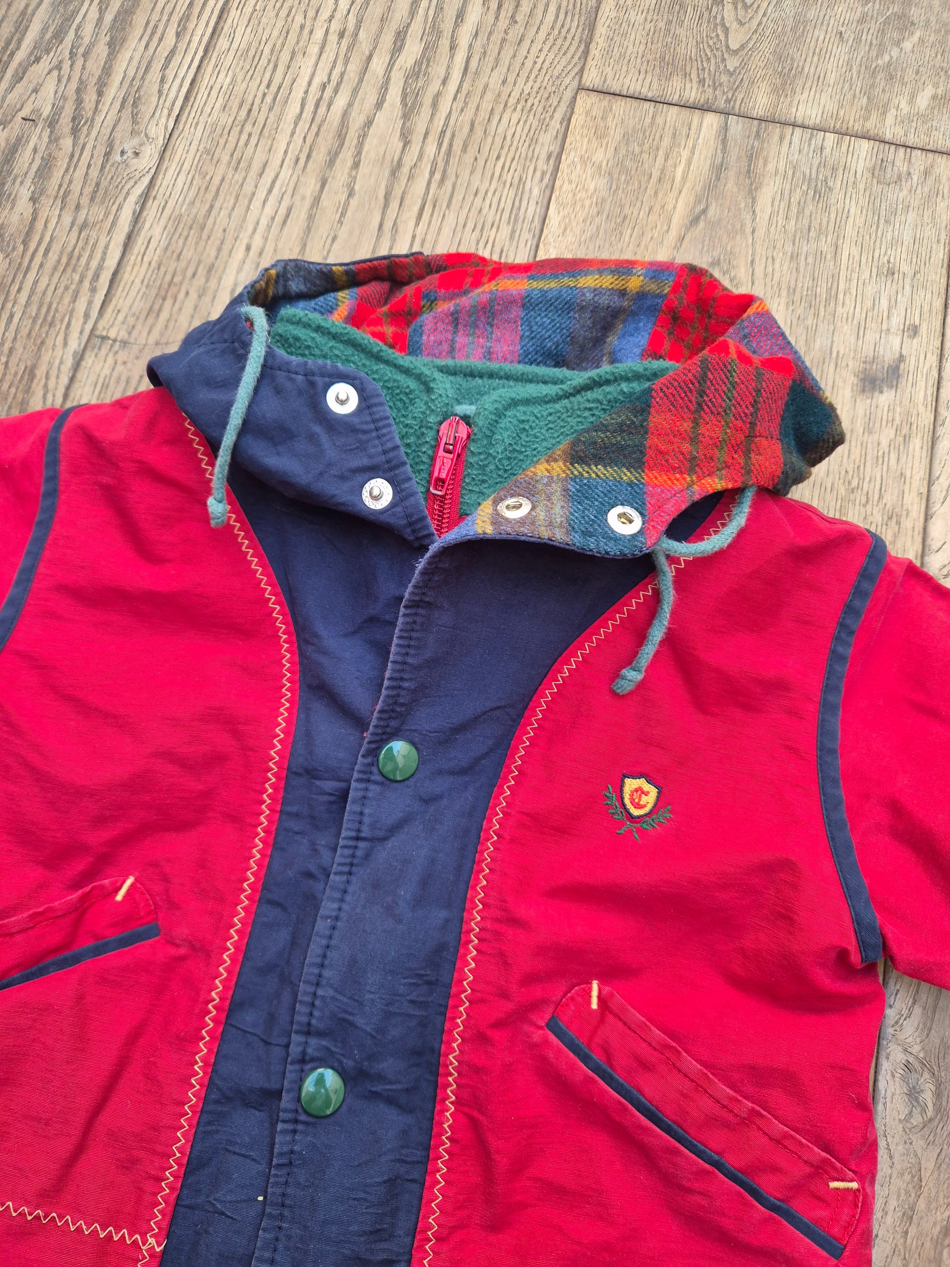 Helemaal in de kerstsfeer, een typische 80’s jas in rood en navy, met fleece binnenkant en geruite capuchonvoering. Lekker warm, met toffe details als contrasterende stiksels en drukknoopsluiting.